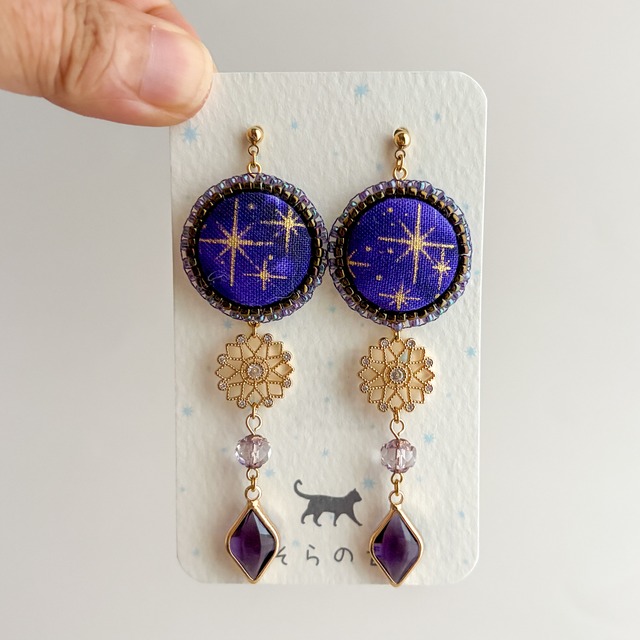 【金襴】星梅鉢のくるみボタンの耳飾り(紫)