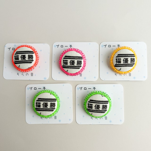 「猫優勝」のブローチです。 周りのビーズをネオンカラーにした事で過去一で派手な作品となりました。 猫好きの皆さんにぜひ鞄にも洋服にも付けて頂きたい作品です。 ☆━━━━━━━━━━━━━━━━━━━☆ 「3㎝×3㎝の世界」をコンセプトにくるみボタンでアクセサリーを作っております。 大ぶりに見えてとても軽く着け心地にもこだわって制作しております。 ☆━━━━━━━━━━━━━━━━━━━☆ ◆サイズ 約3.5㎝ (くるみボタン部分) ◆裏側について 裏側はフェルト+合皮シール。 縁取りの部分は手縫い糸を使用してます。 ◆売り切れの場合。 追加の作成予定あり。 (布が手に入らなくなったら終了) ご購入時の注意点 https://soranooto.base.ec/p/00001