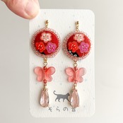 くるみボタンは他の作品に比べると派手ではないのですが、蝶のビーズとピンクのチャームで落ち着いた色なのに華やかさがあるピアスになりました。
