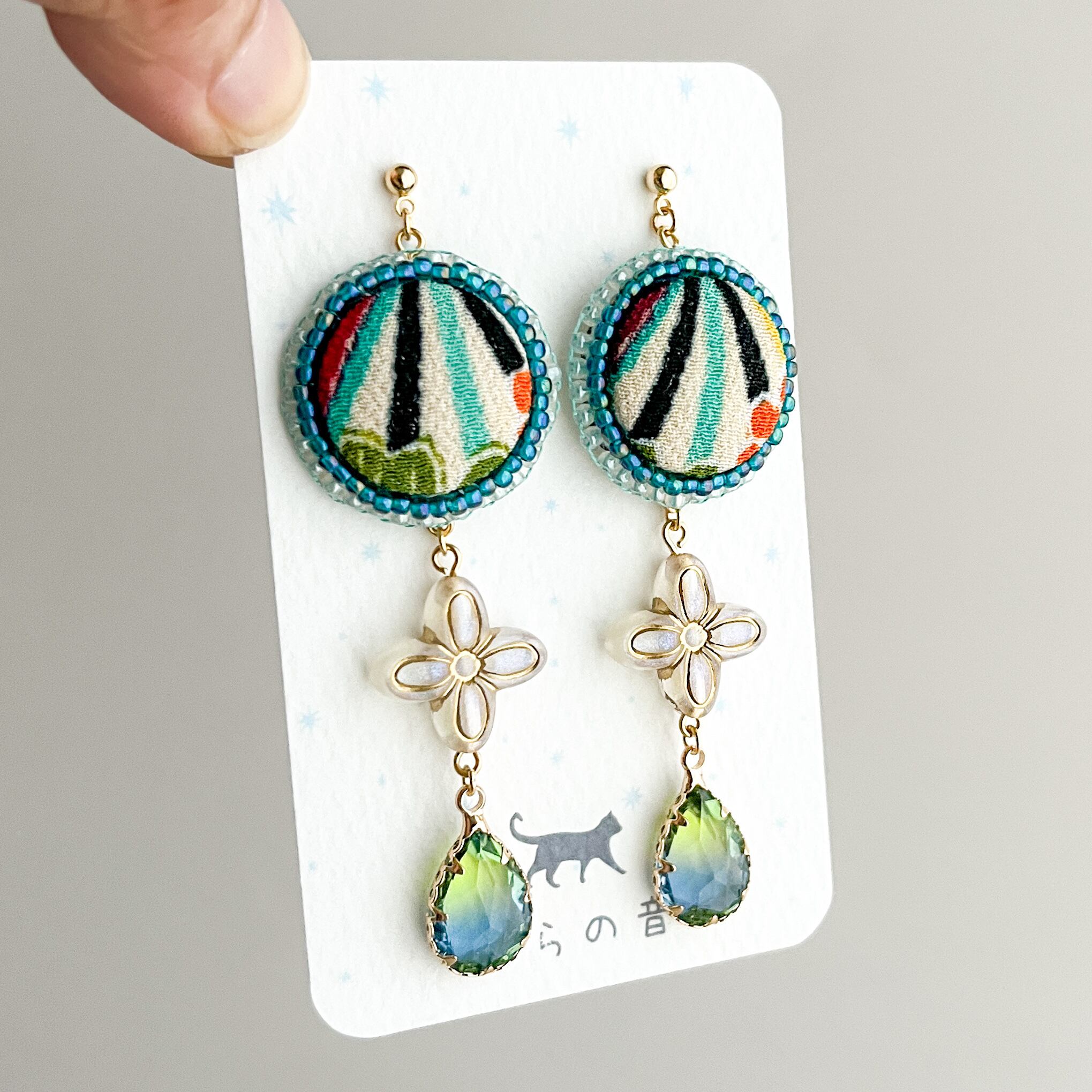 一番下のチャームが緑からブルーへのグラデーションがとても綺麗な作品です。