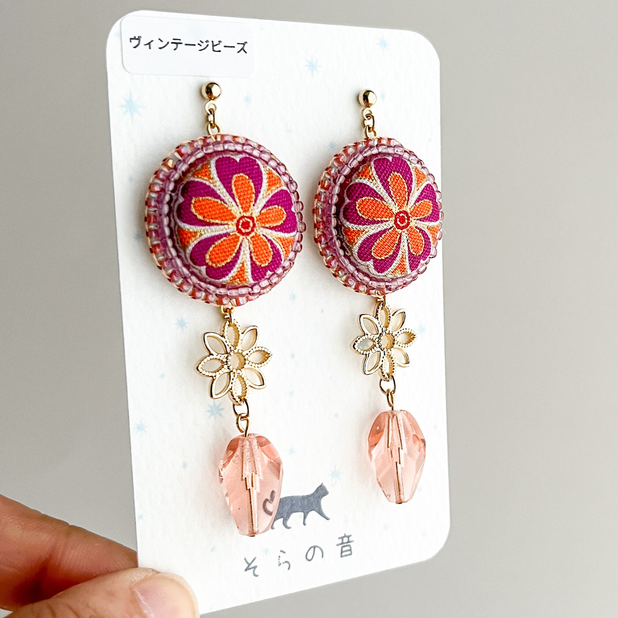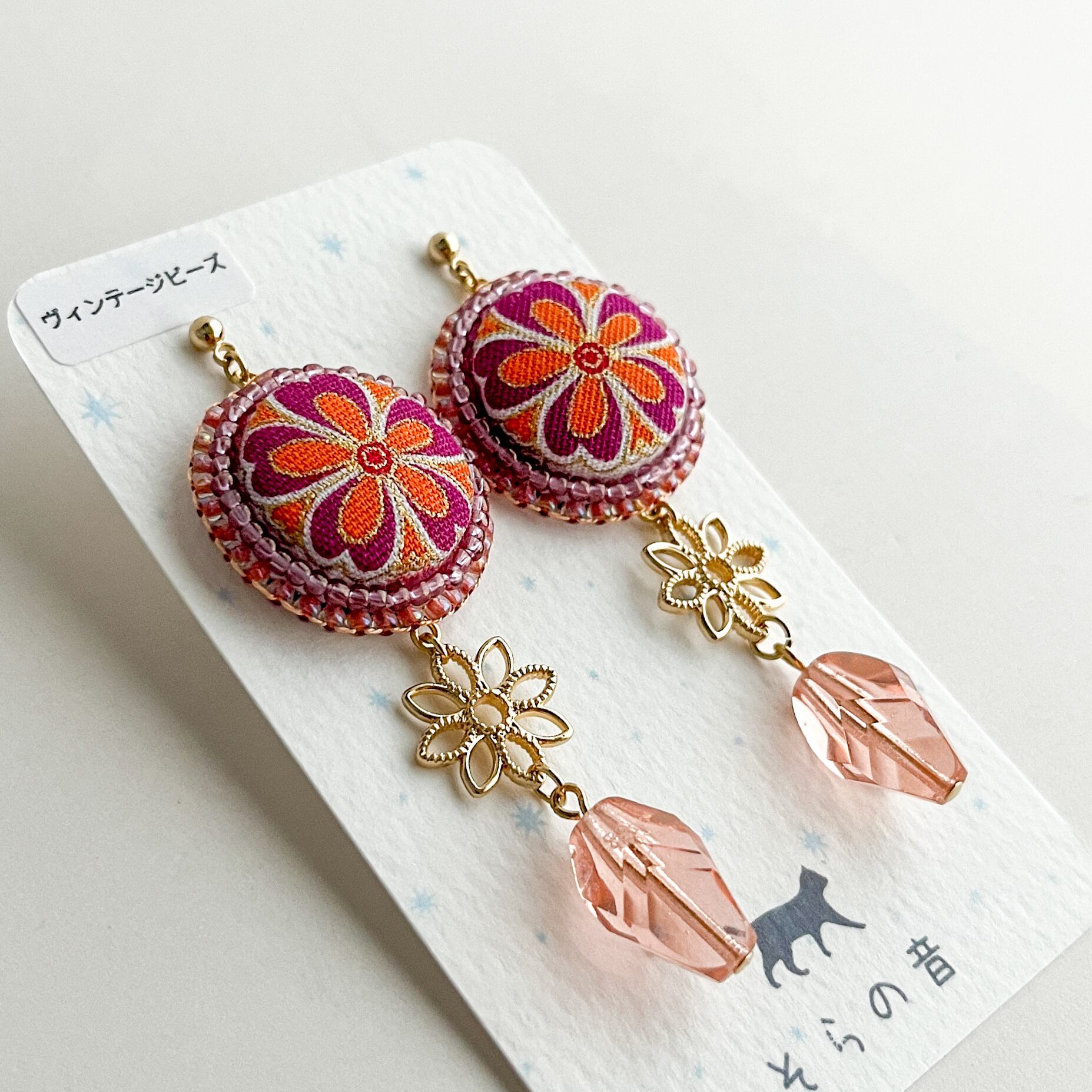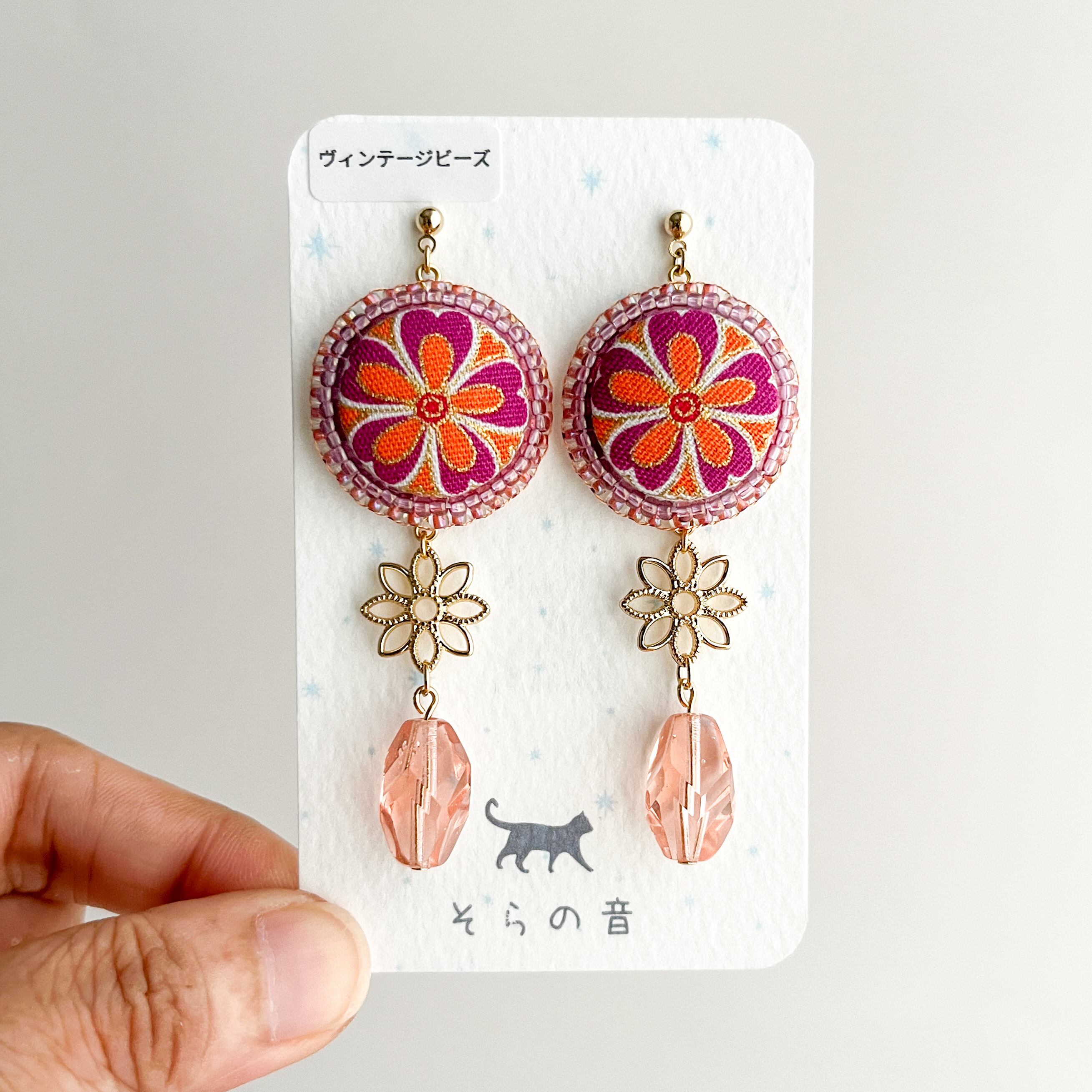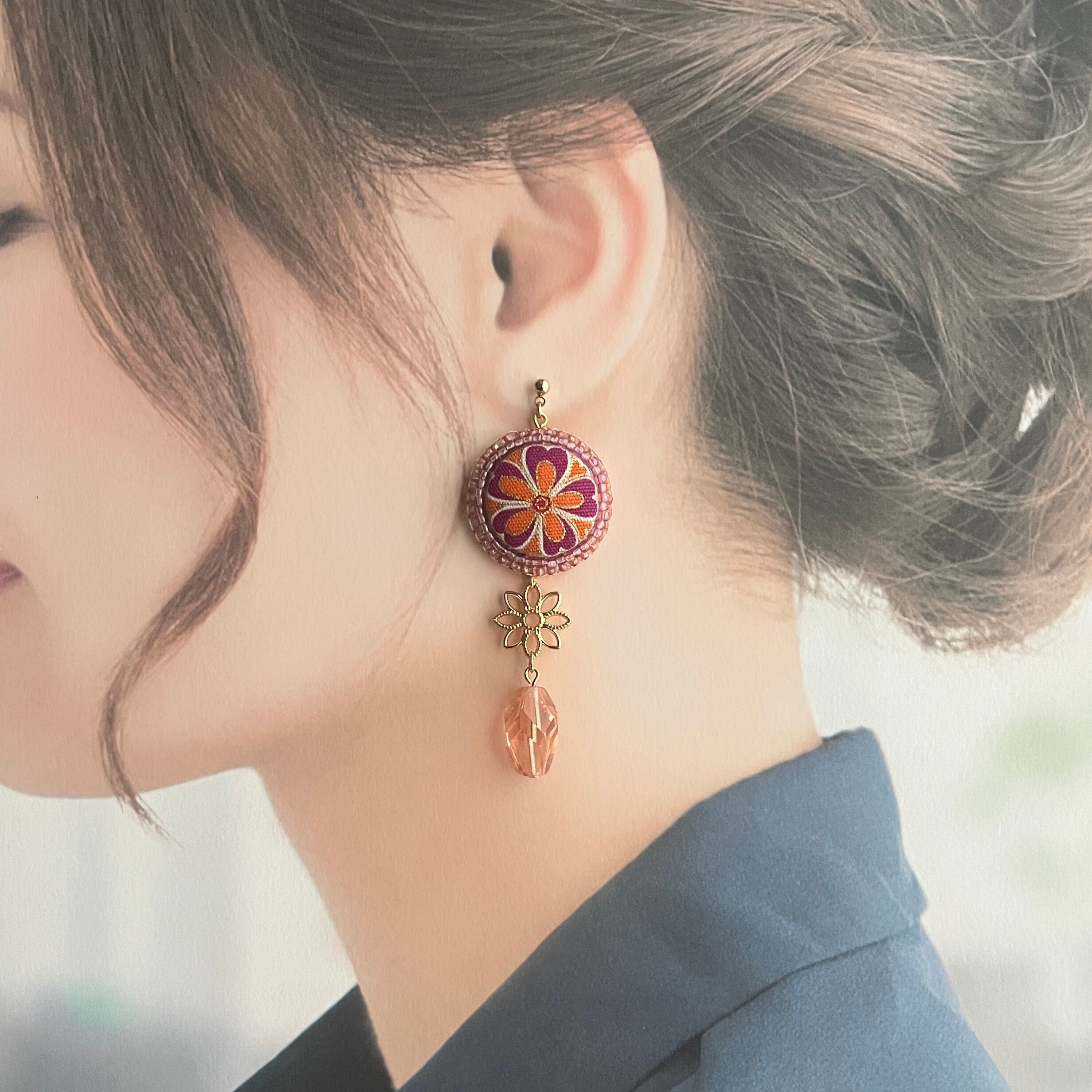 くるみボタンとヴィンテージビーズのピアス