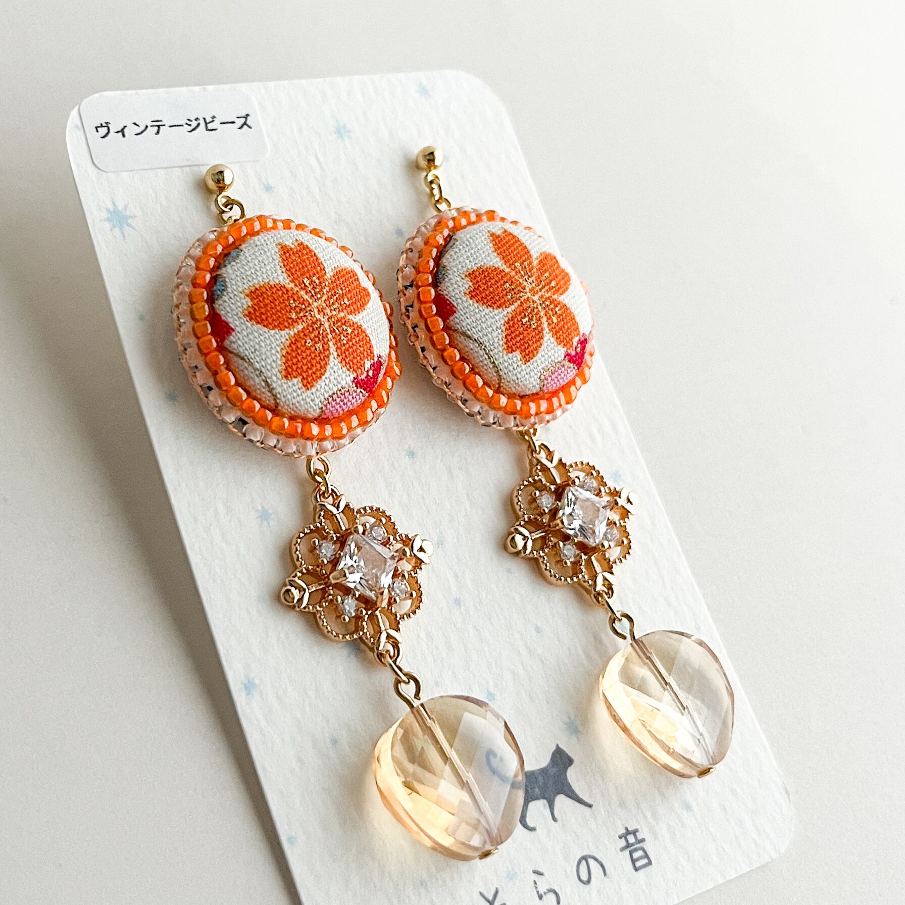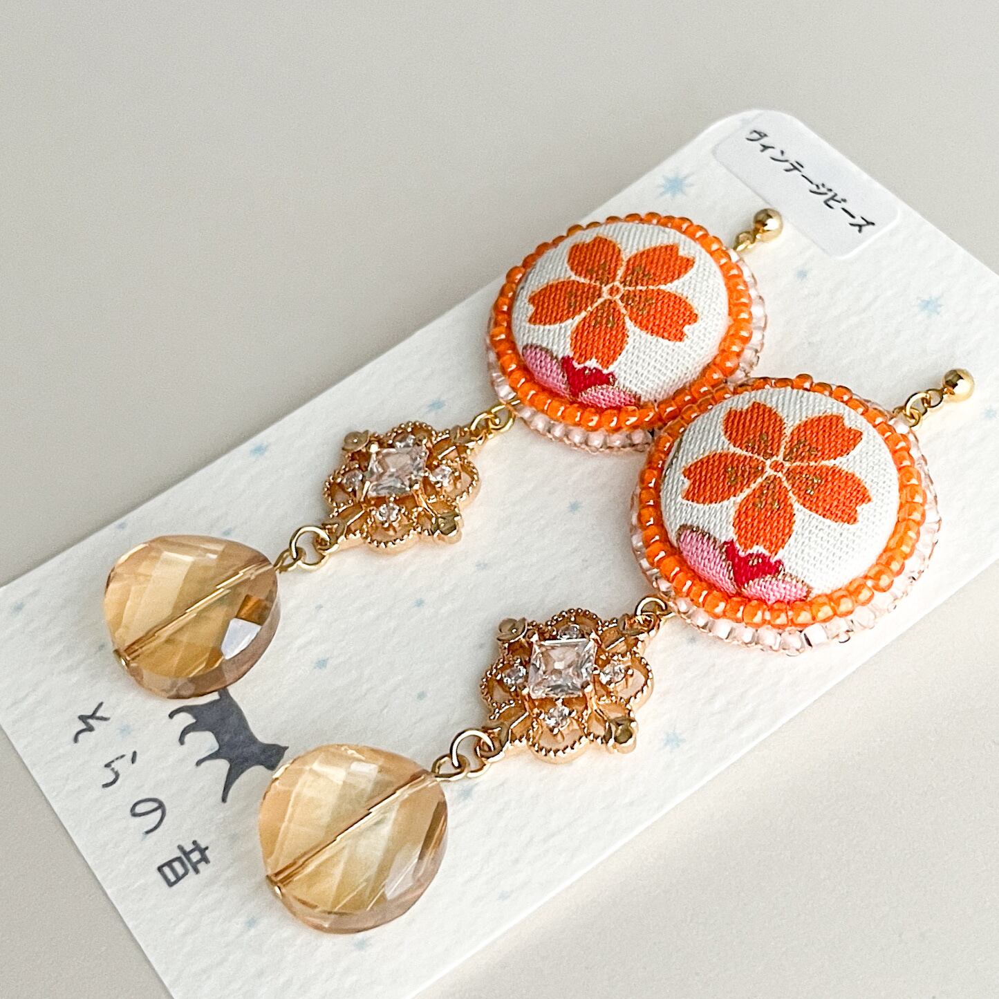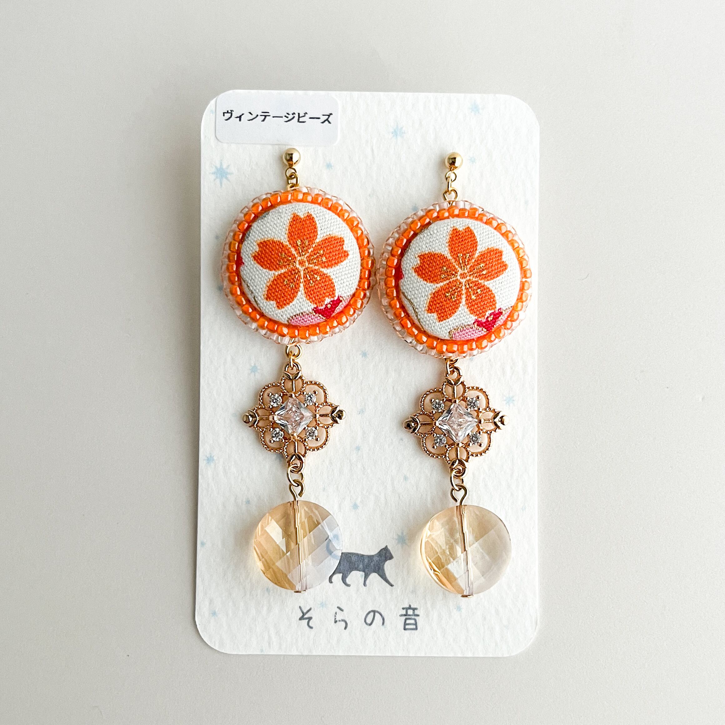 くるみボタンとヴィンテージビーズのピアス