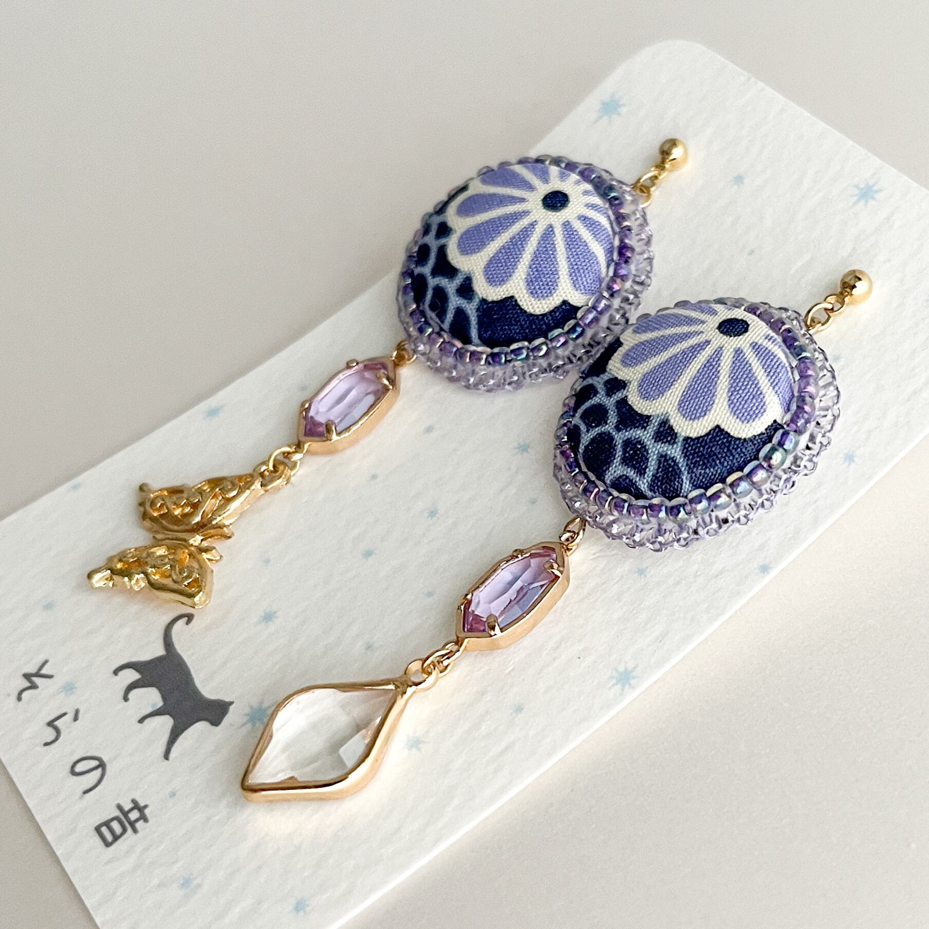 花のくるみボタンと蝶のチャームが可愛いピアスです。