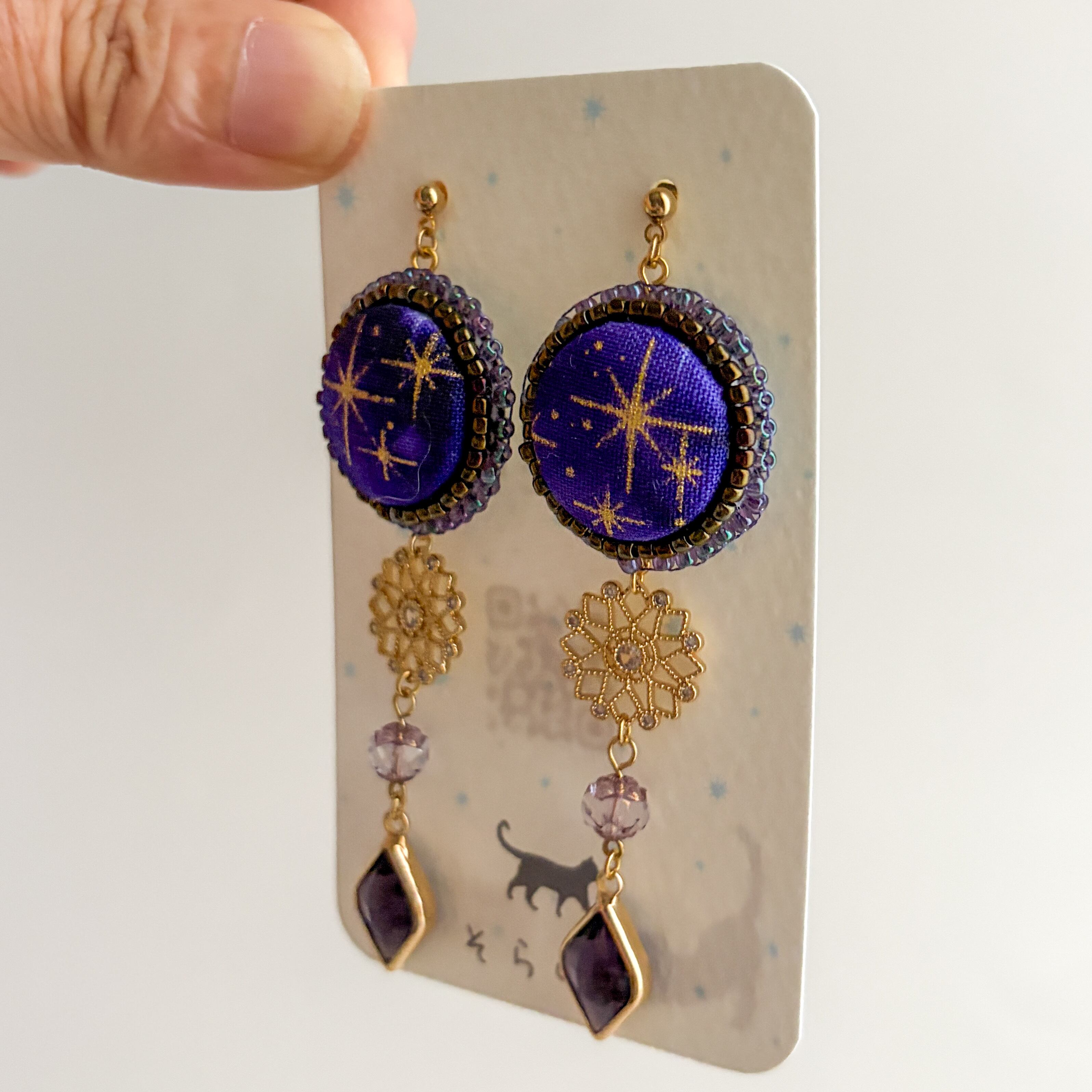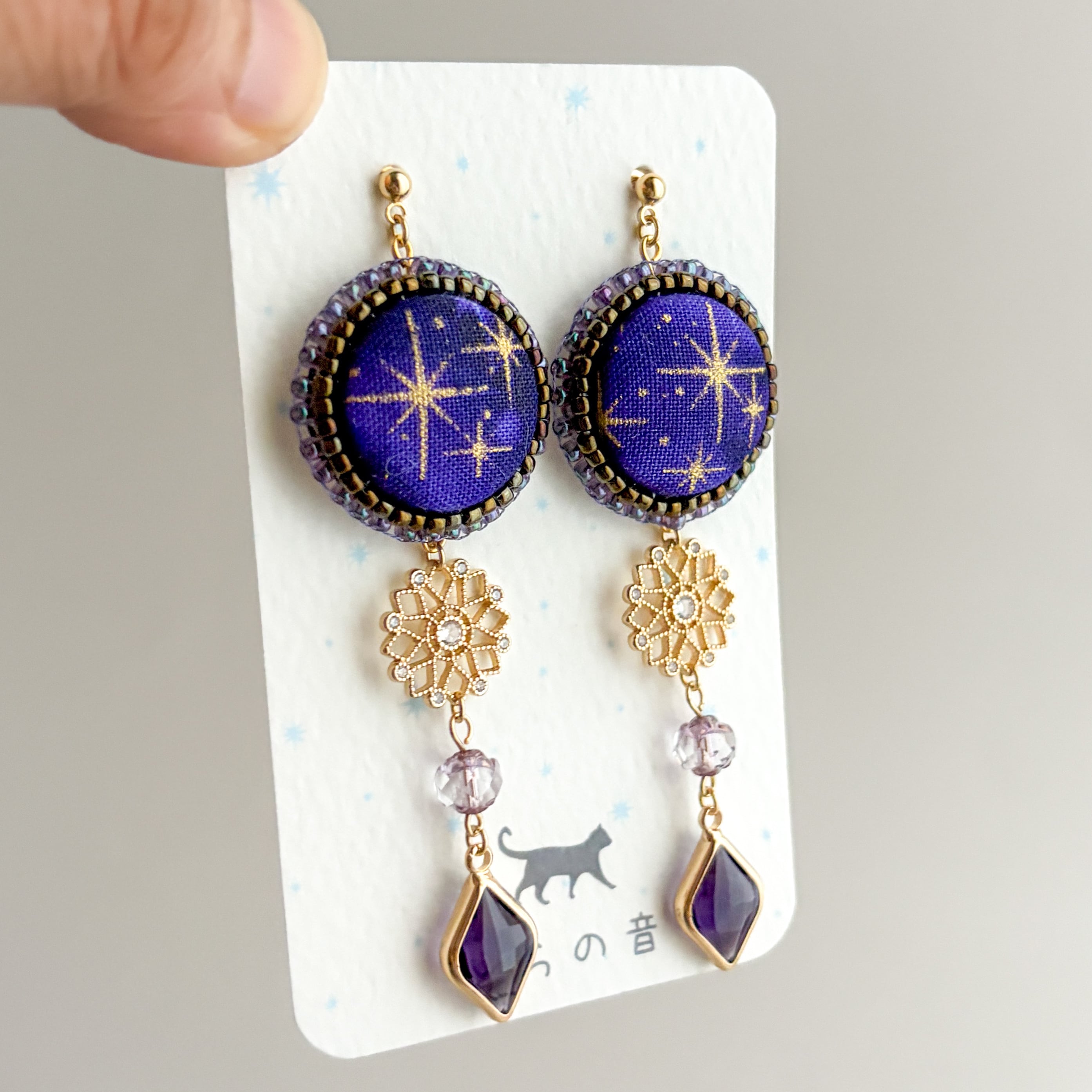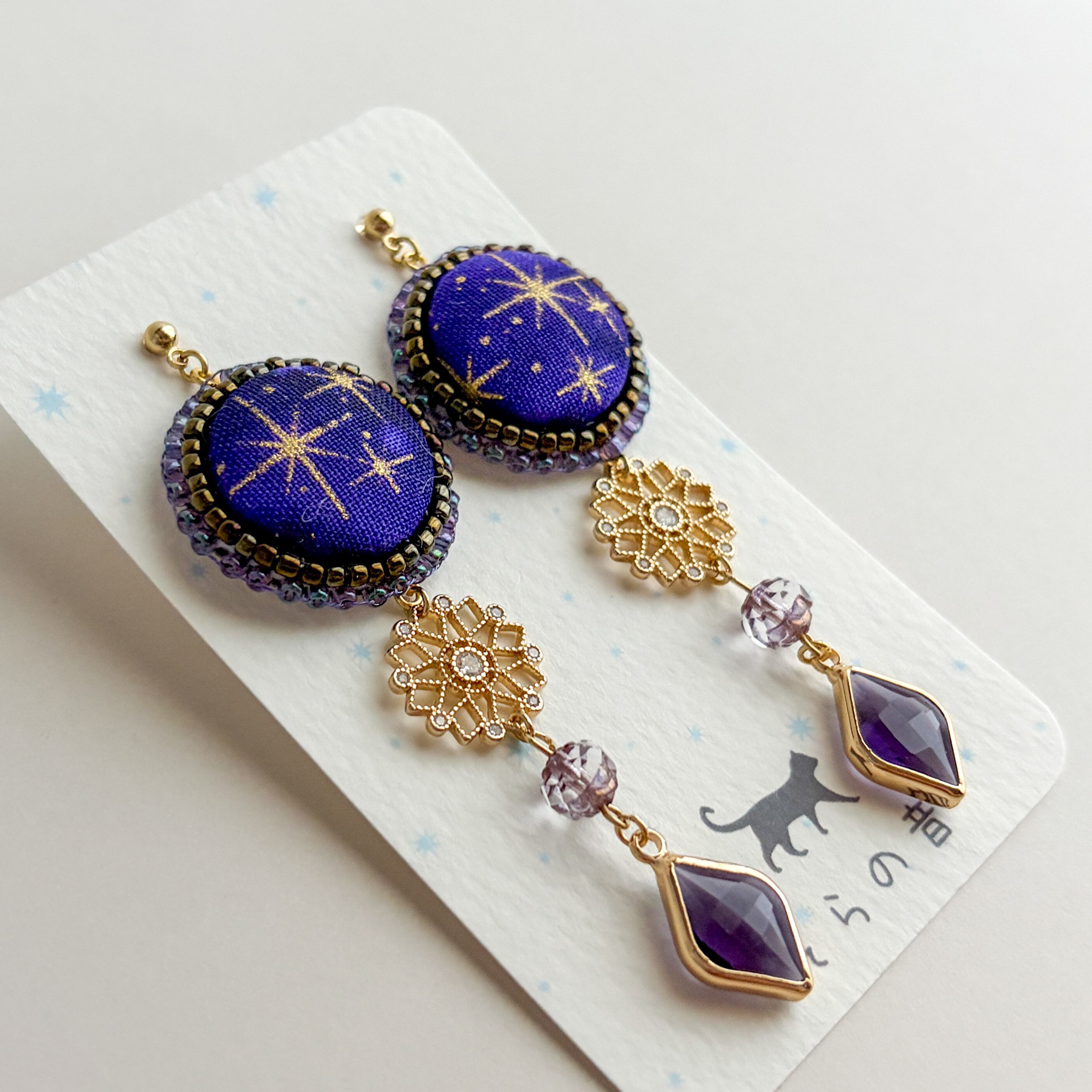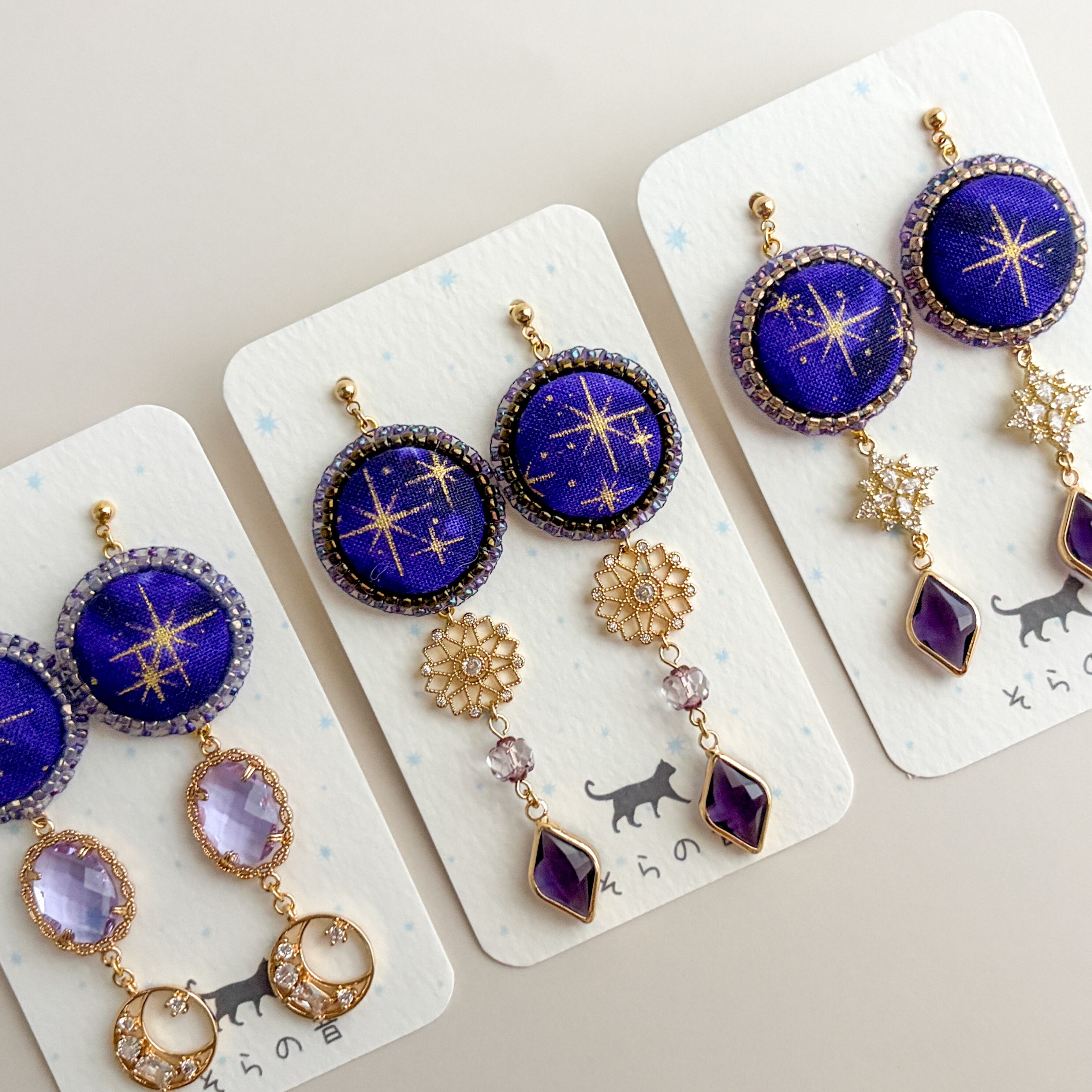 このチャームを中心に考えて、くるみボタンの星は派手過ぎずシンプル過ぎないところを探し作品にしました。