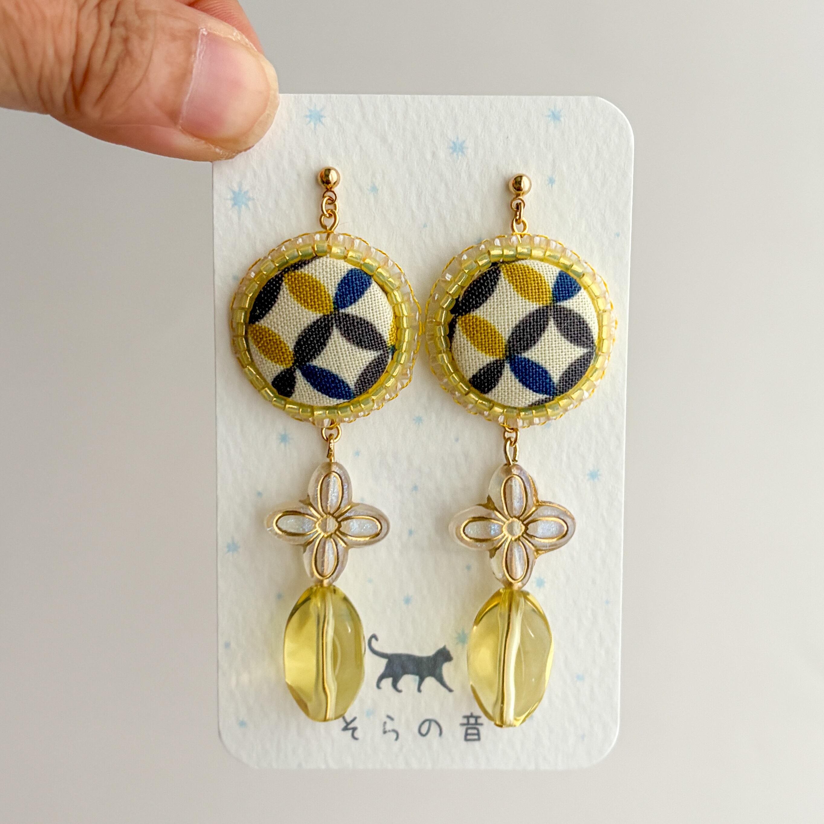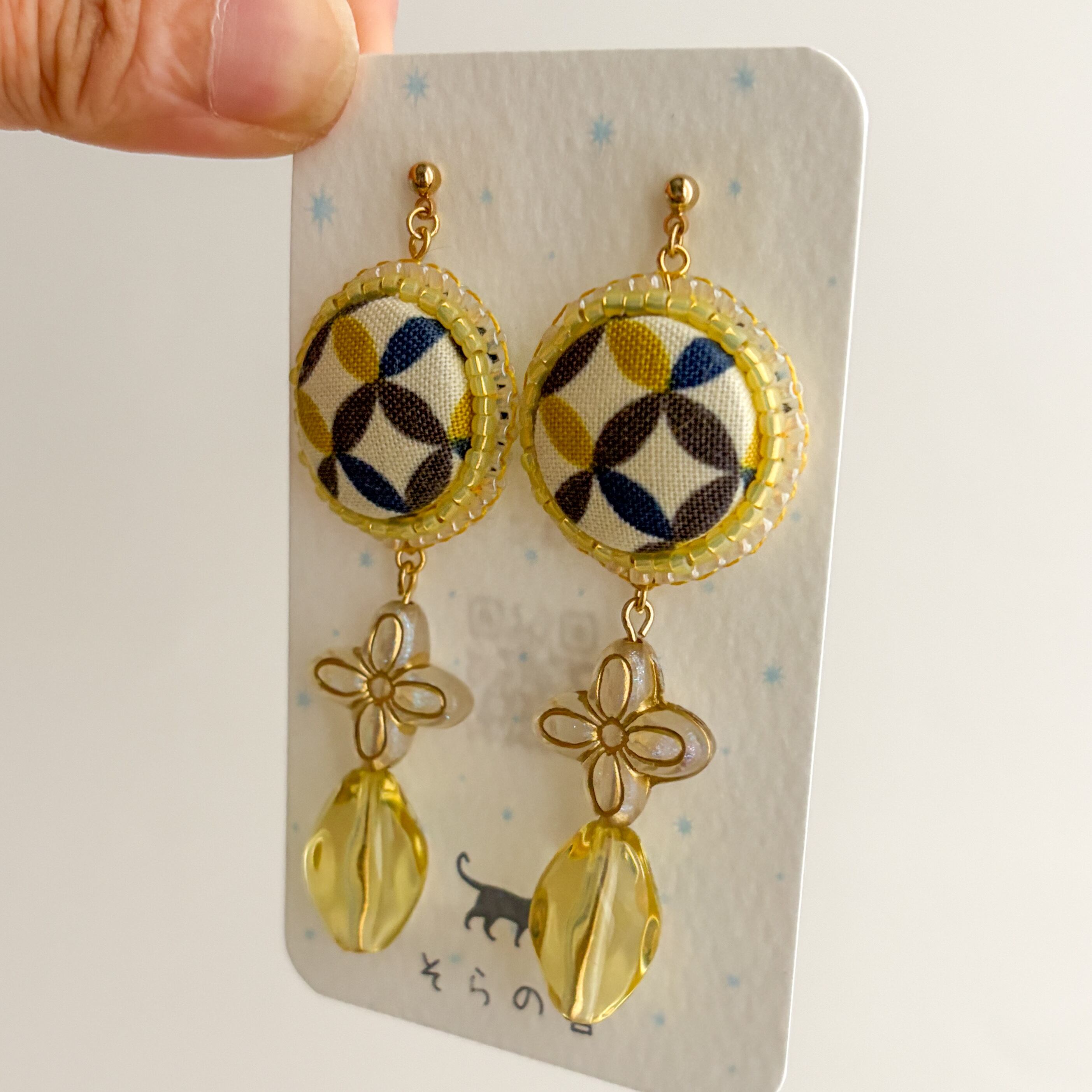 黄色で少し派手に感じますが真ん中のビーズやくるみボタンの縁のビーズに乳白色の物を使ったので全体的に優しい雰囲気になりました。