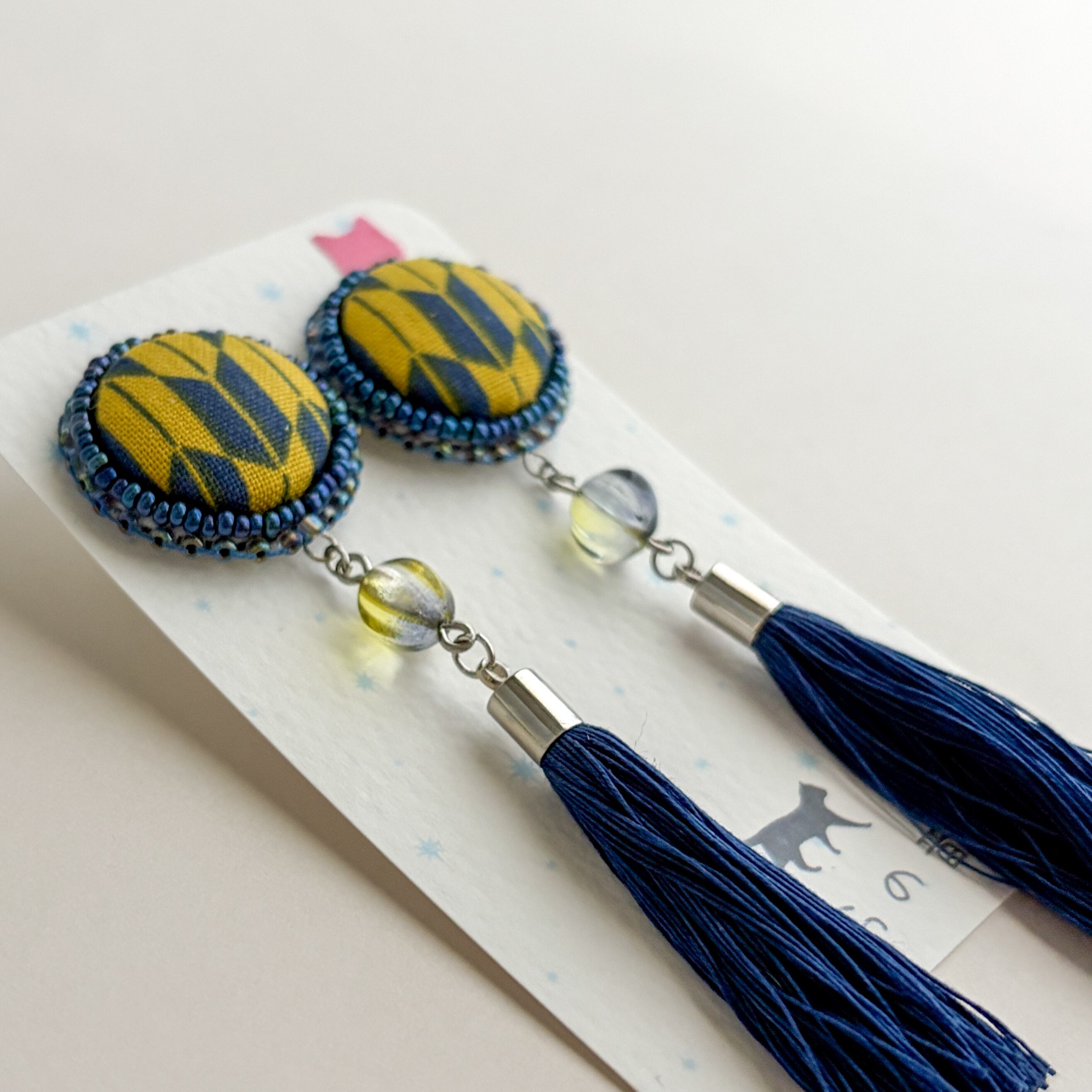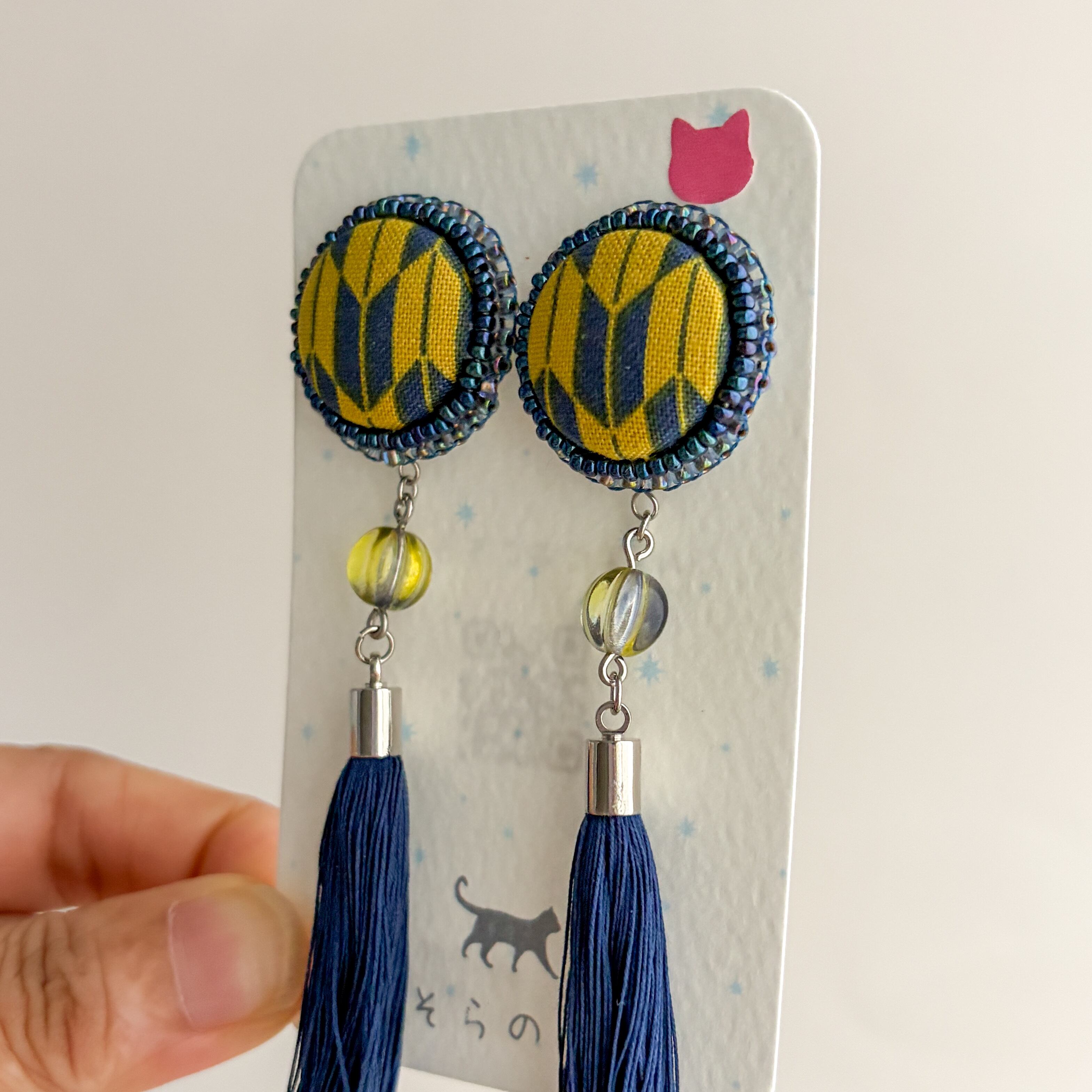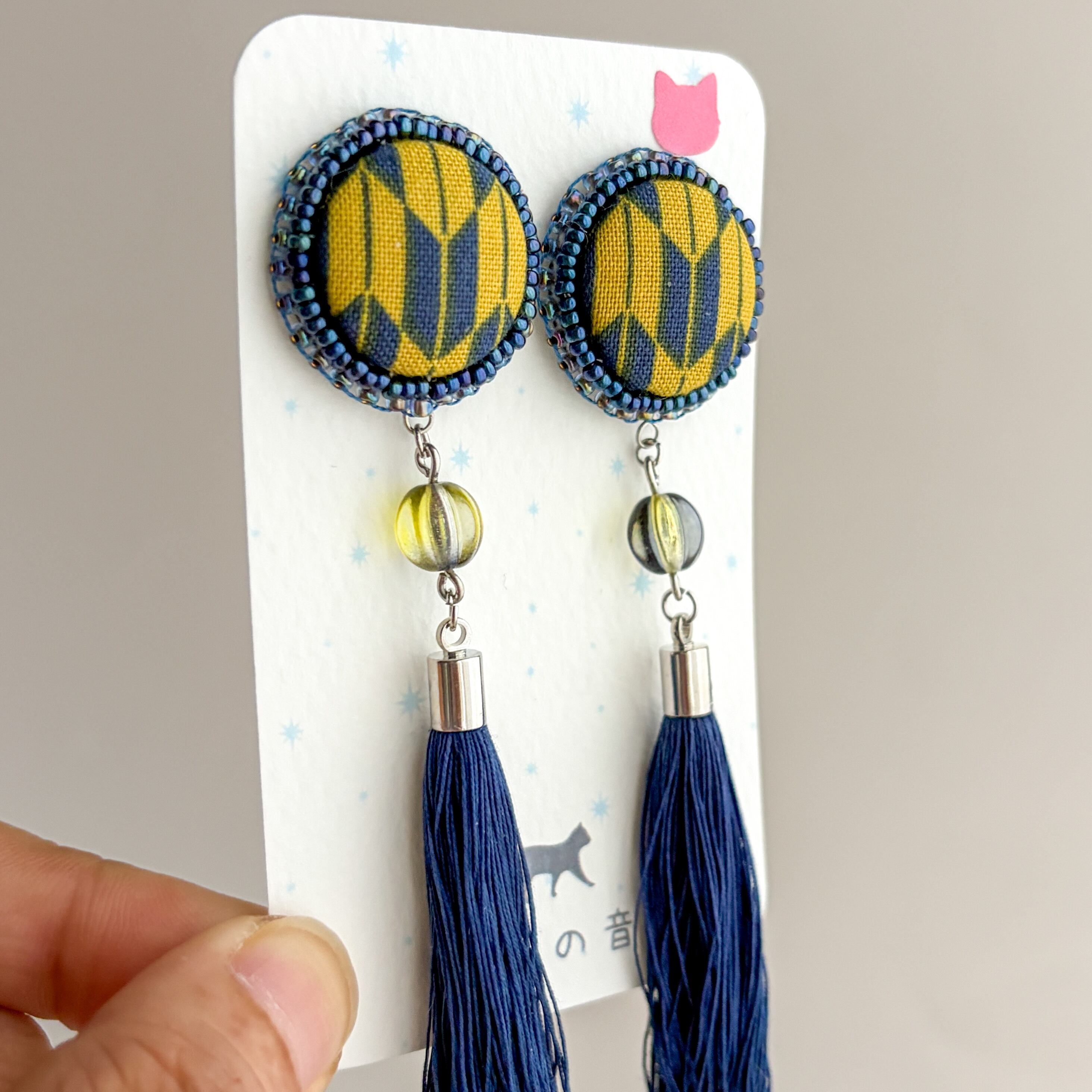 矢絣のくるみボタンとタッセルの耳飾りです。