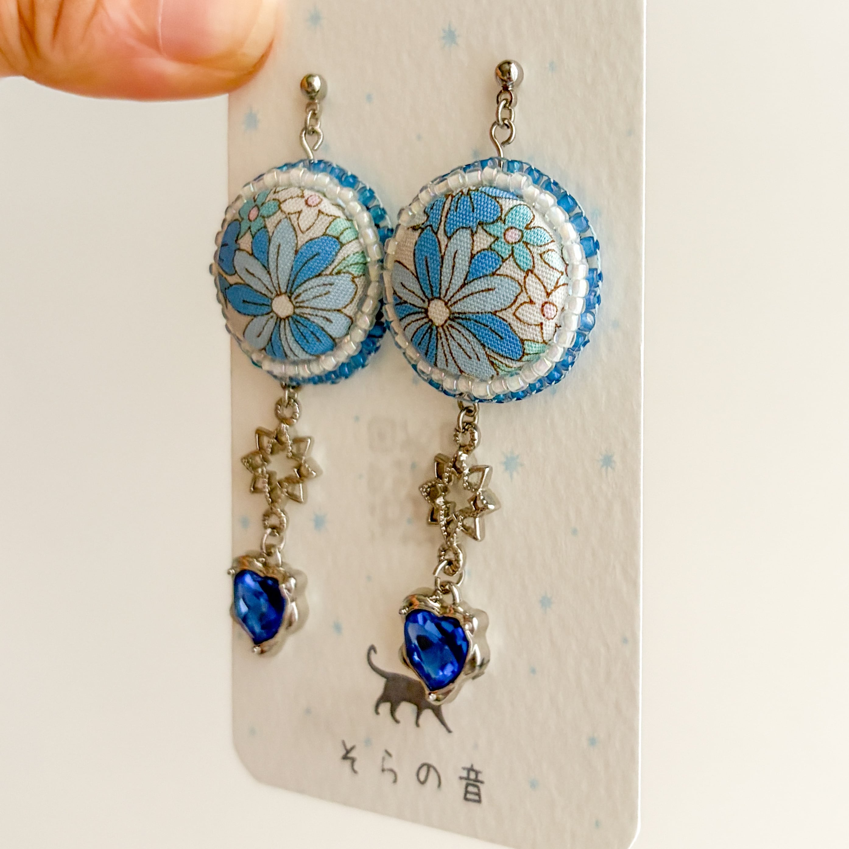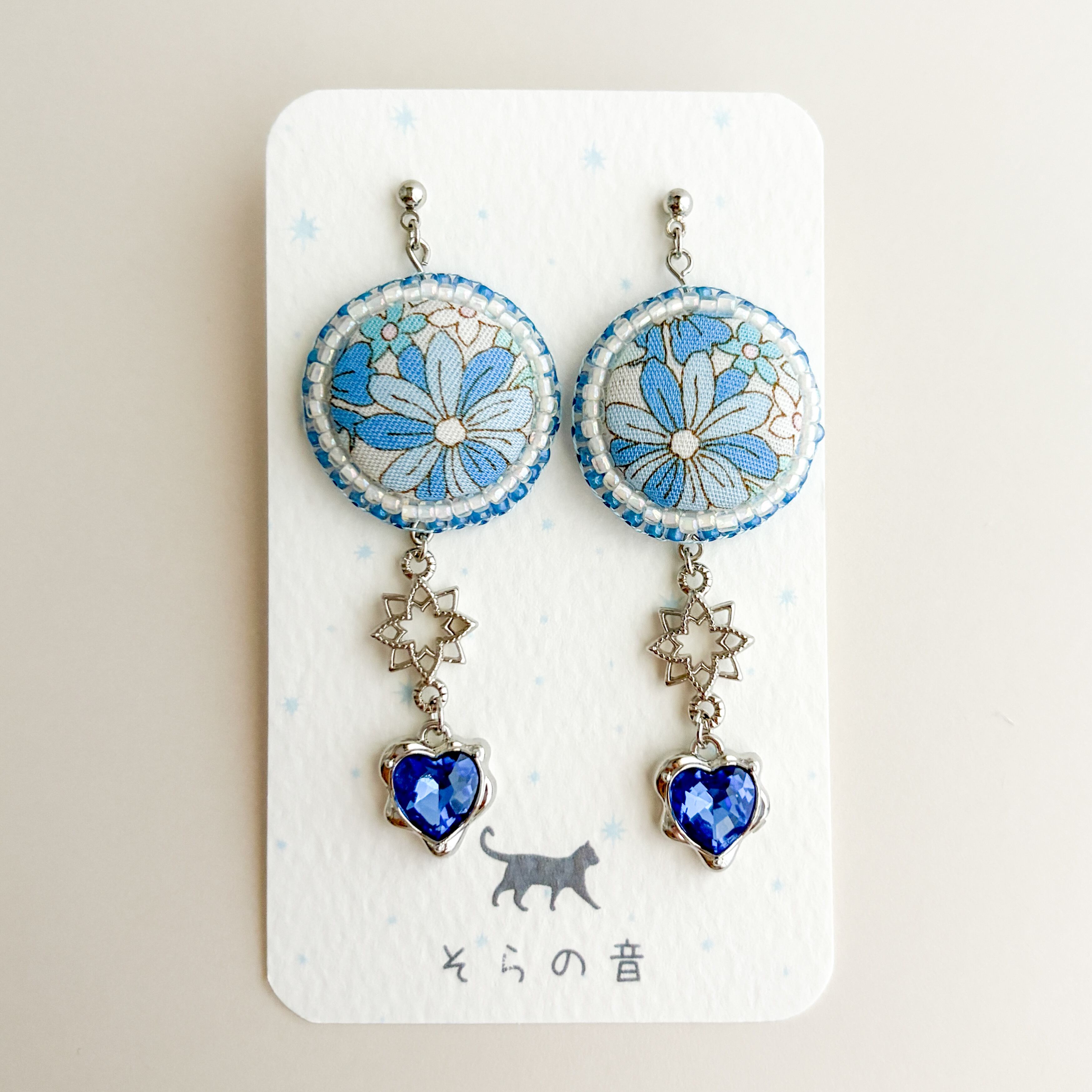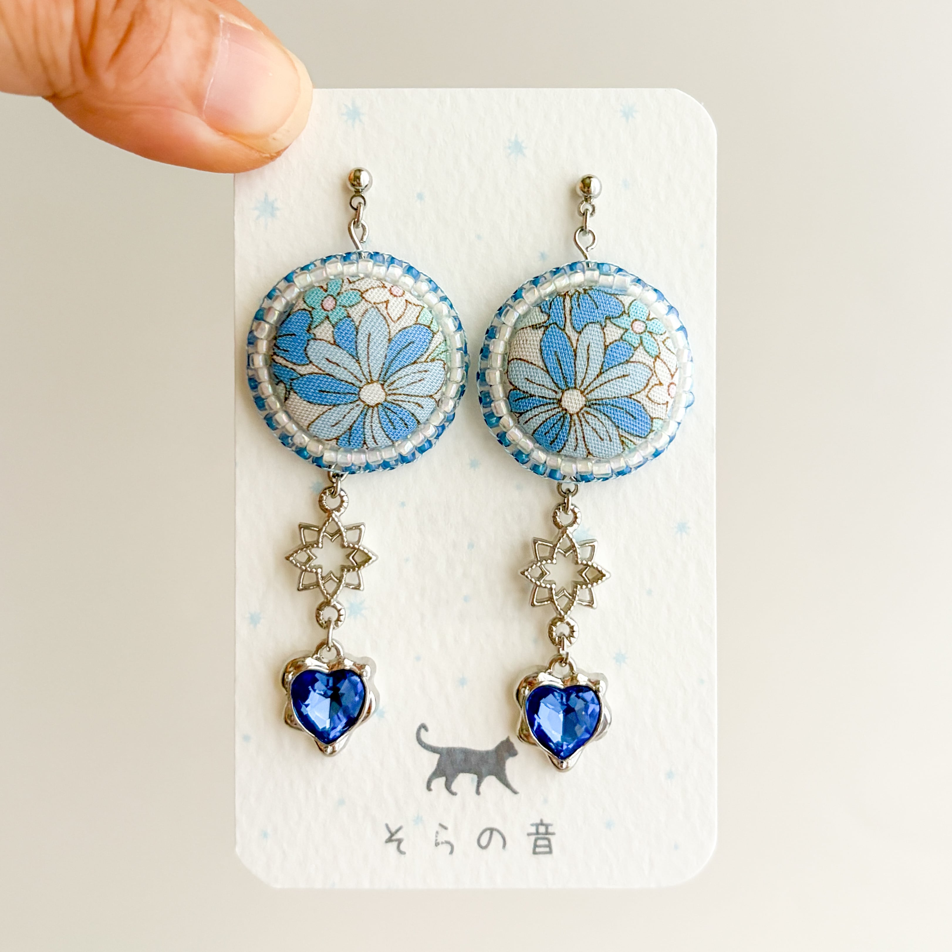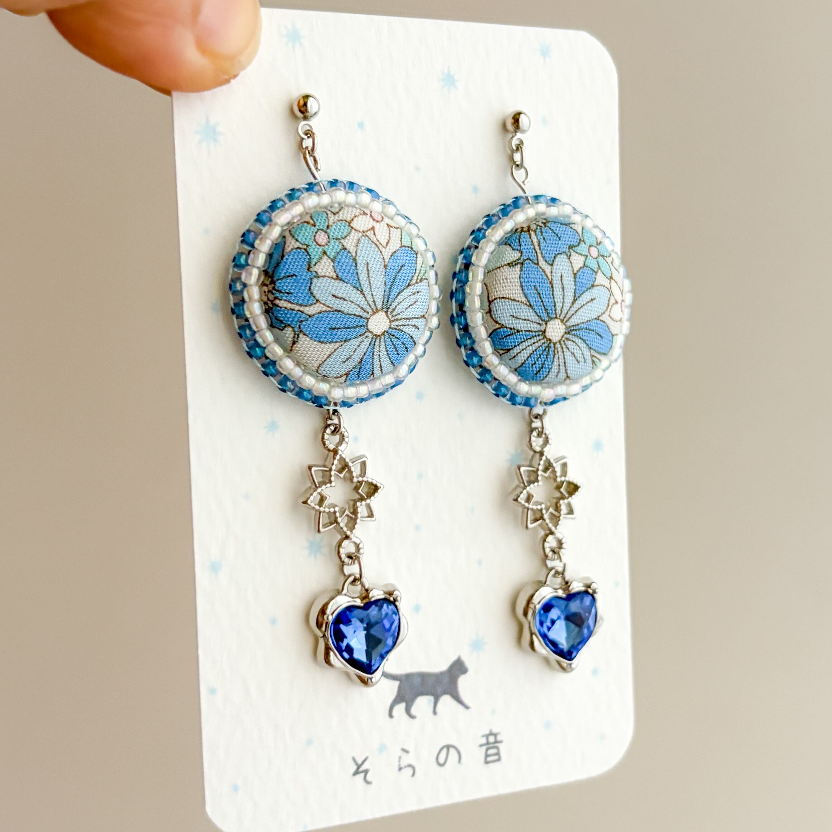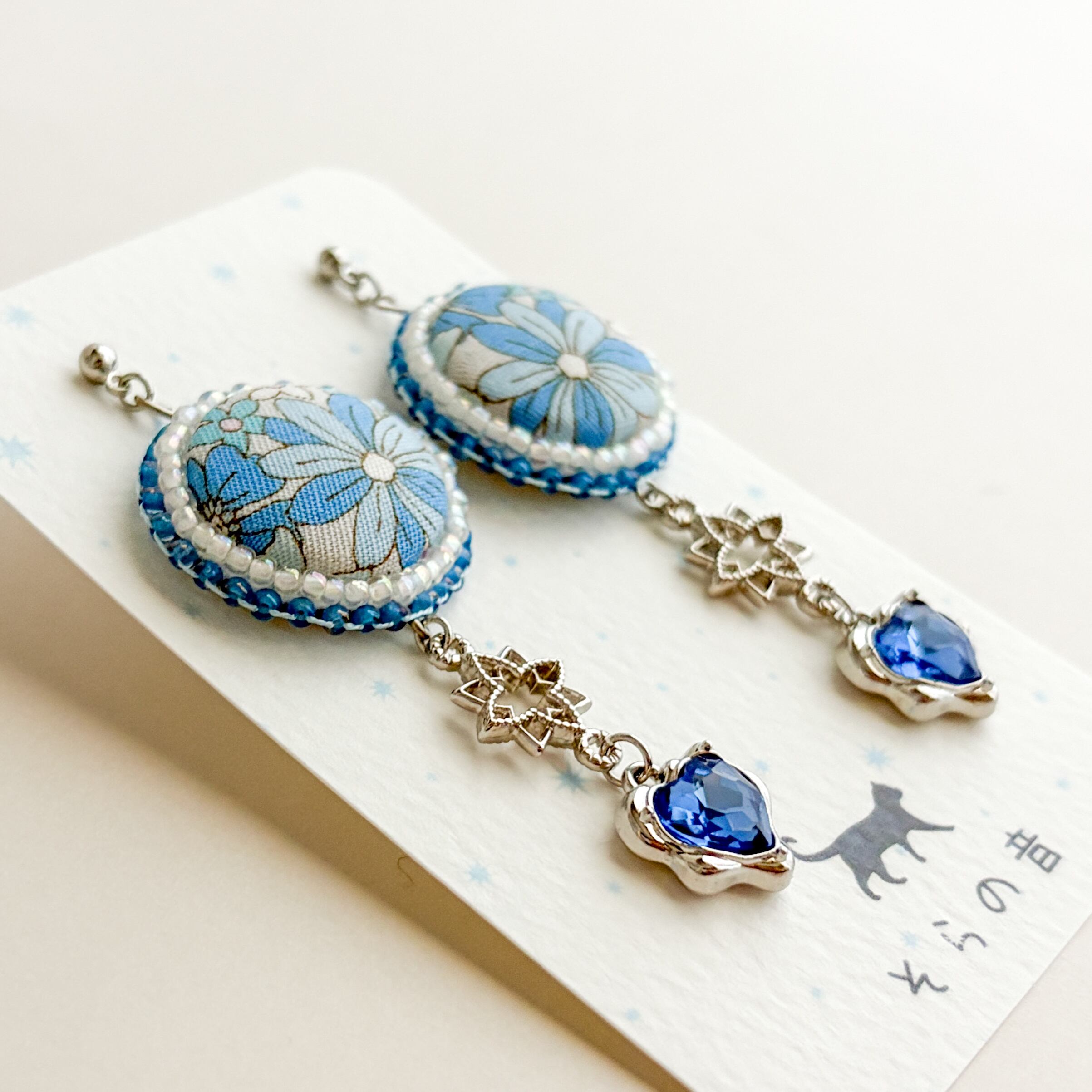 くるみボタンと周りのビーズは白×青でまとめたのでスッキリした印象もあります。