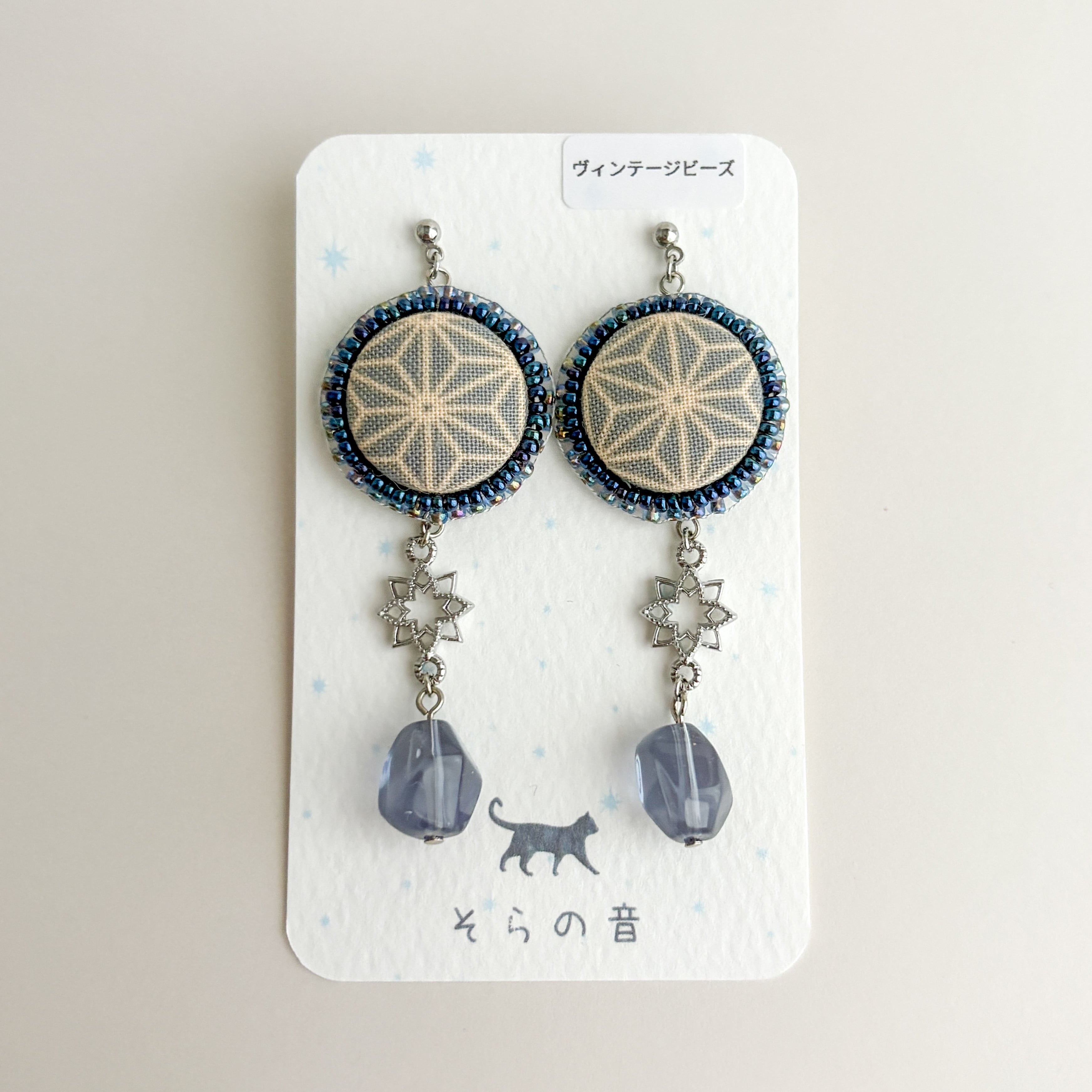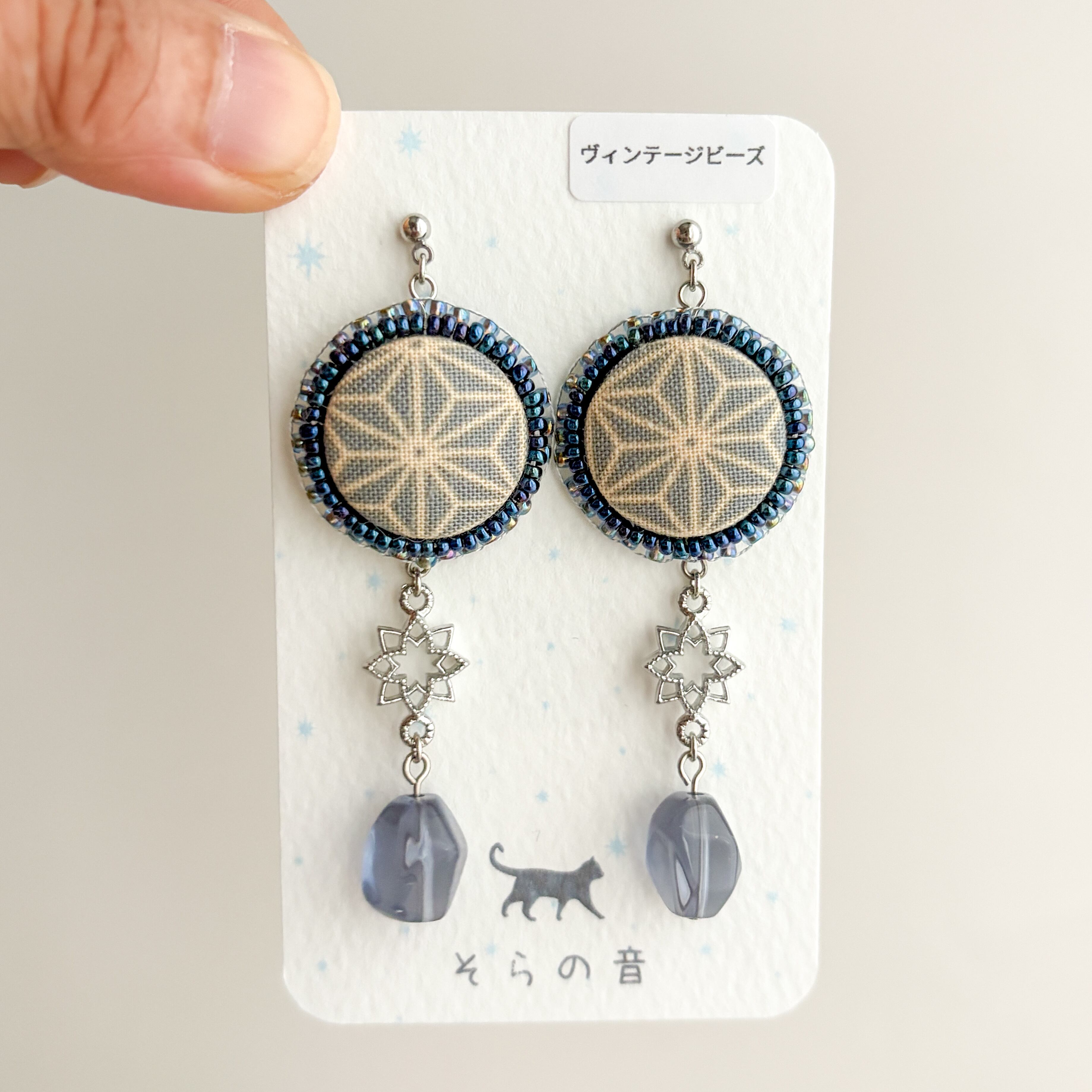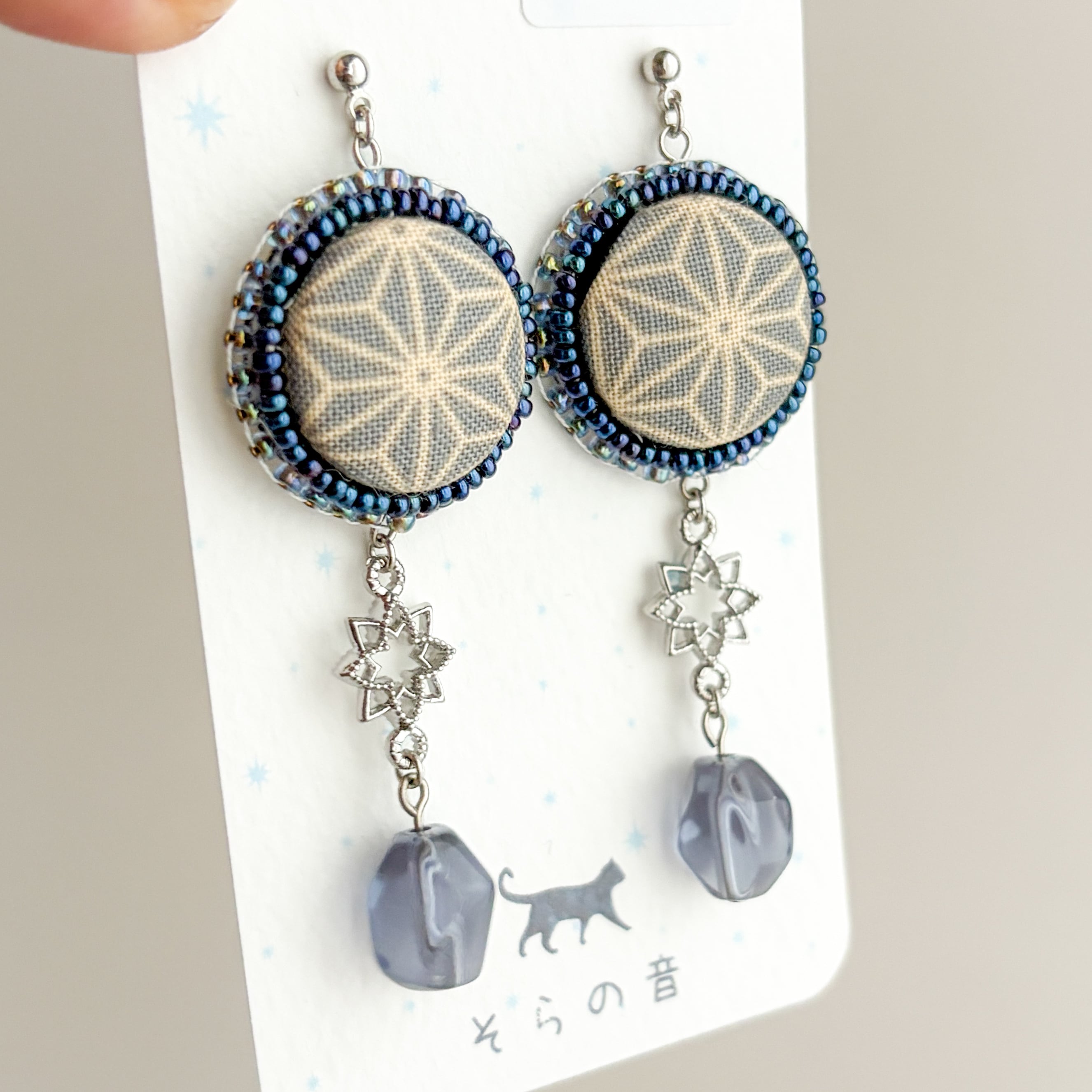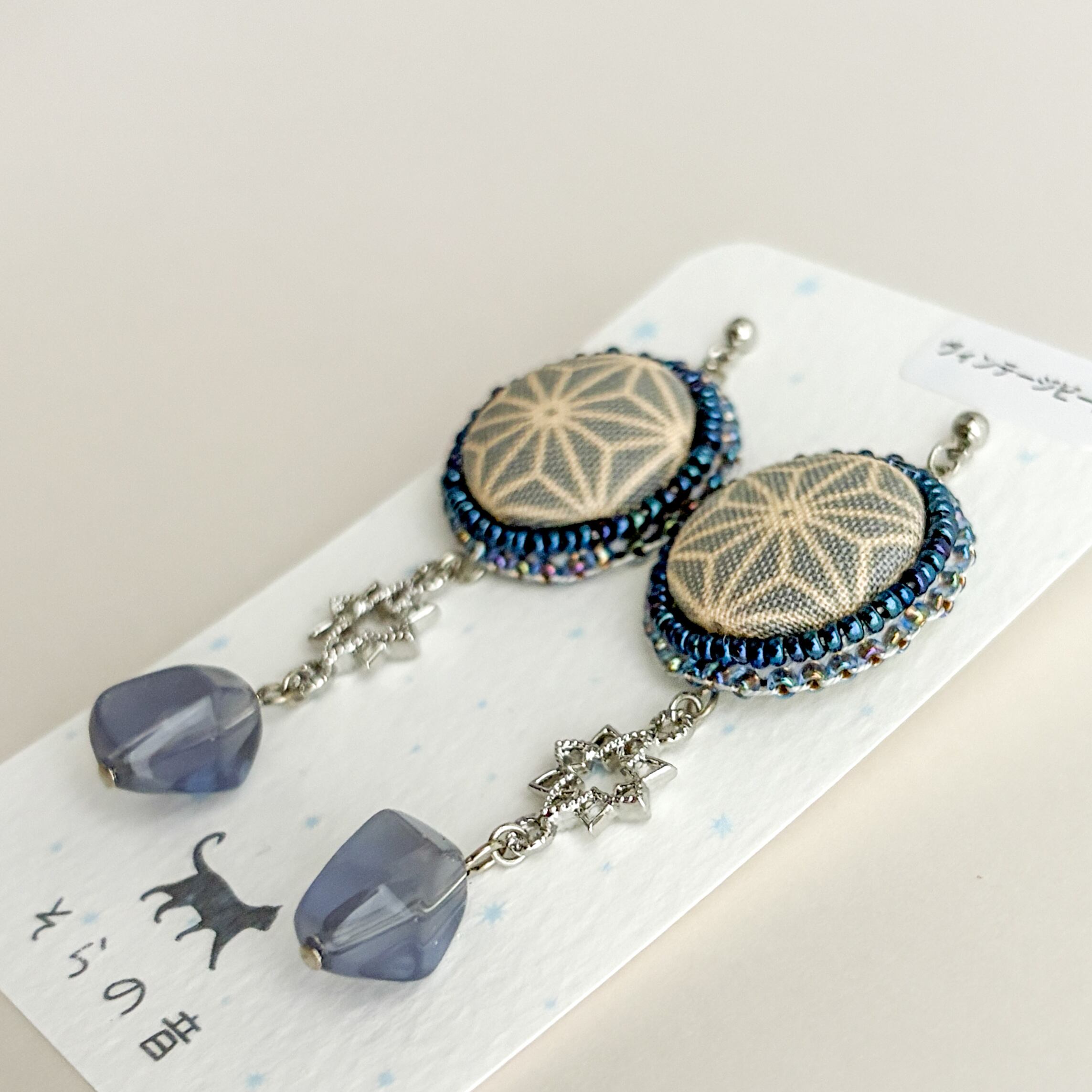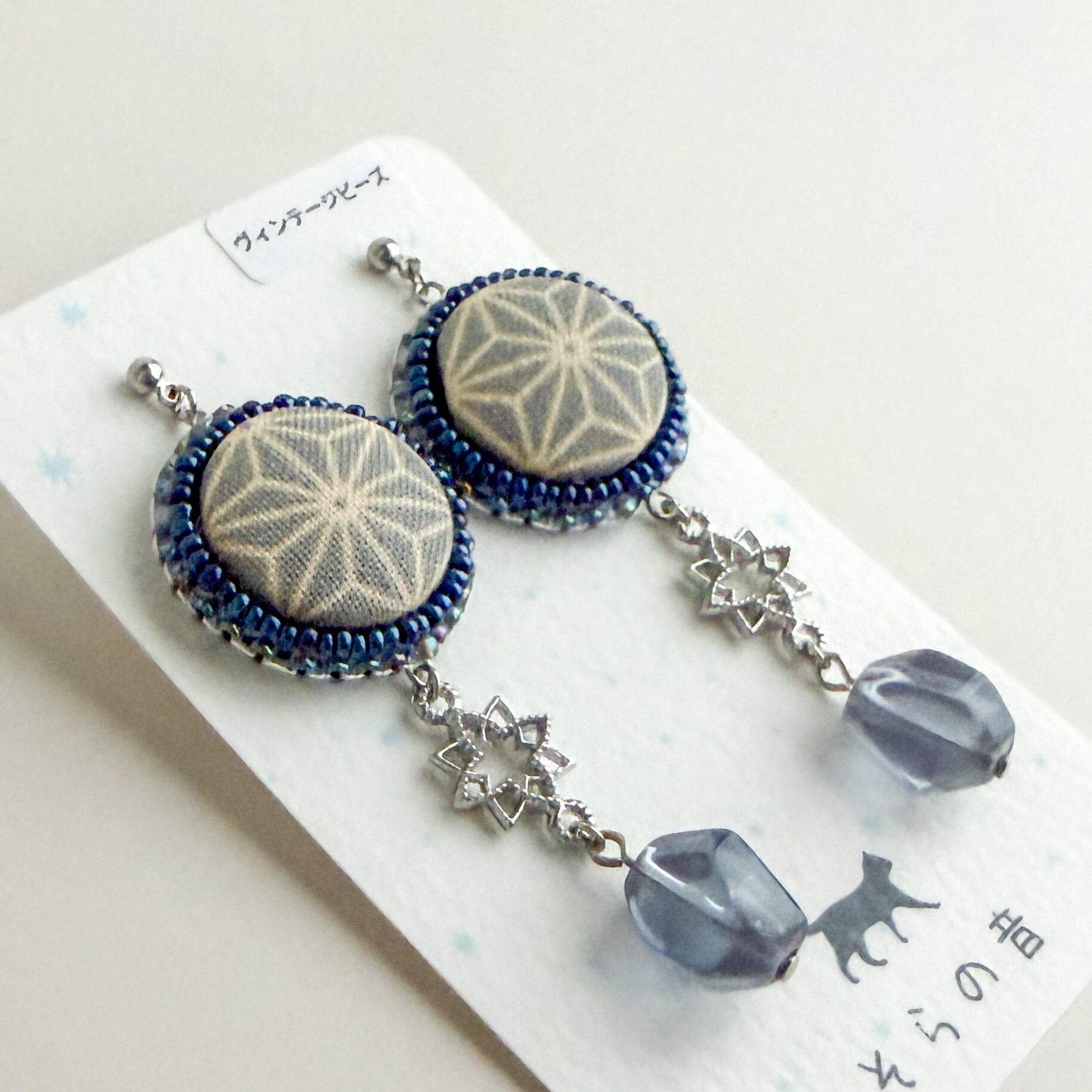 麻の葉模様のくるみボタンの耳飾り