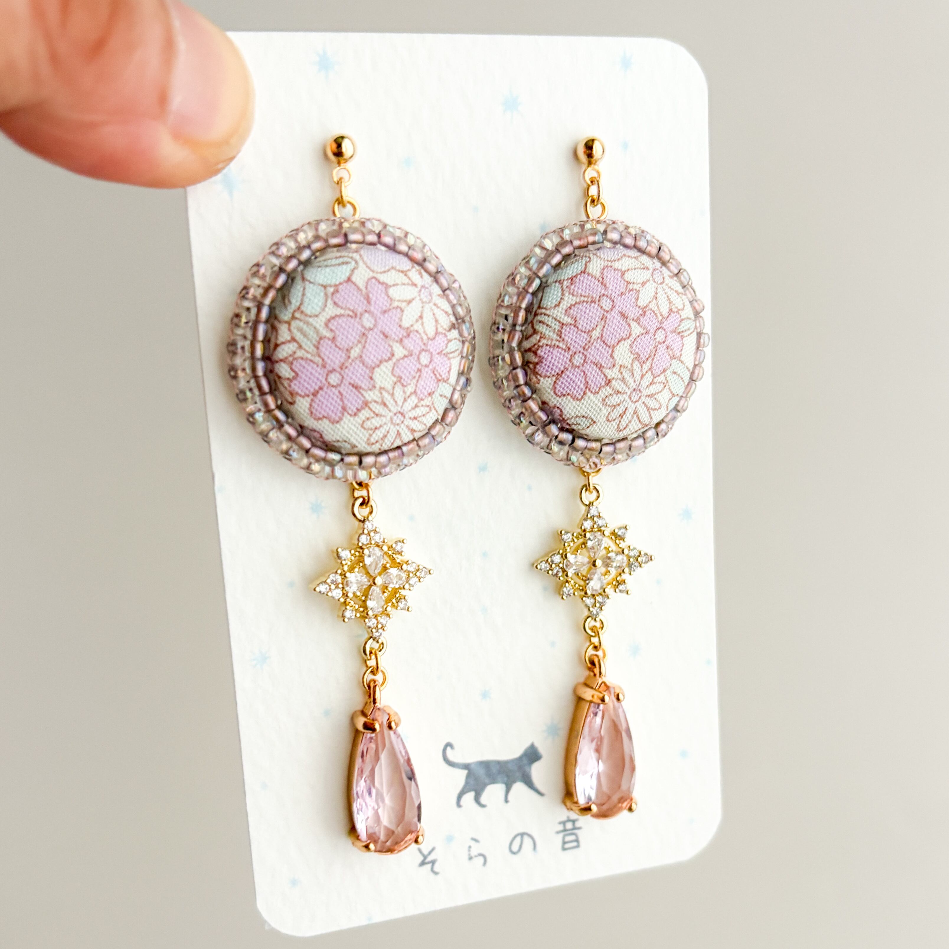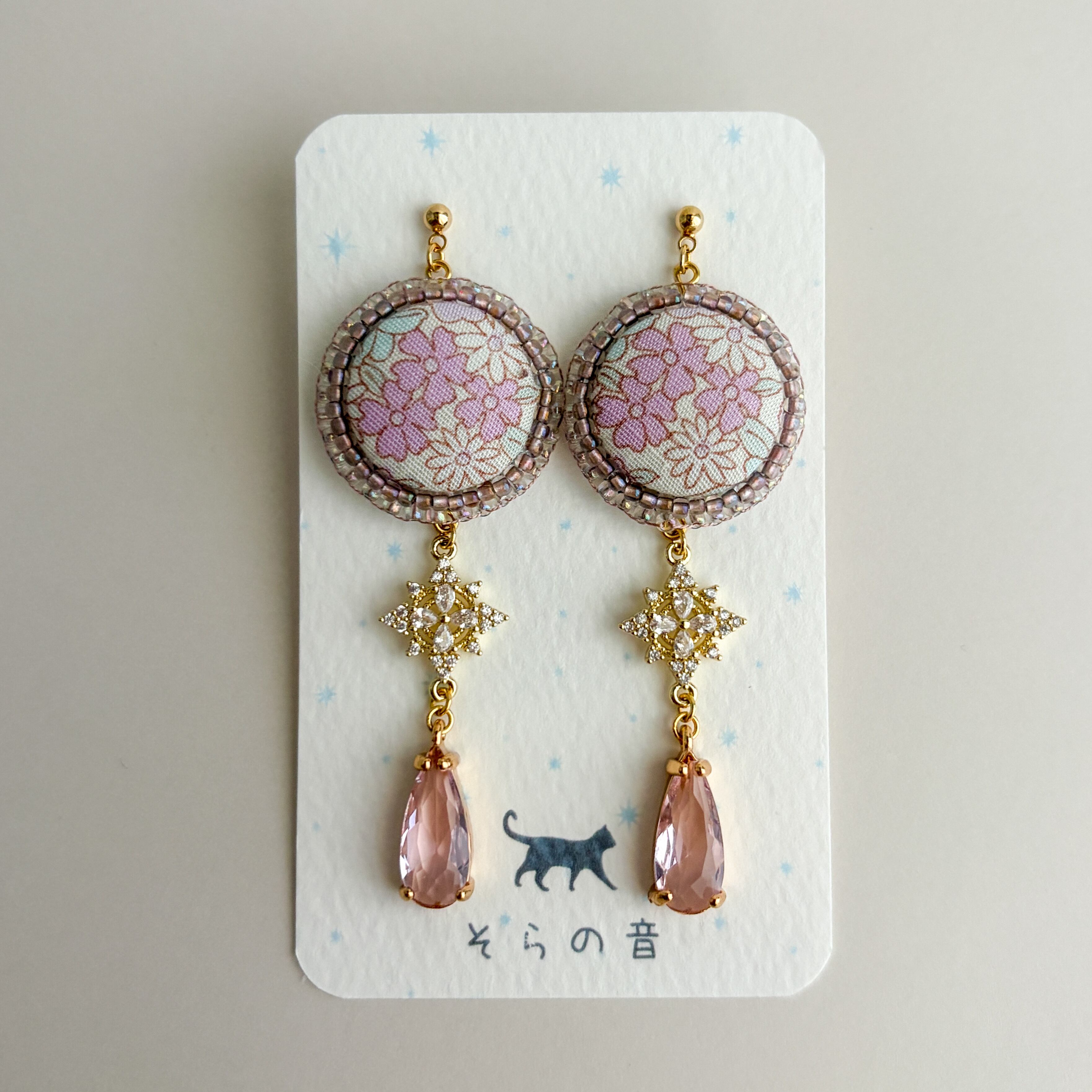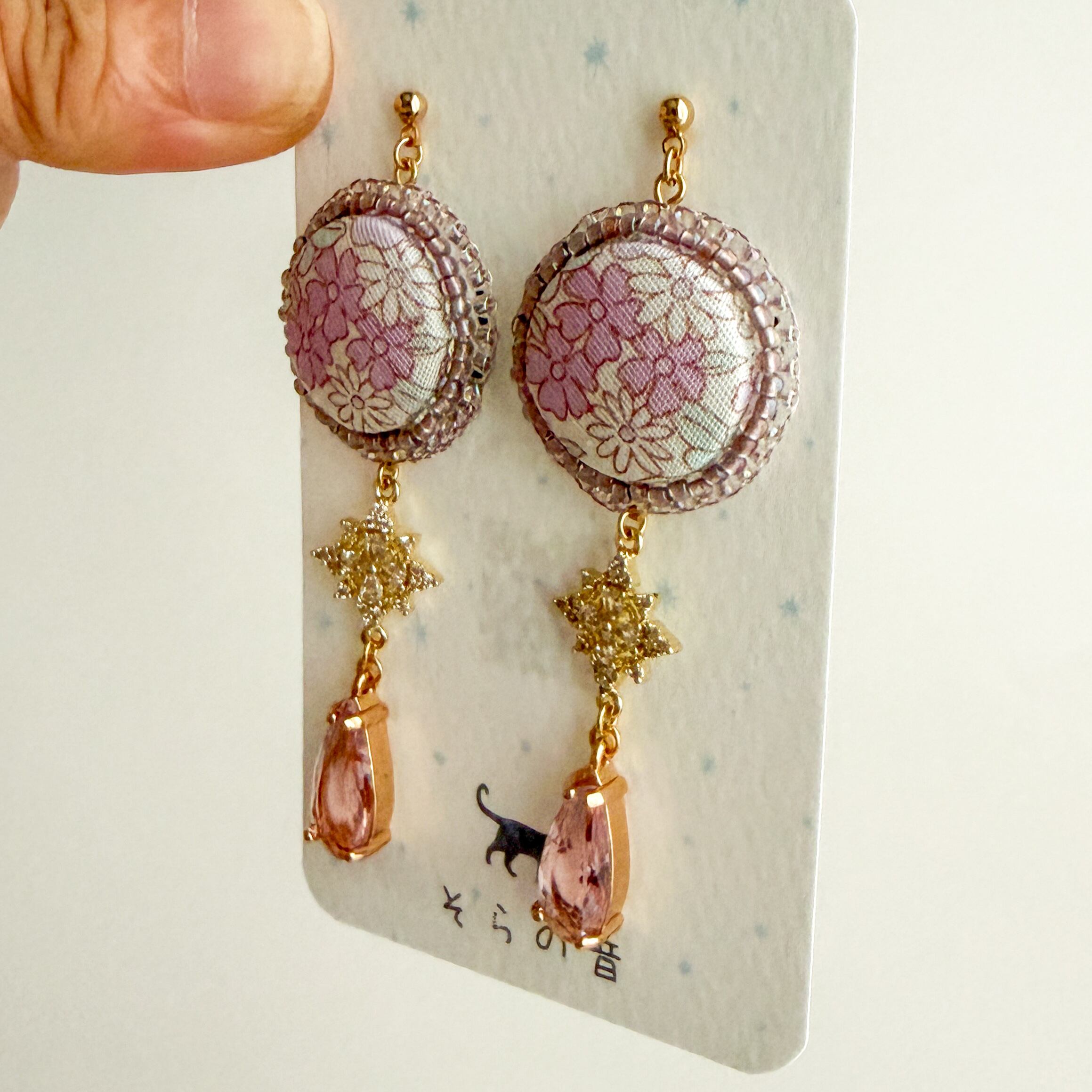 上品な淡い紫の小花のくるみボタンの耳飾り