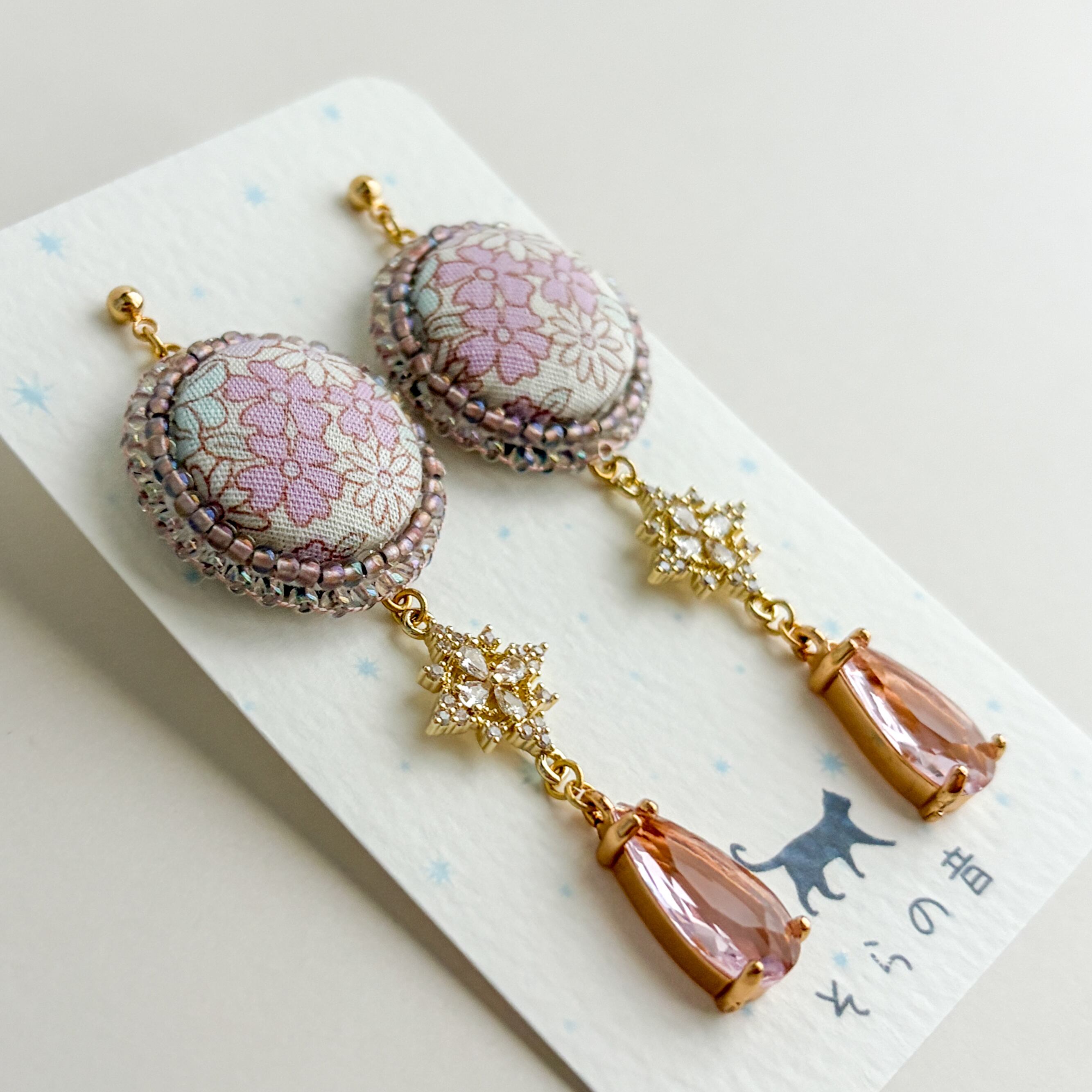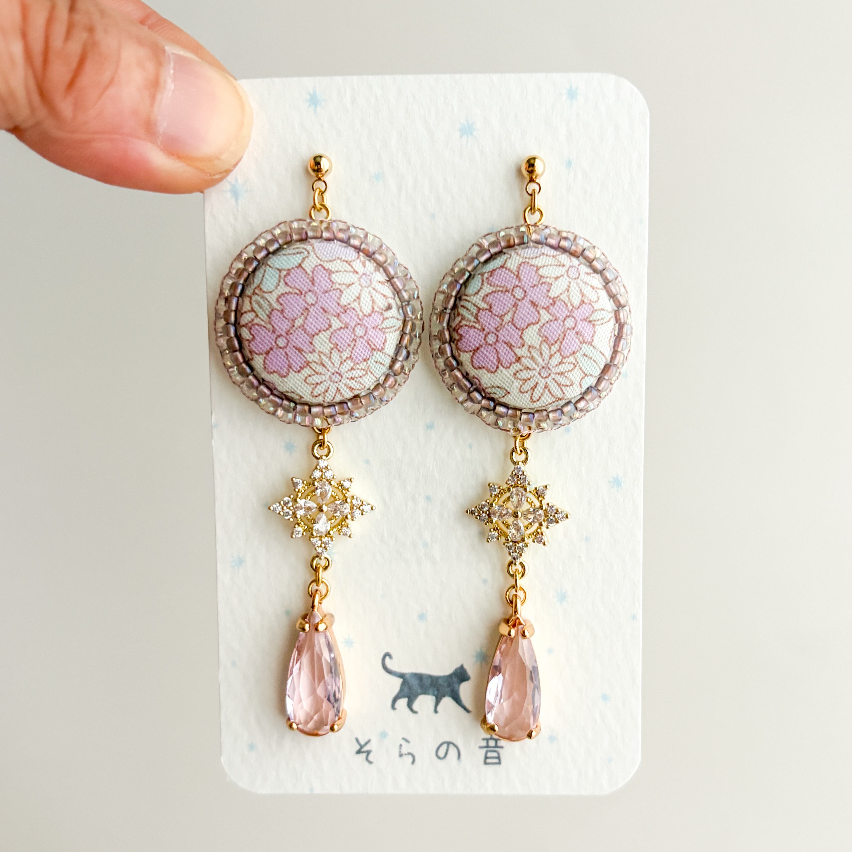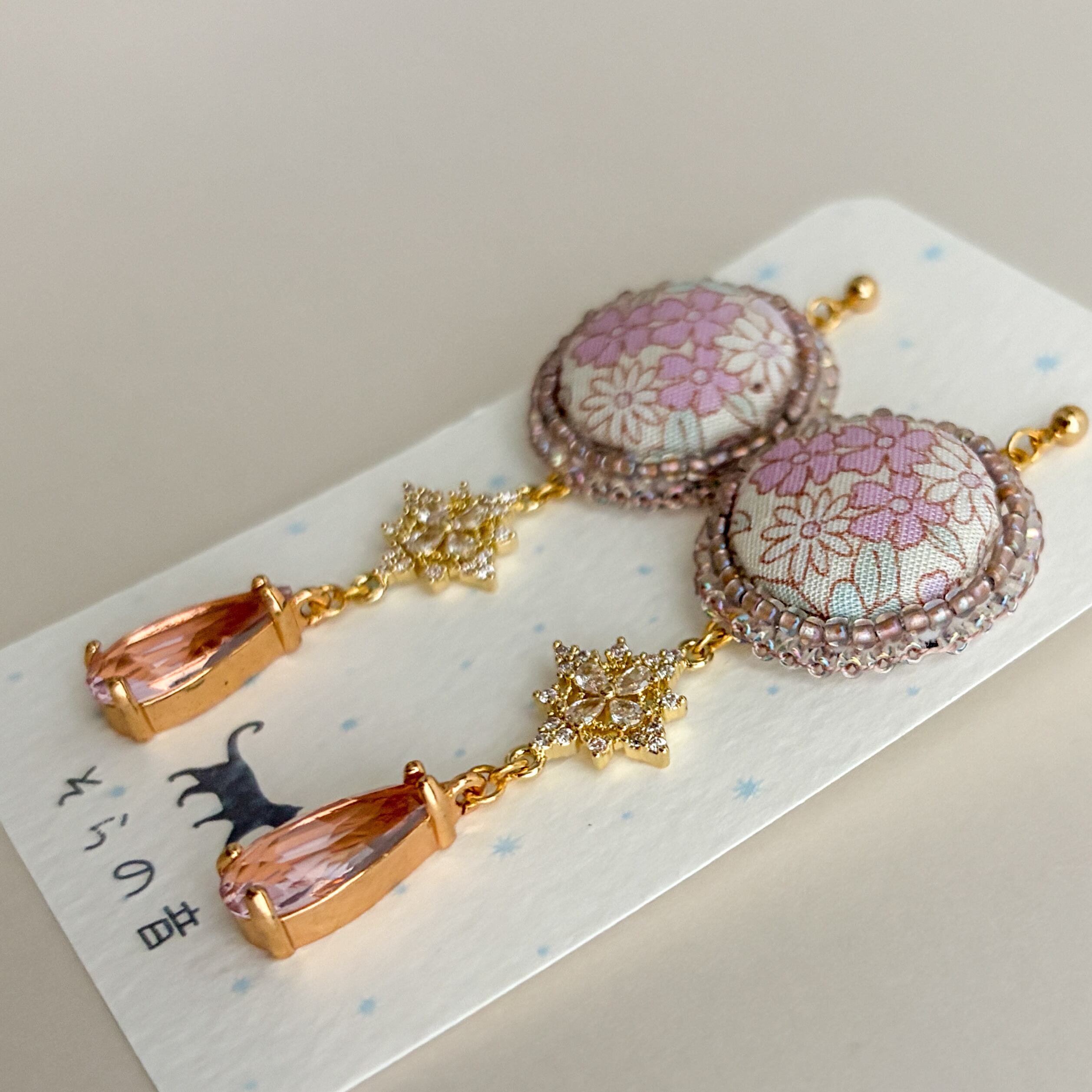 上品な淡い紫の小花のくるみボタンの耳飾り