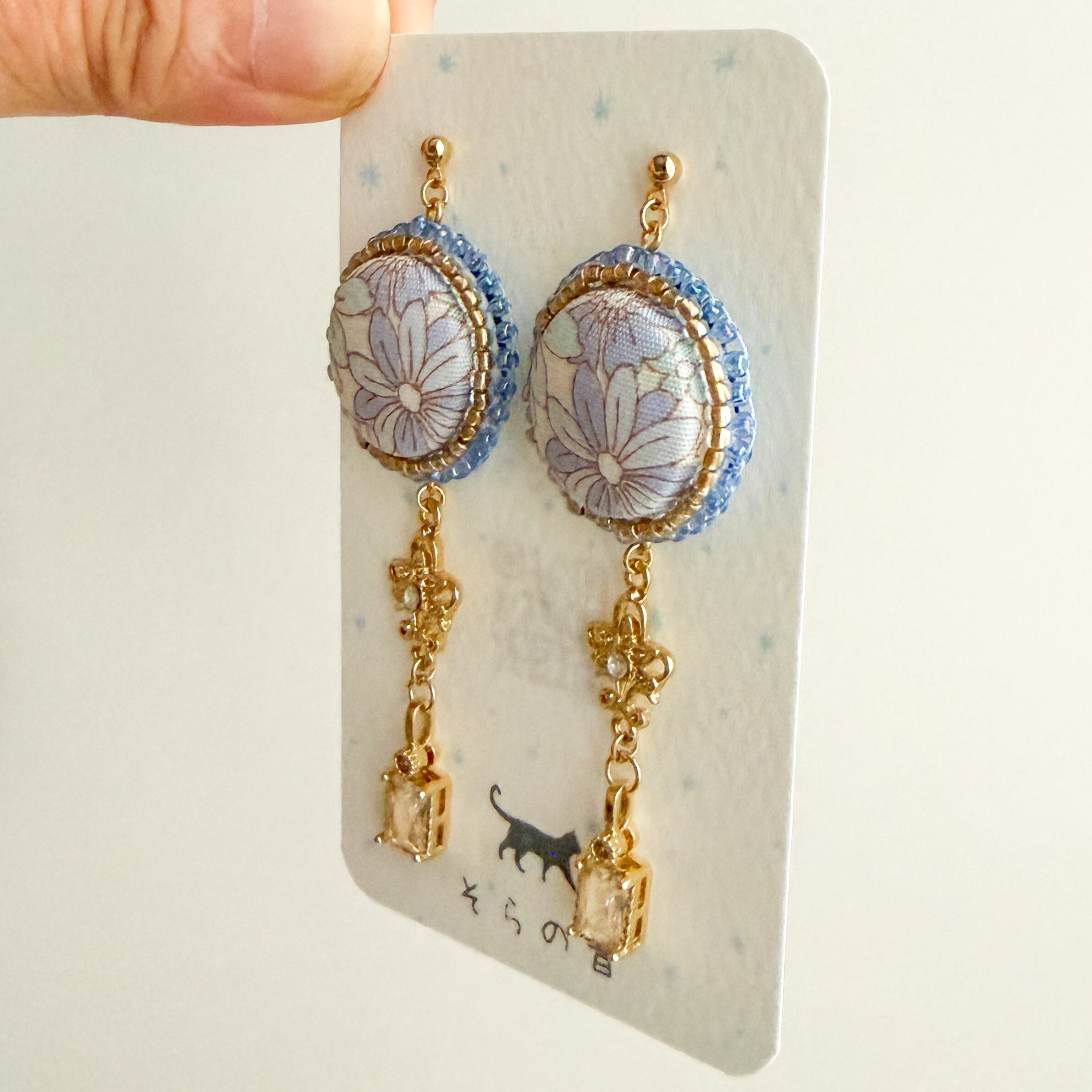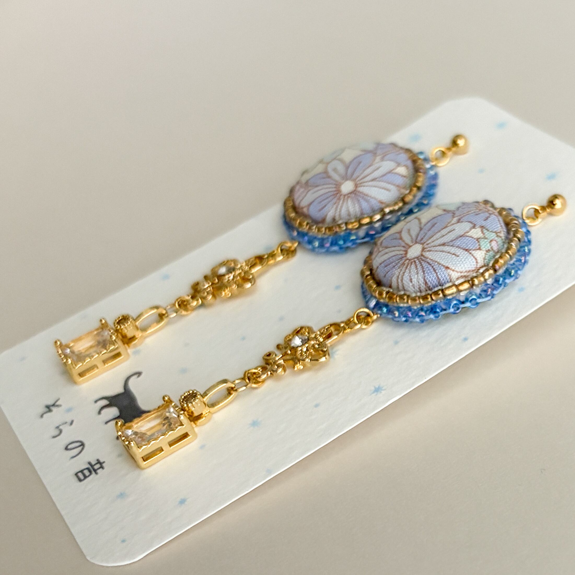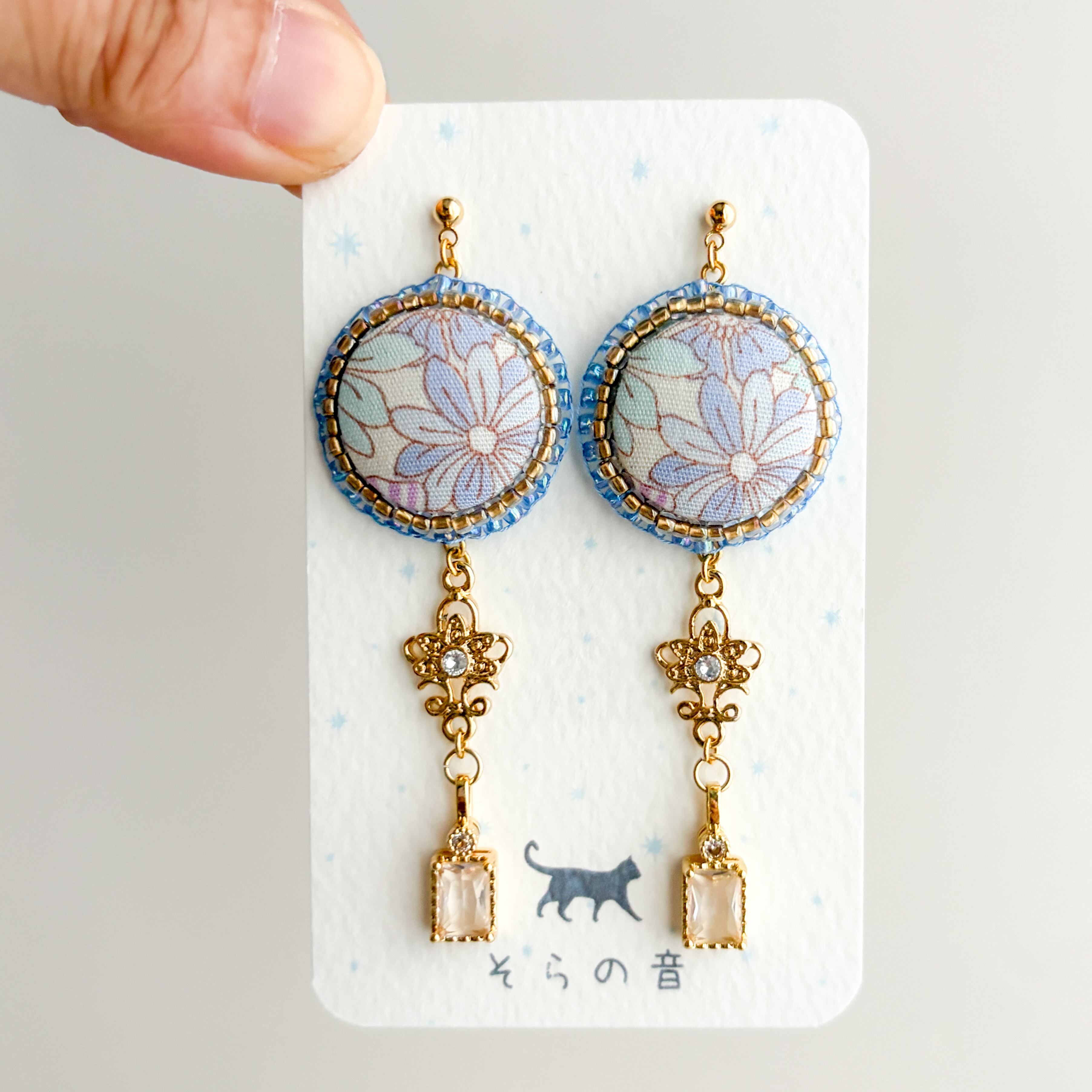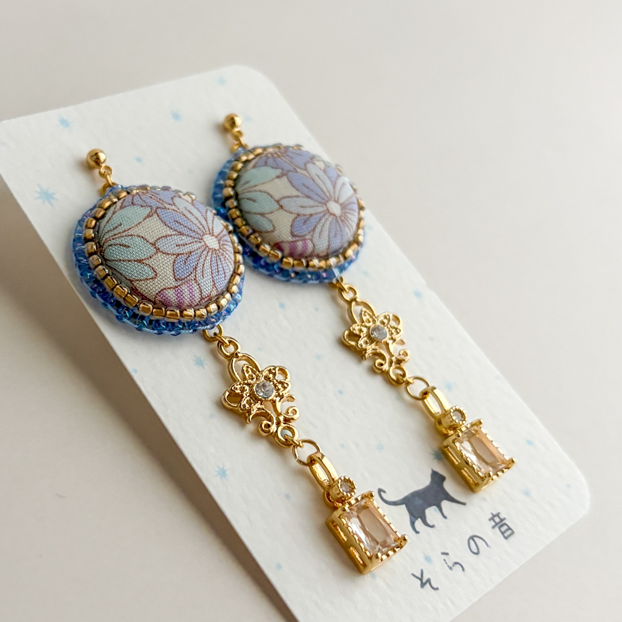 大人っぽい!淡い青い花のくるみボタンの耳飾り