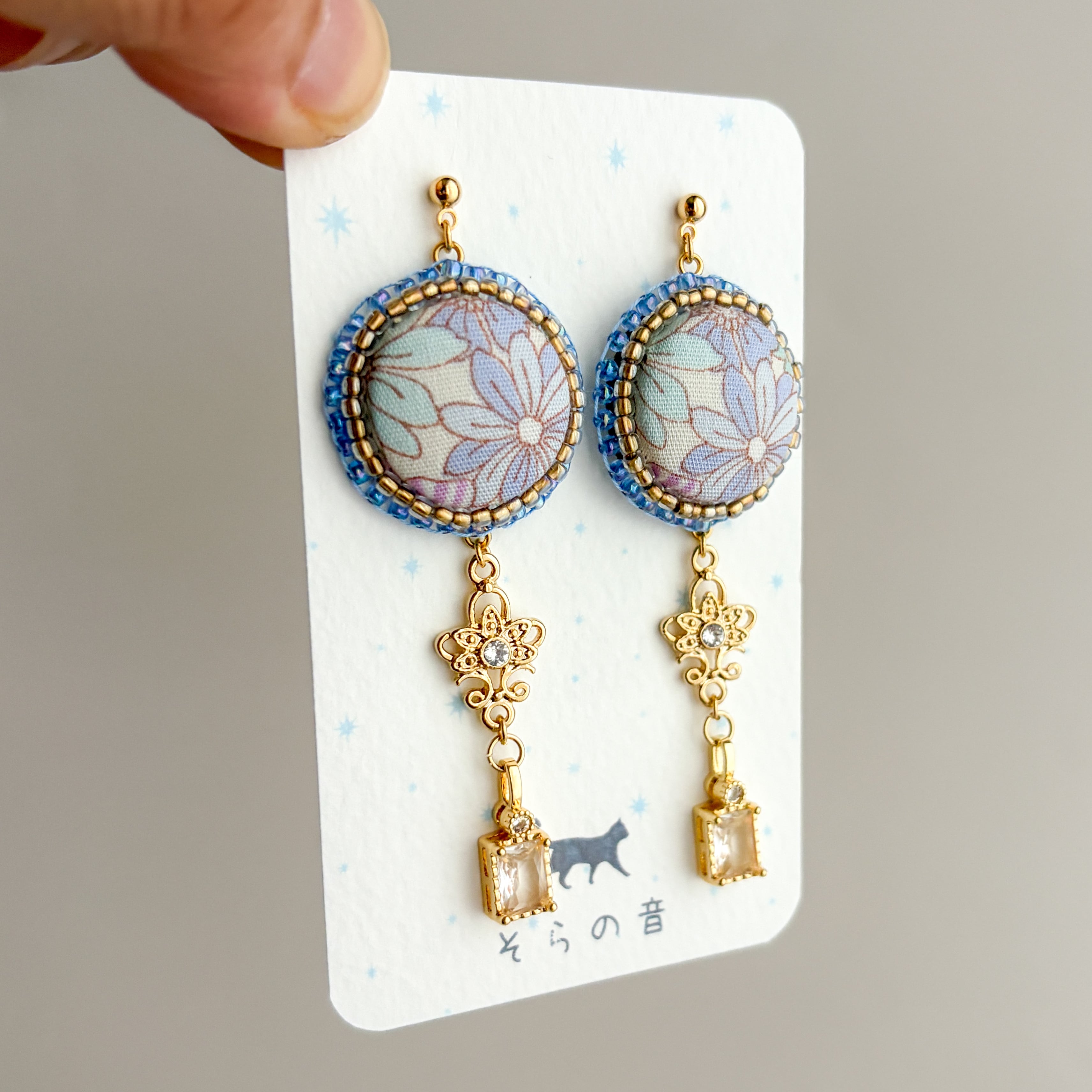 ・青い花のくるみボタンとチェコビーズの耳飾り