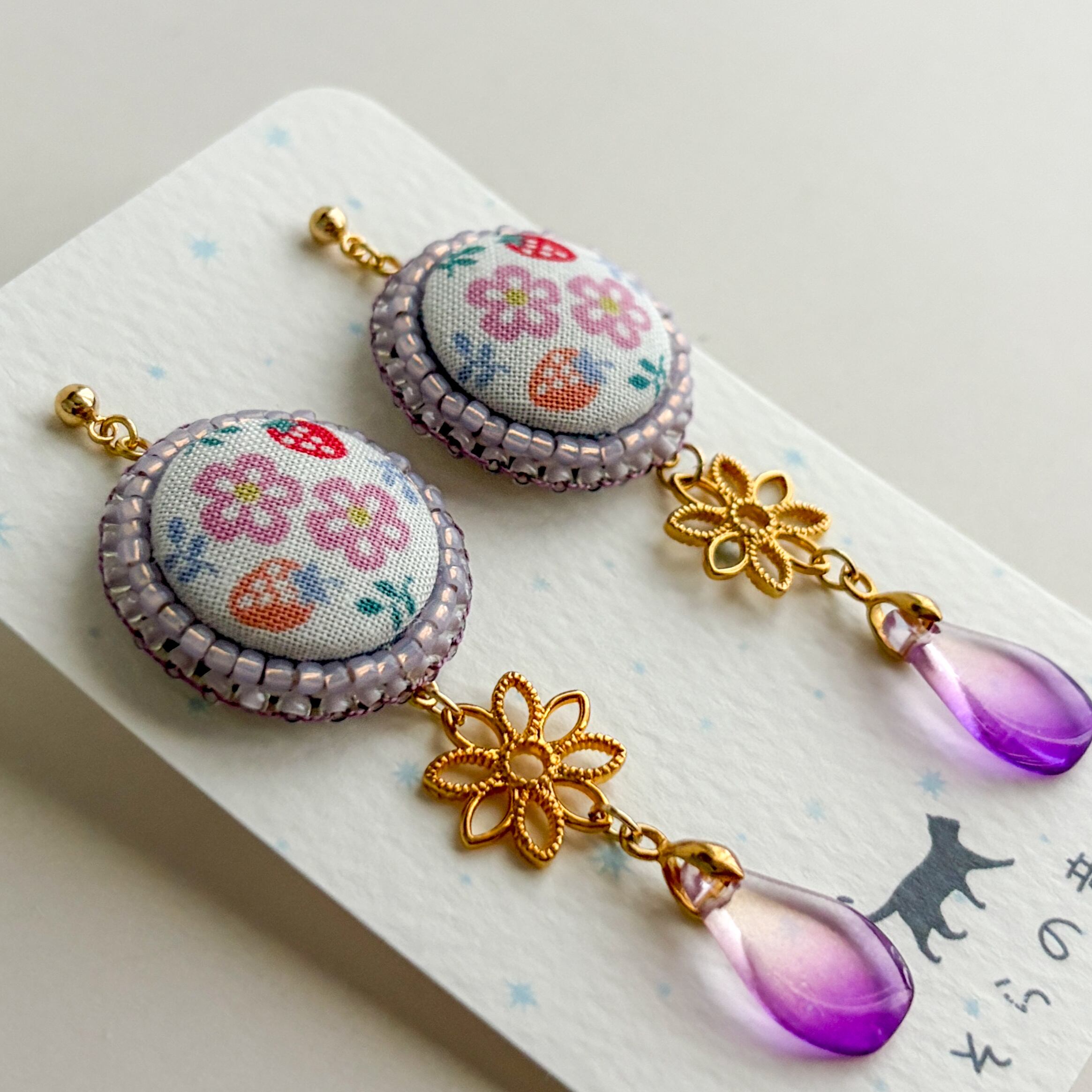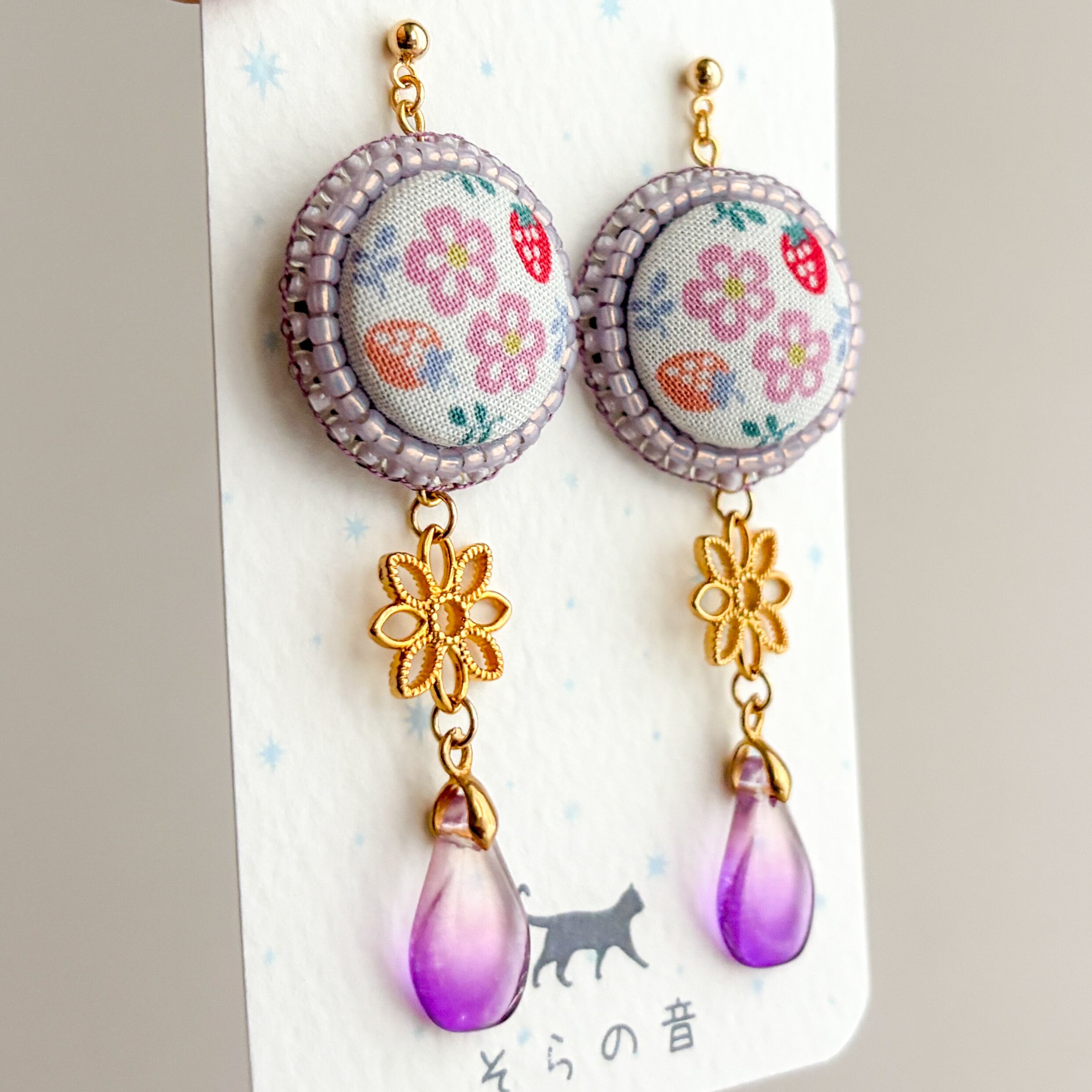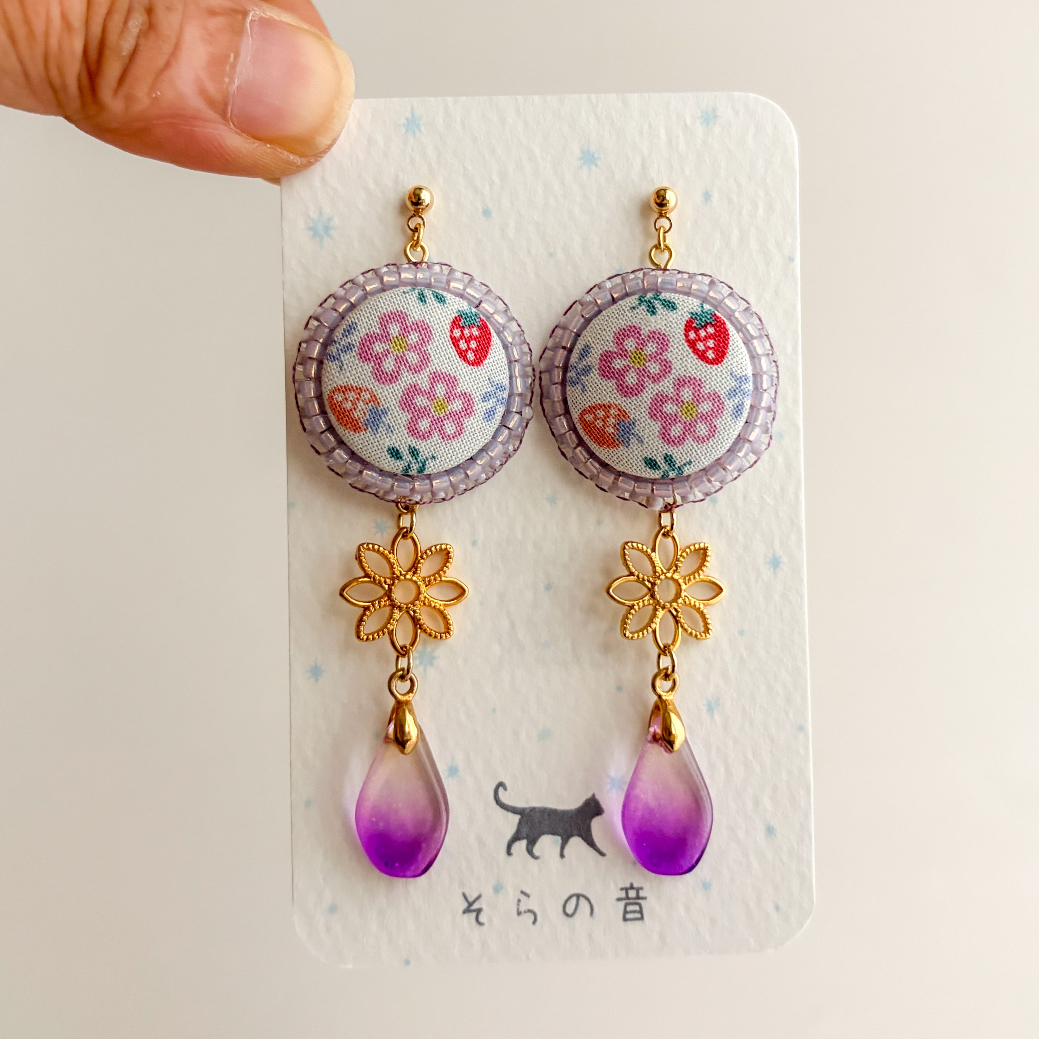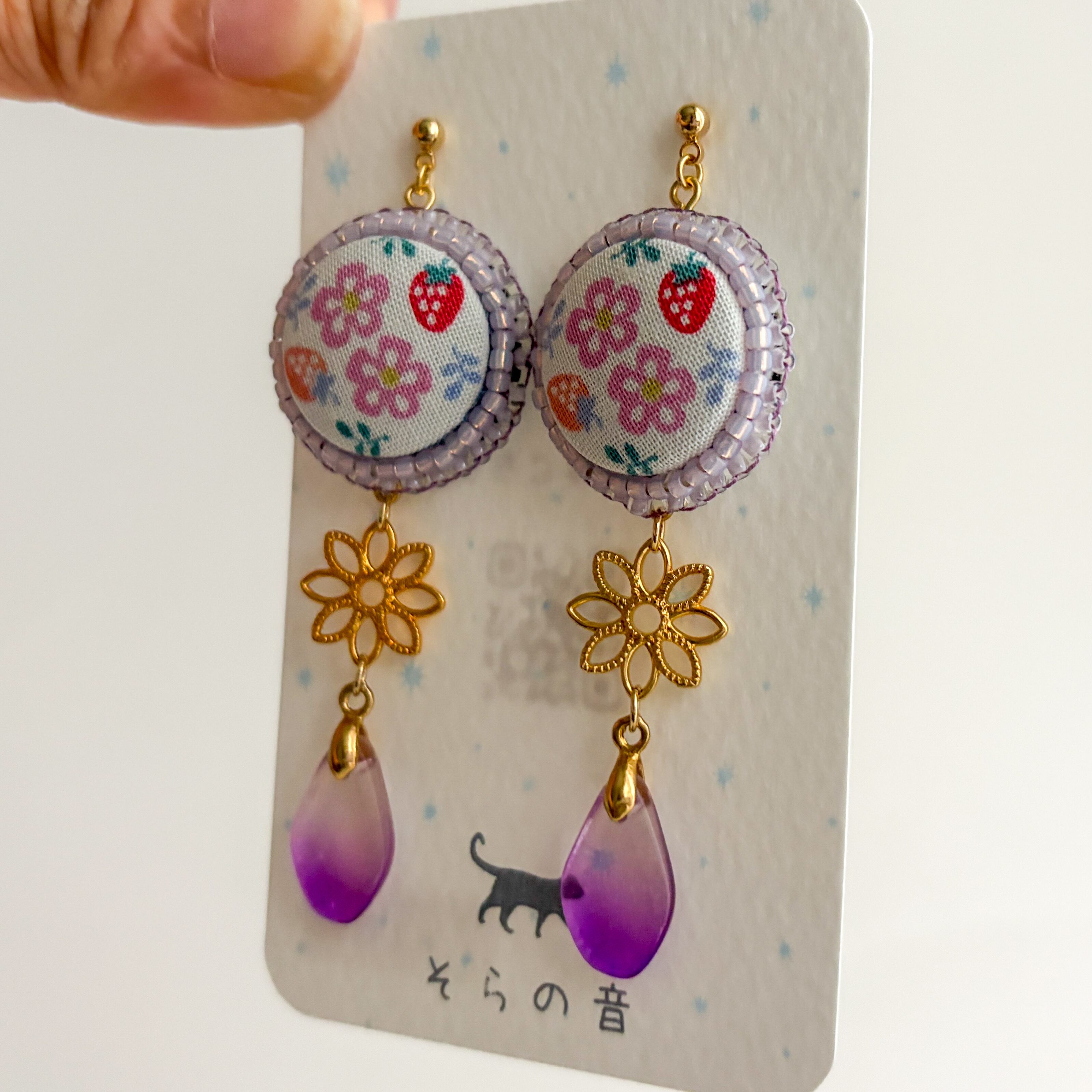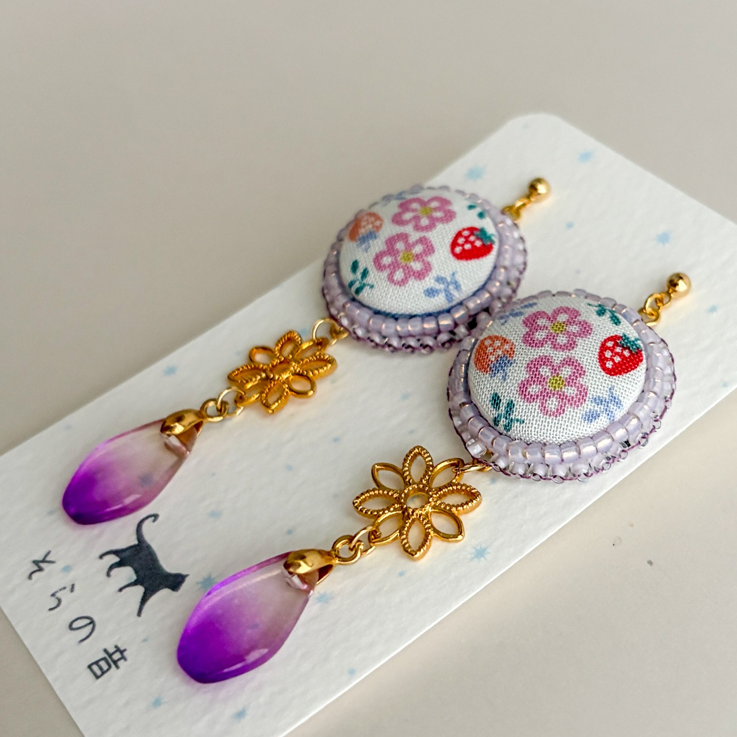 花といちごのくるみボタンの耳飾りです。