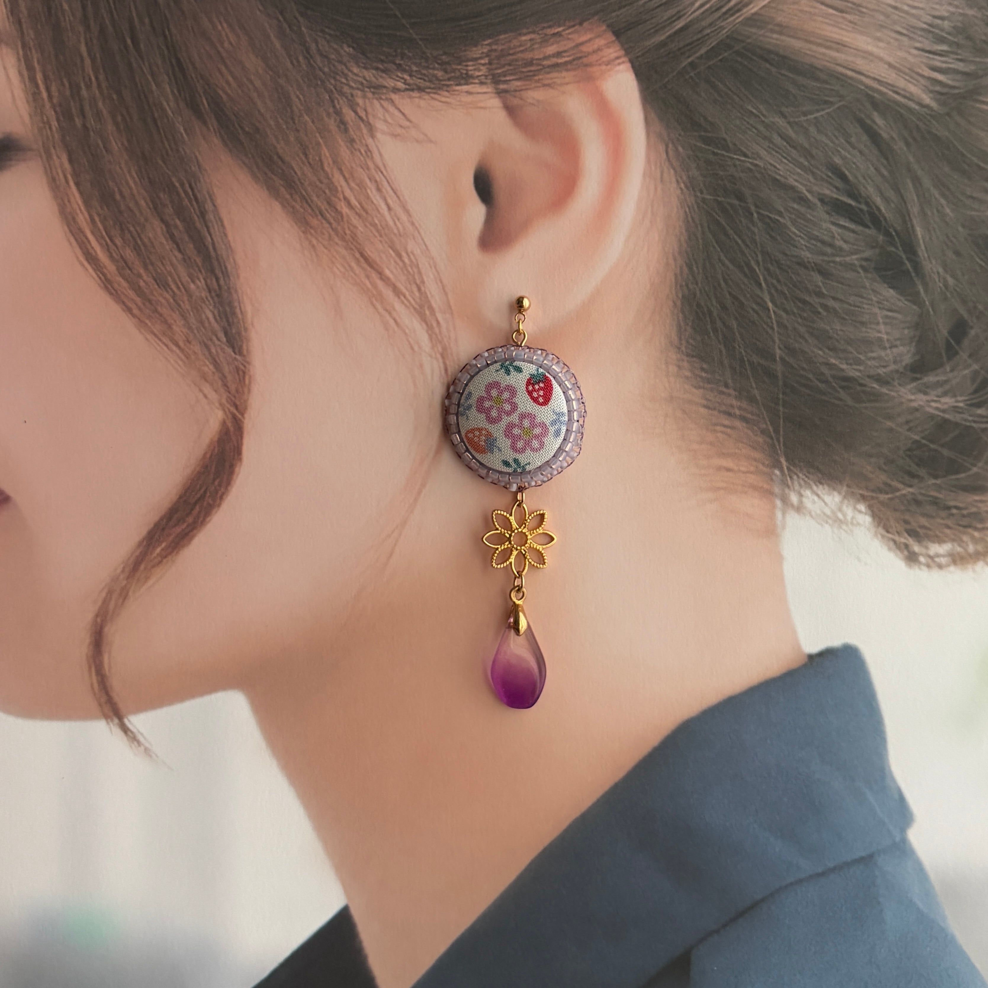 花といちごのくるみボタンの耳飾り