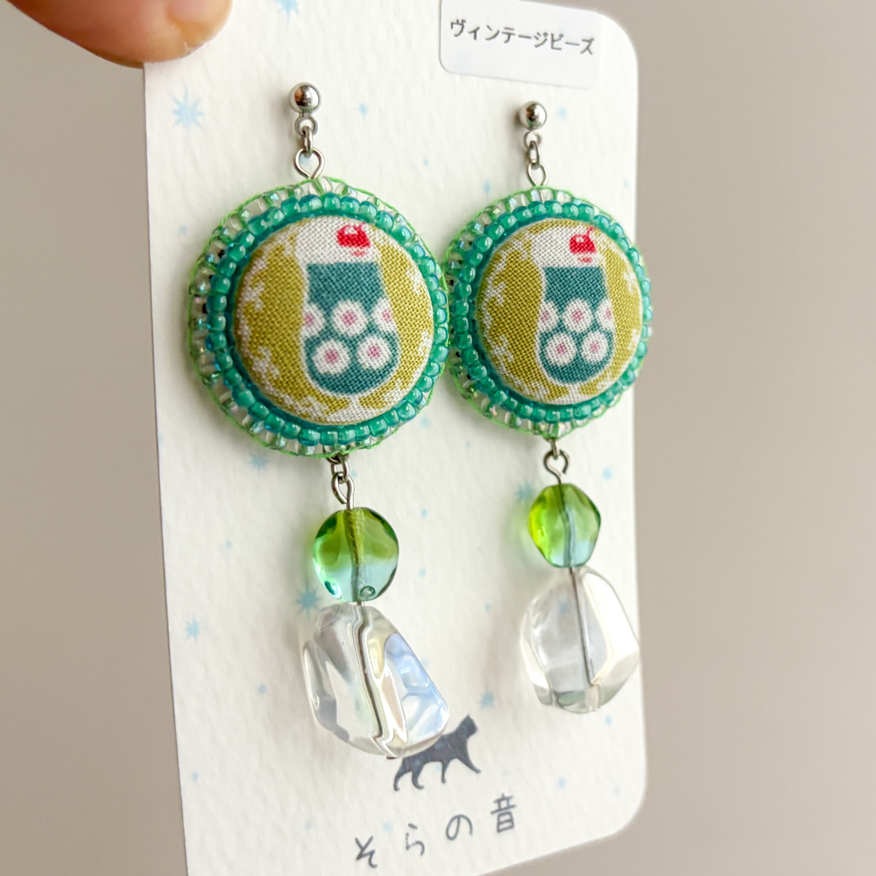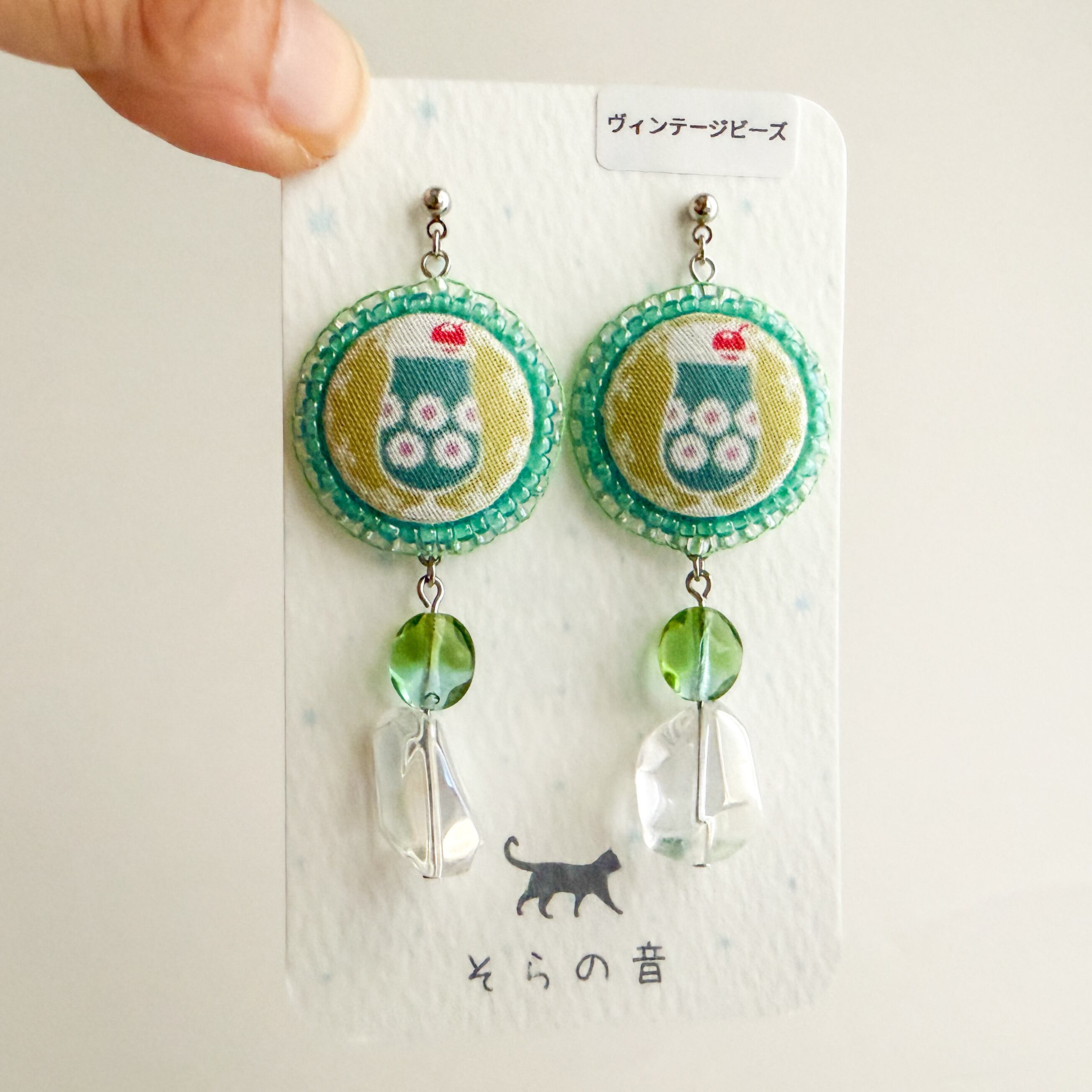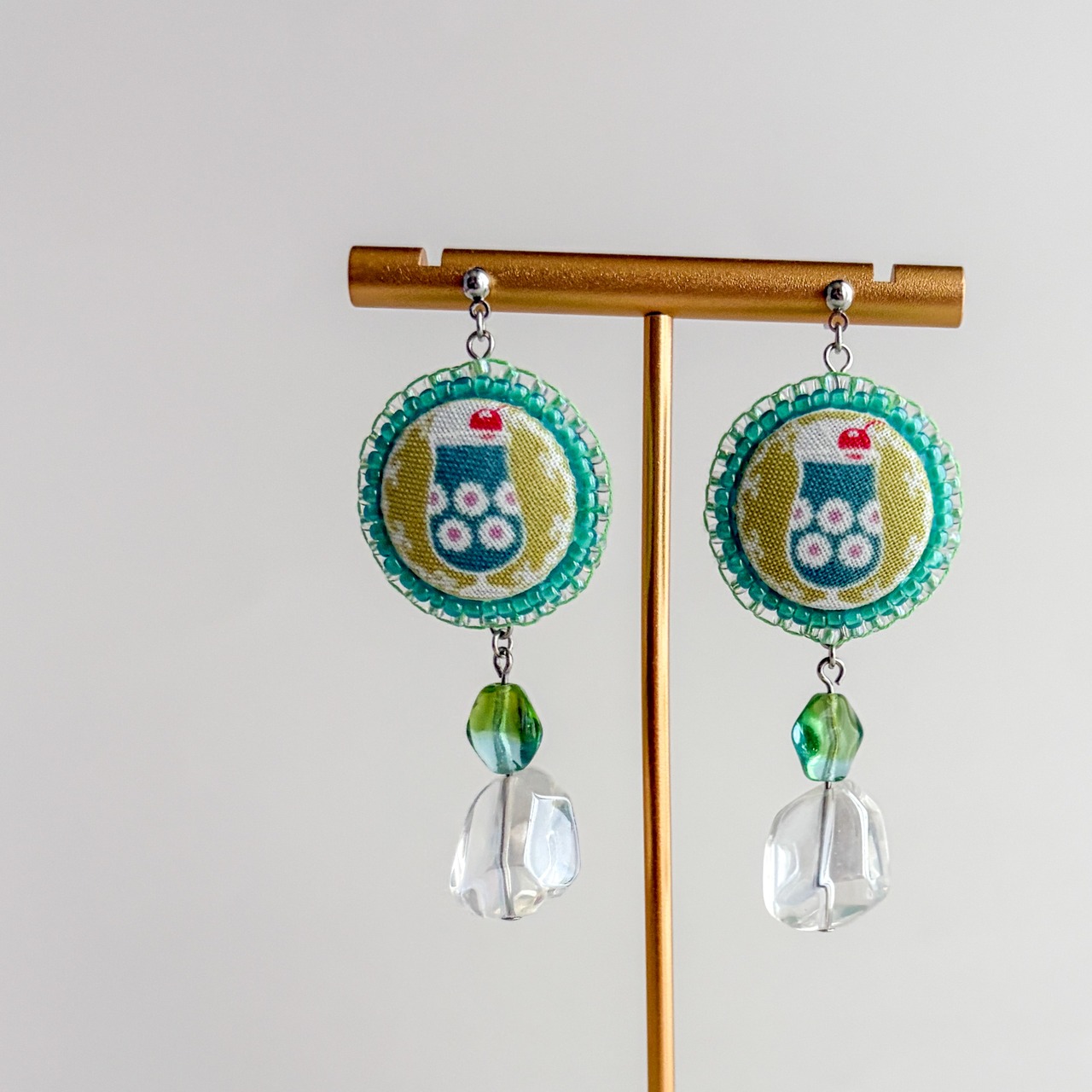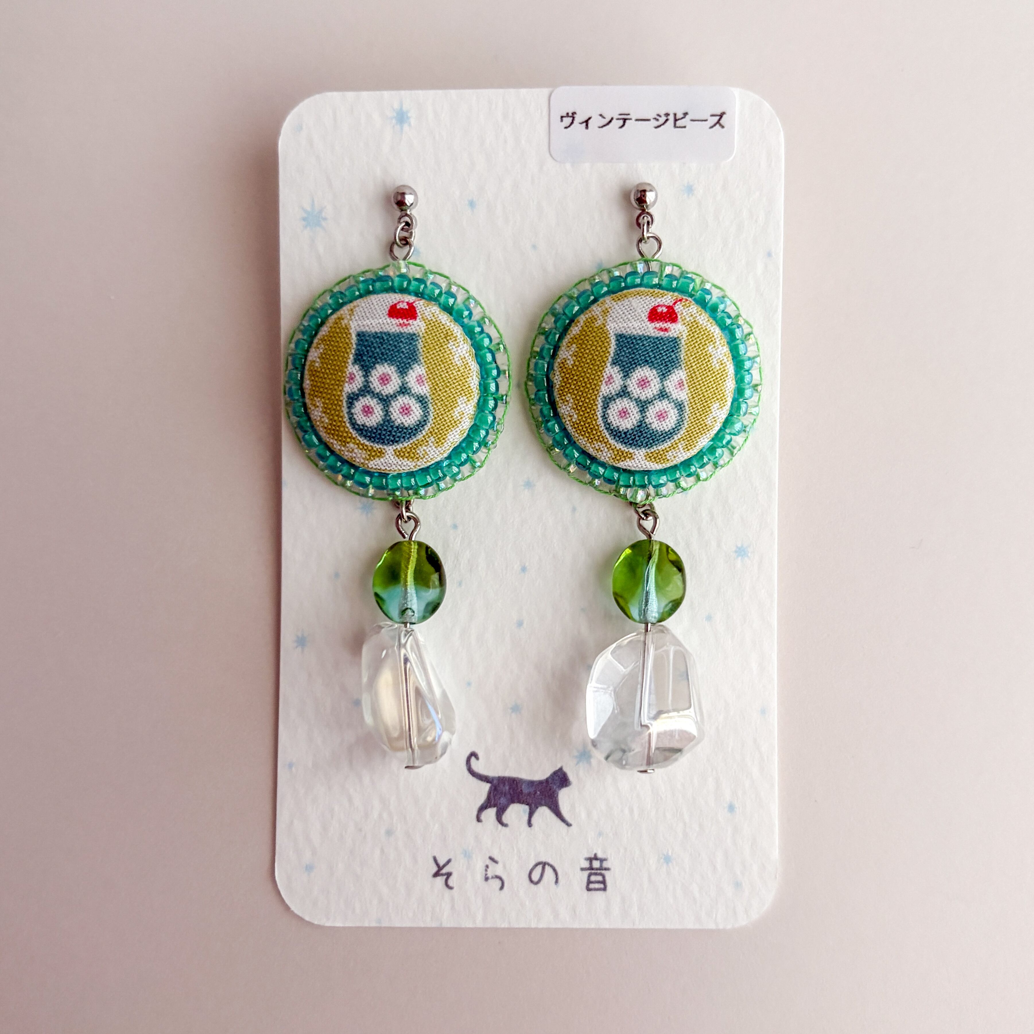 クリームソーダのくるみボタンとヴィンテージビーズの耳飾り