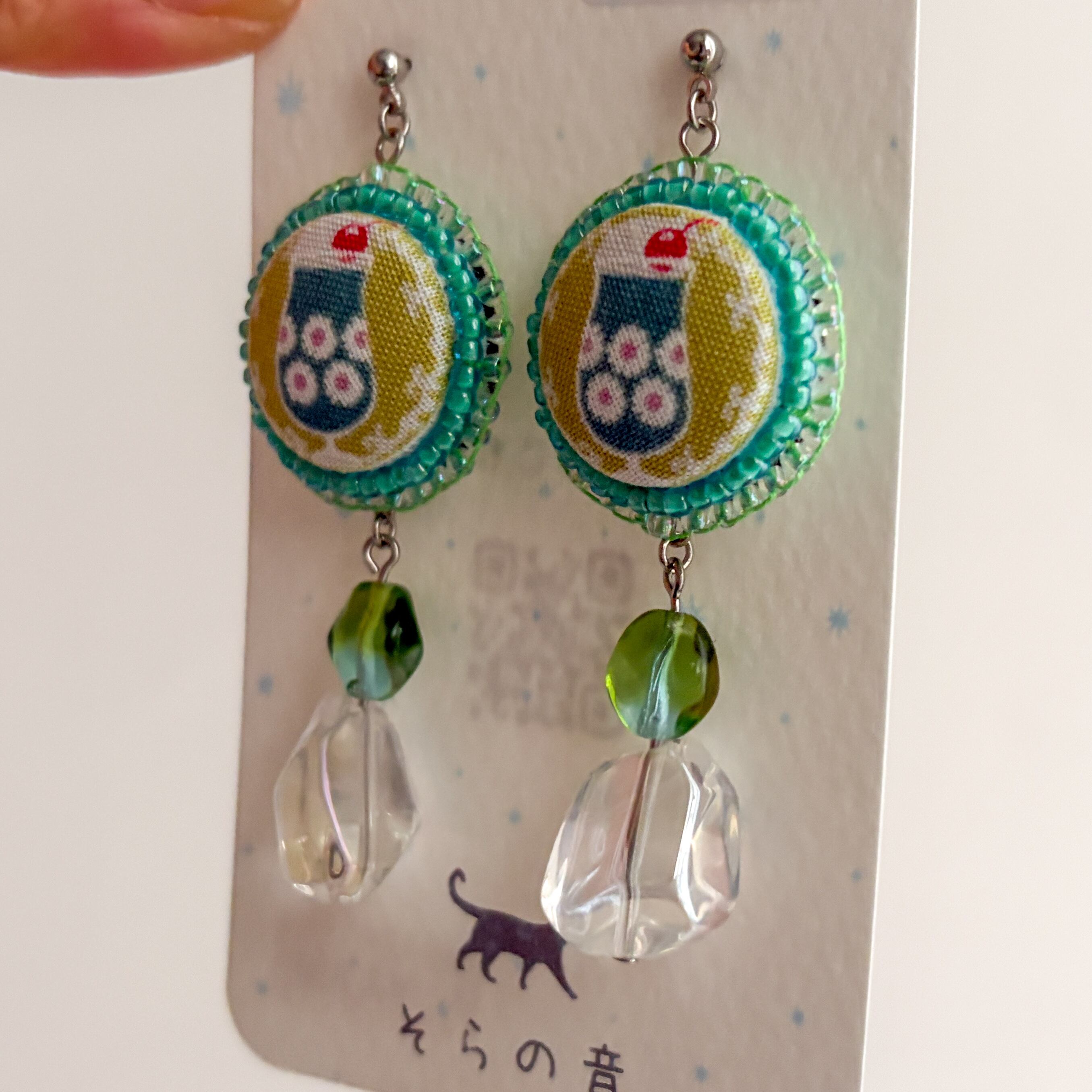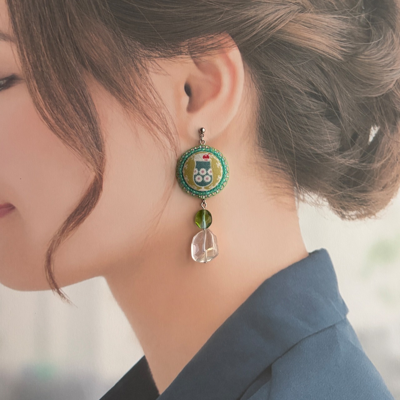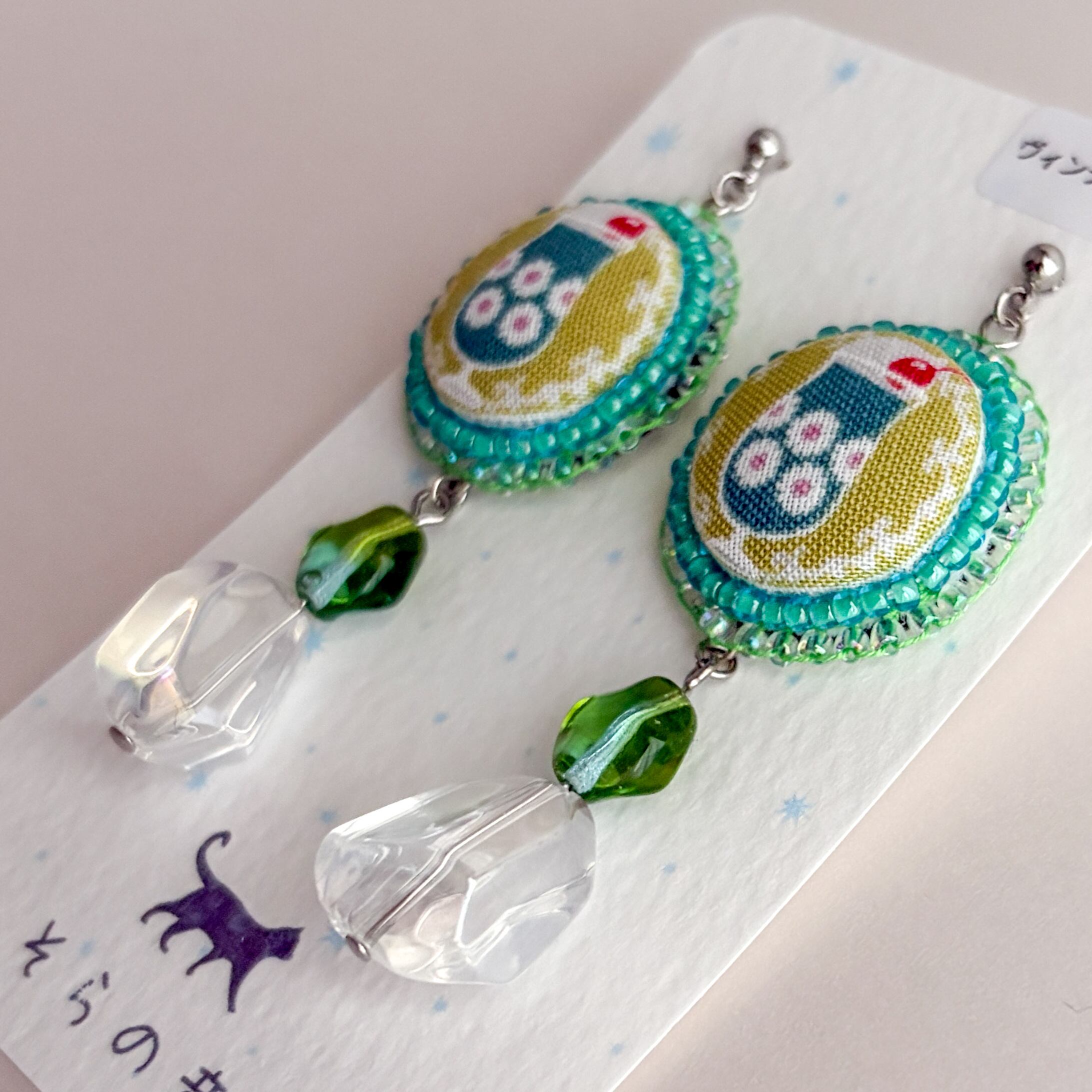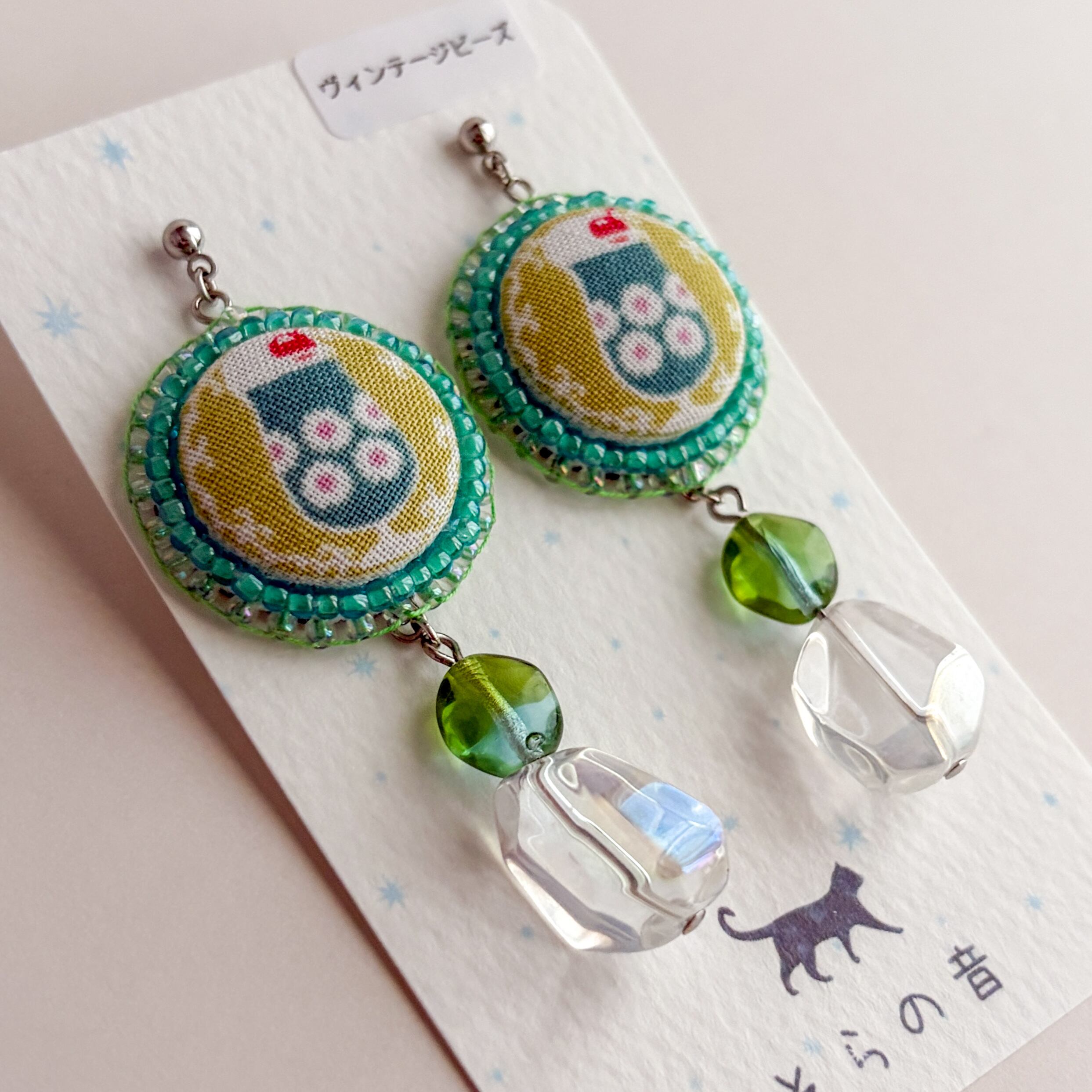クリームソーダのくるみボタンとヴィンテージビーズの耳飾り