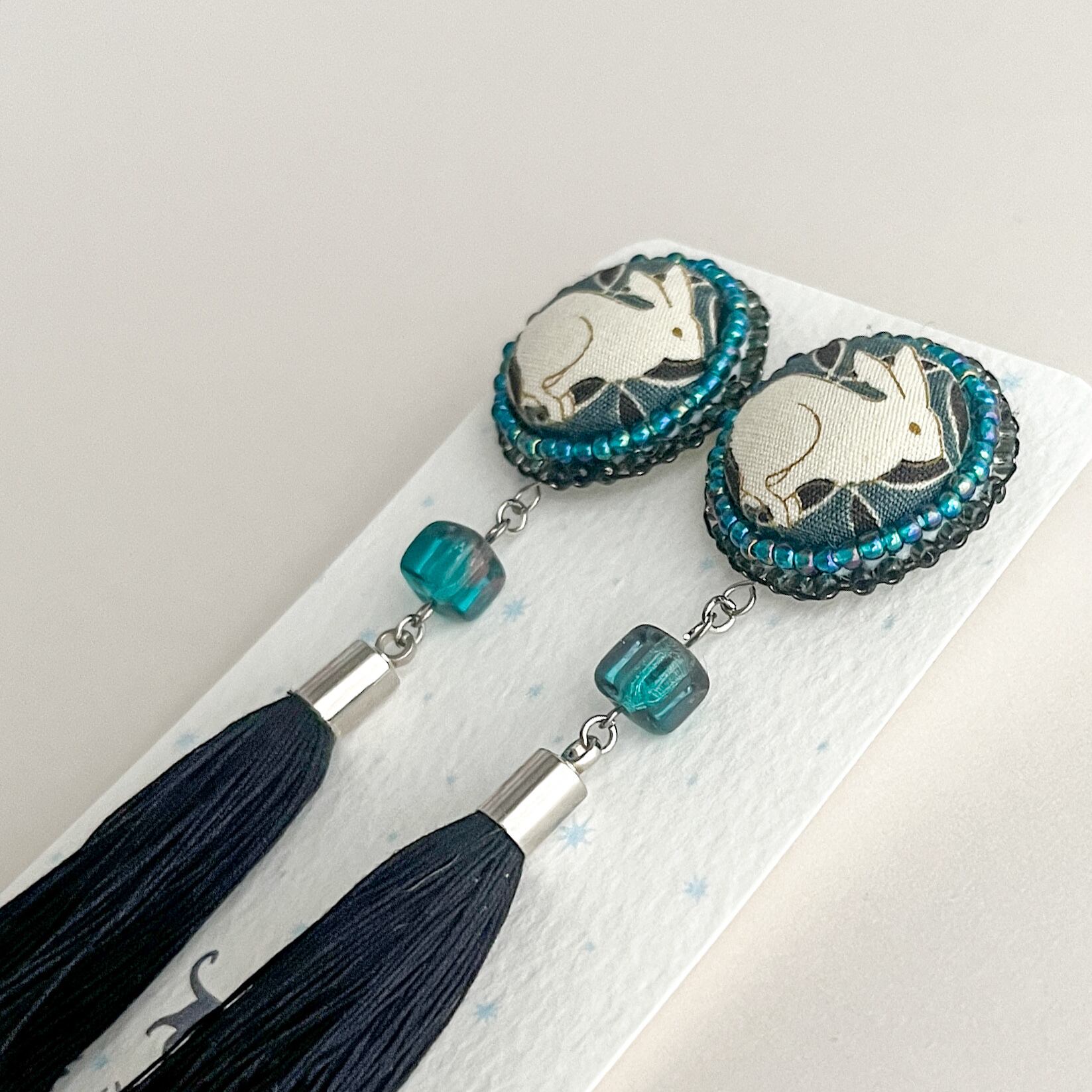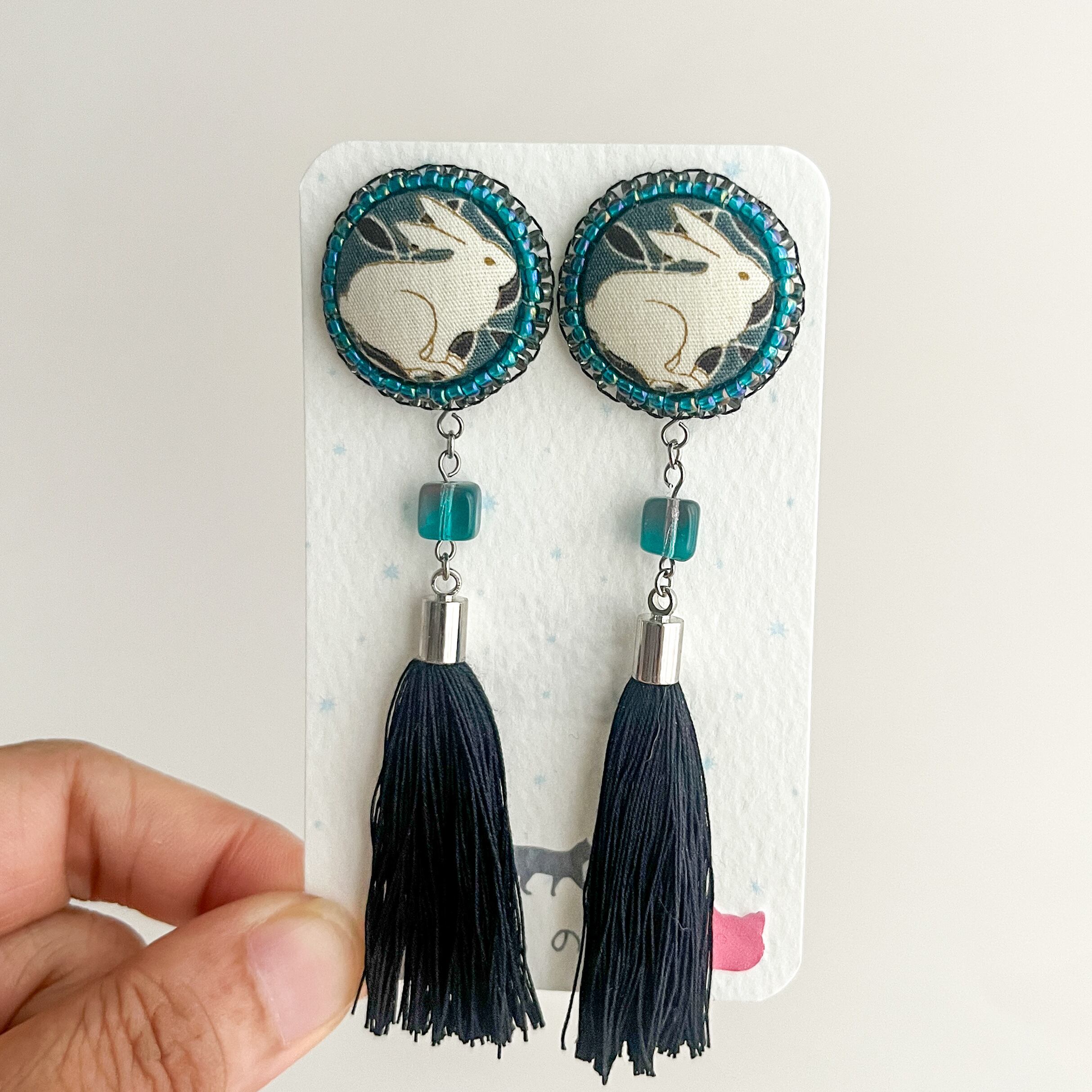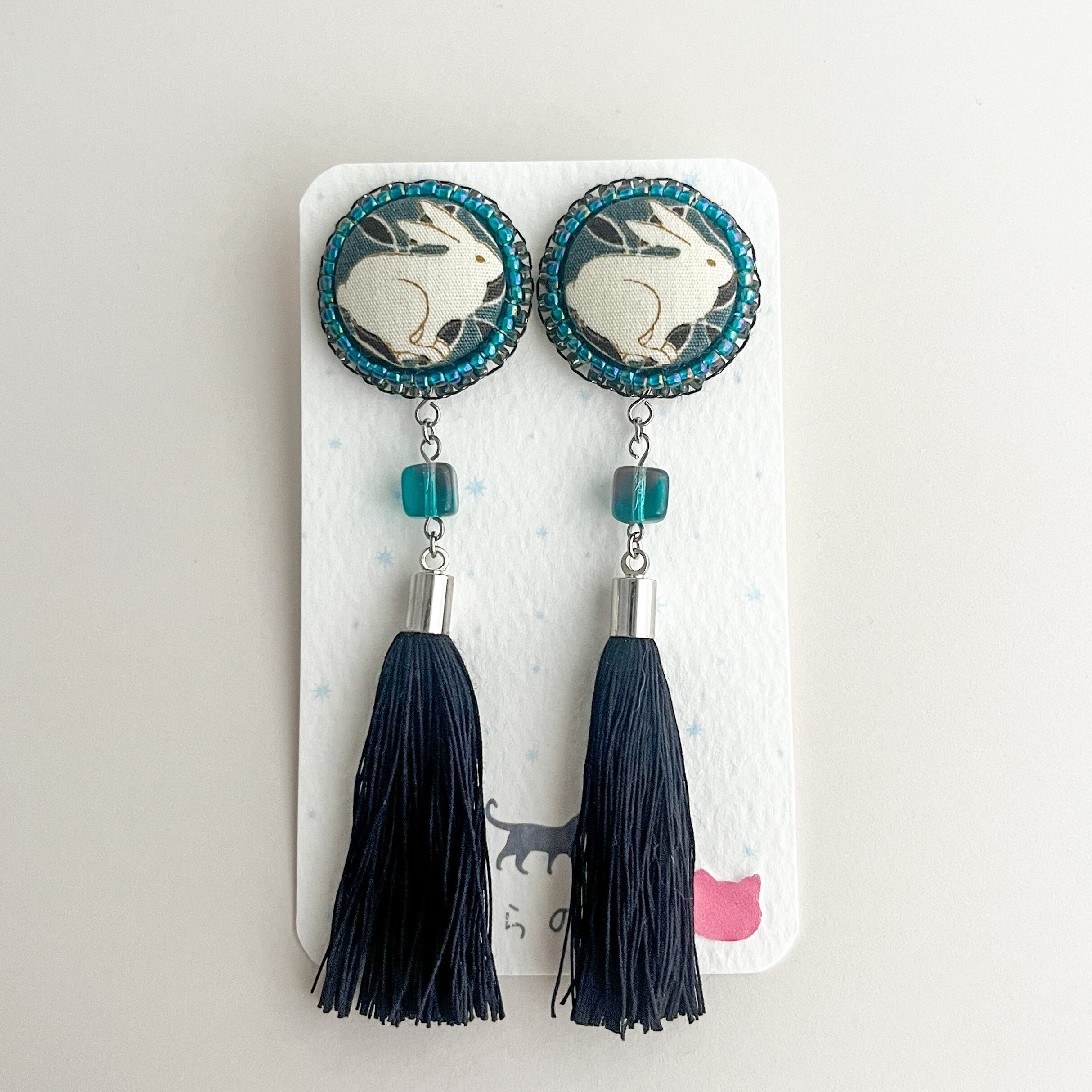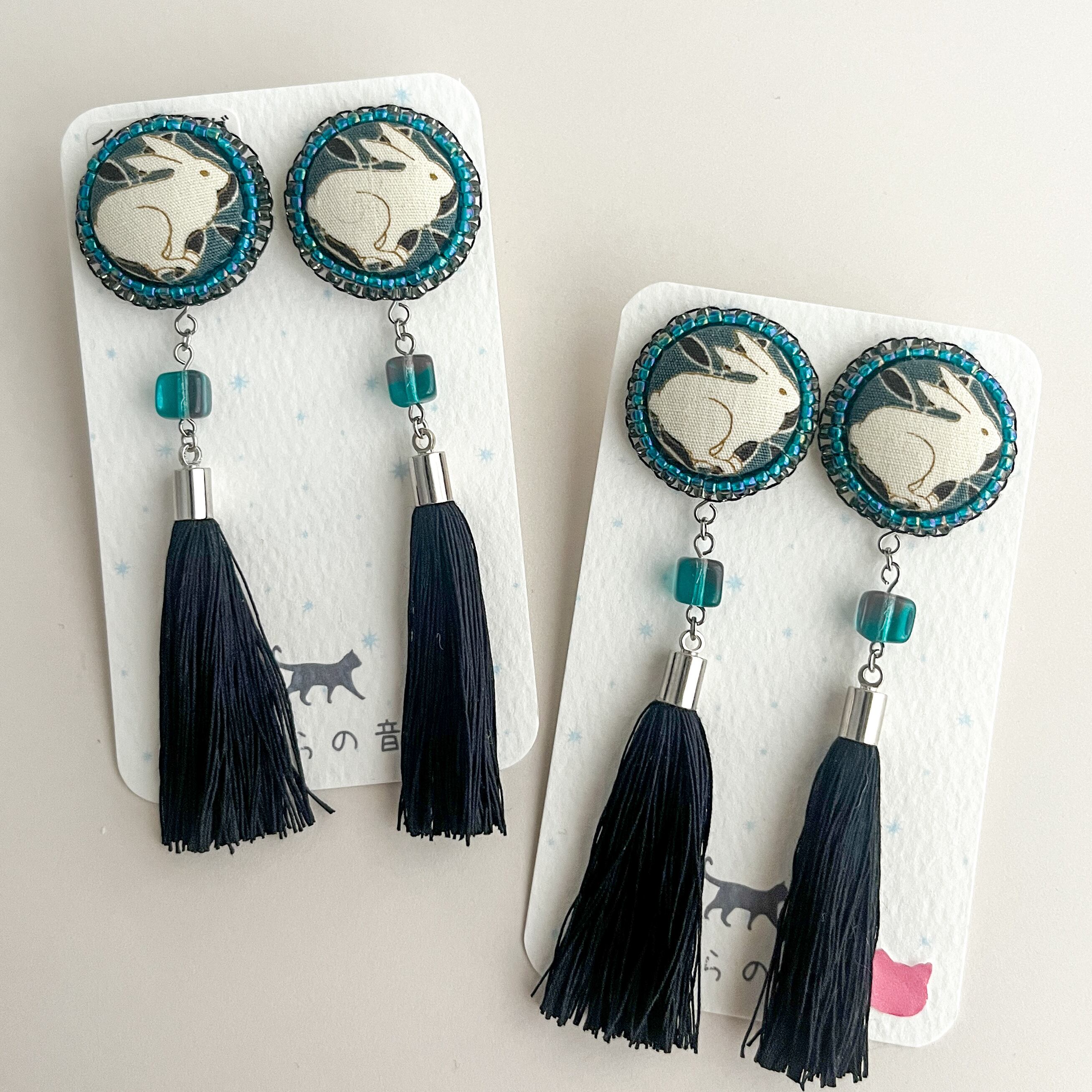 うさぎのくるみボタンとタッセルの耳飾りです。