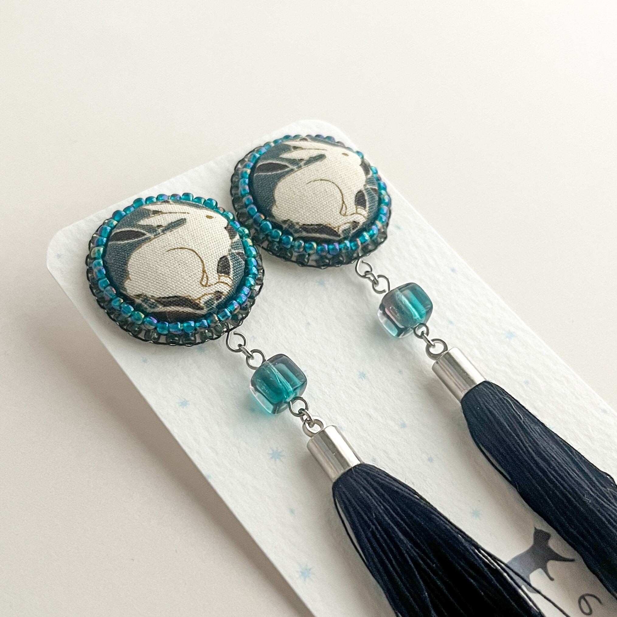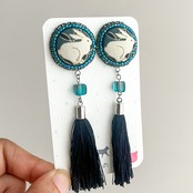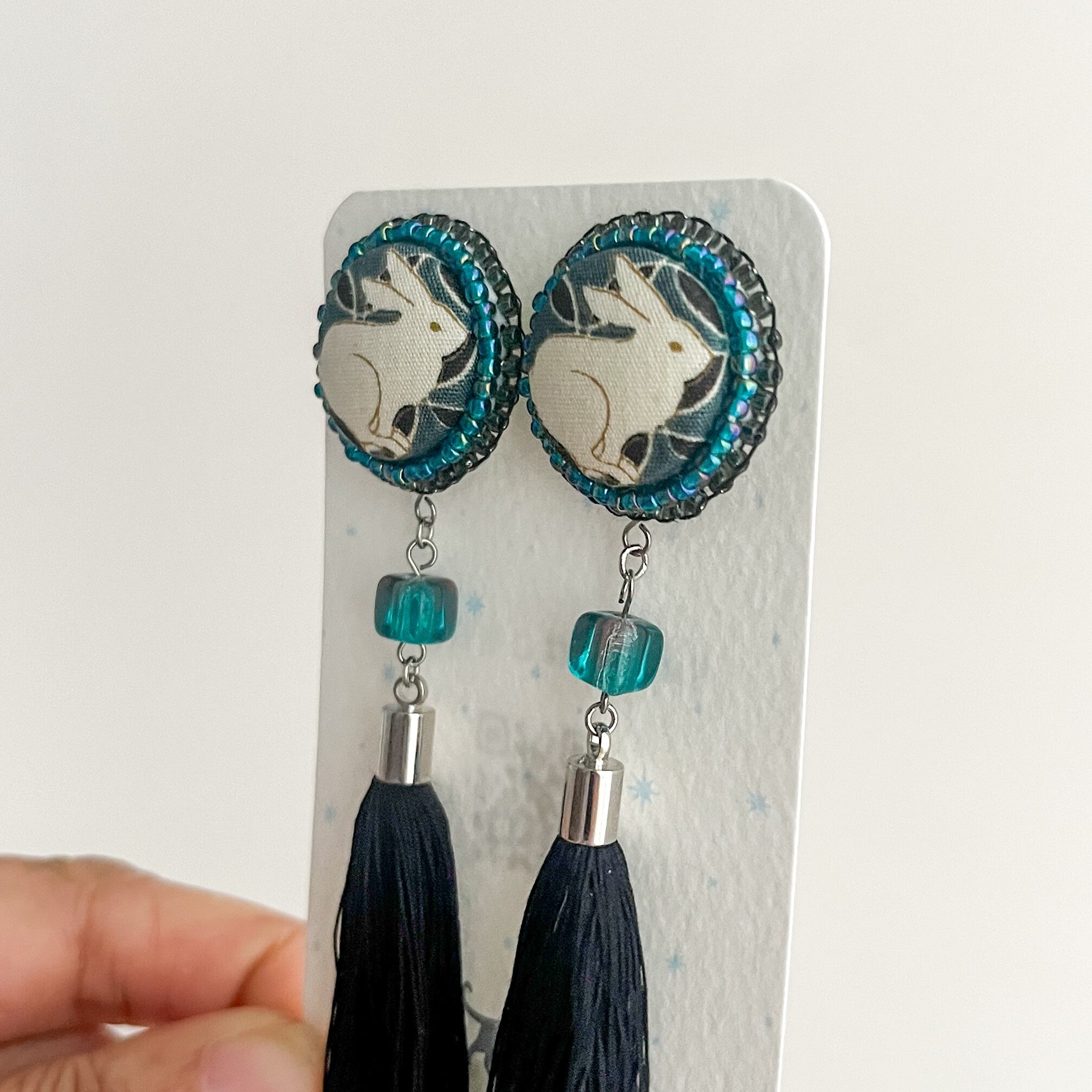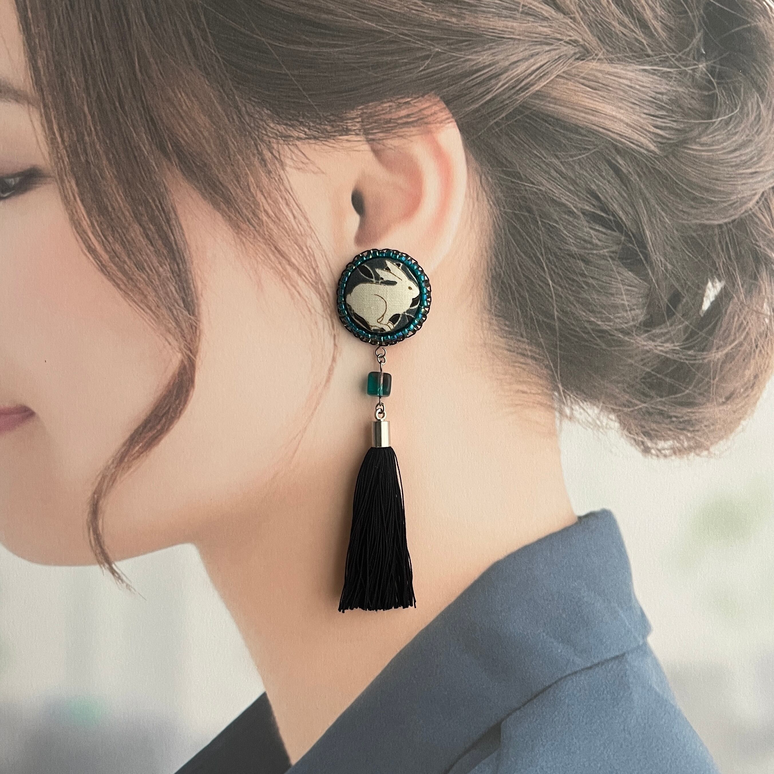うさぎのくるみボタンとタッセルの耳飾りです。