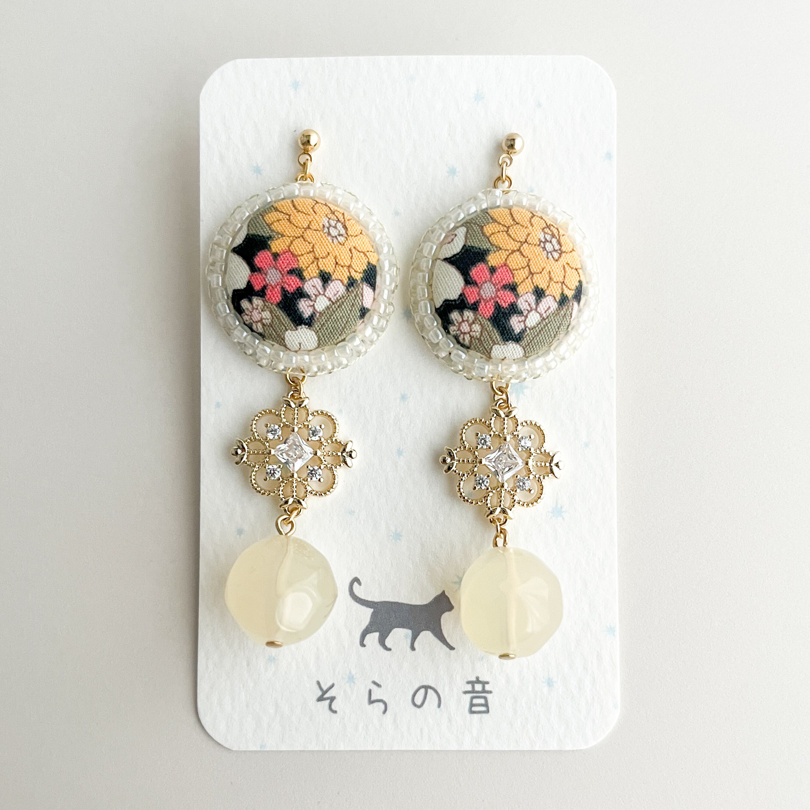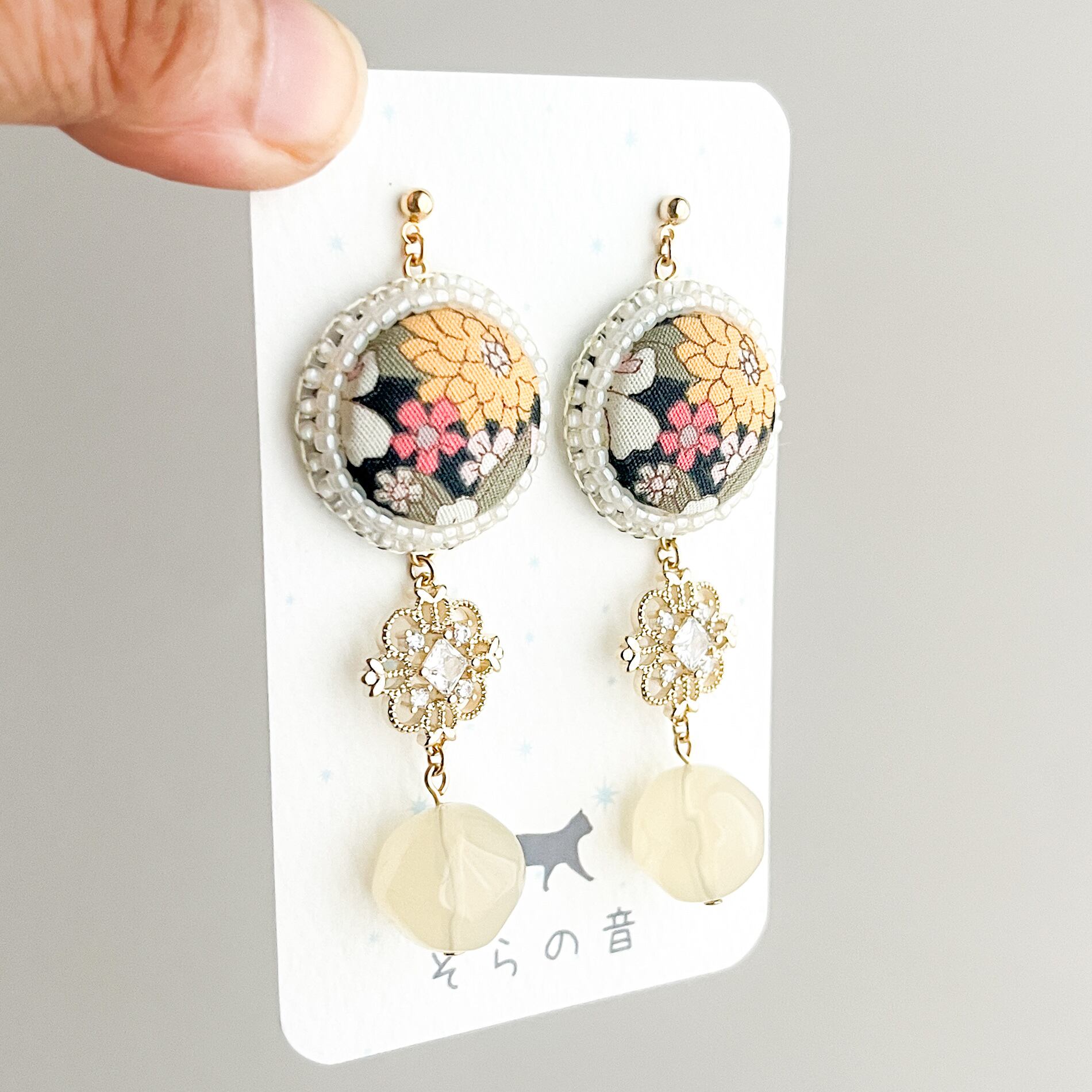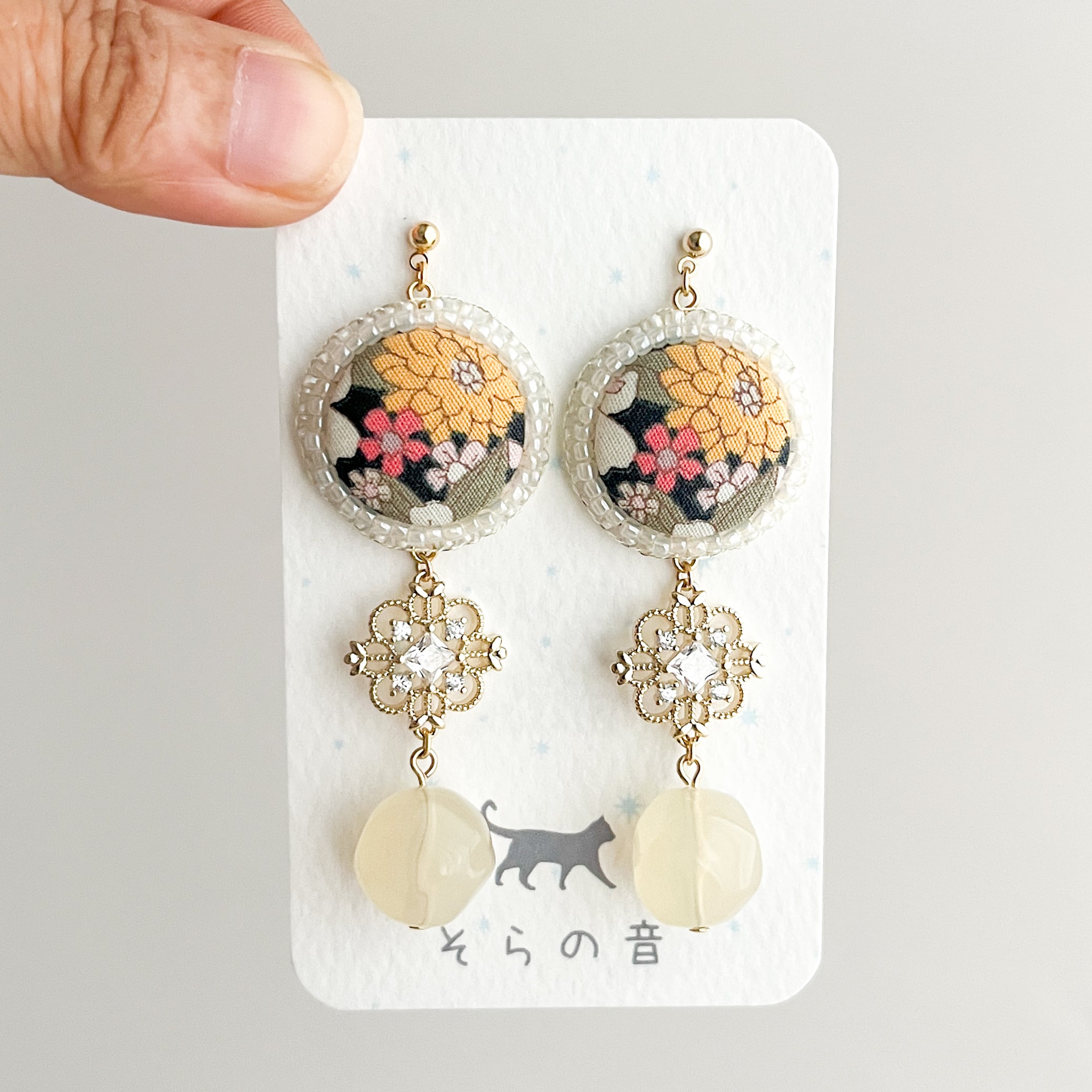 ・レトロな雰囲気の花のくるみボタンとヴィンテージビーズの耳飾り
