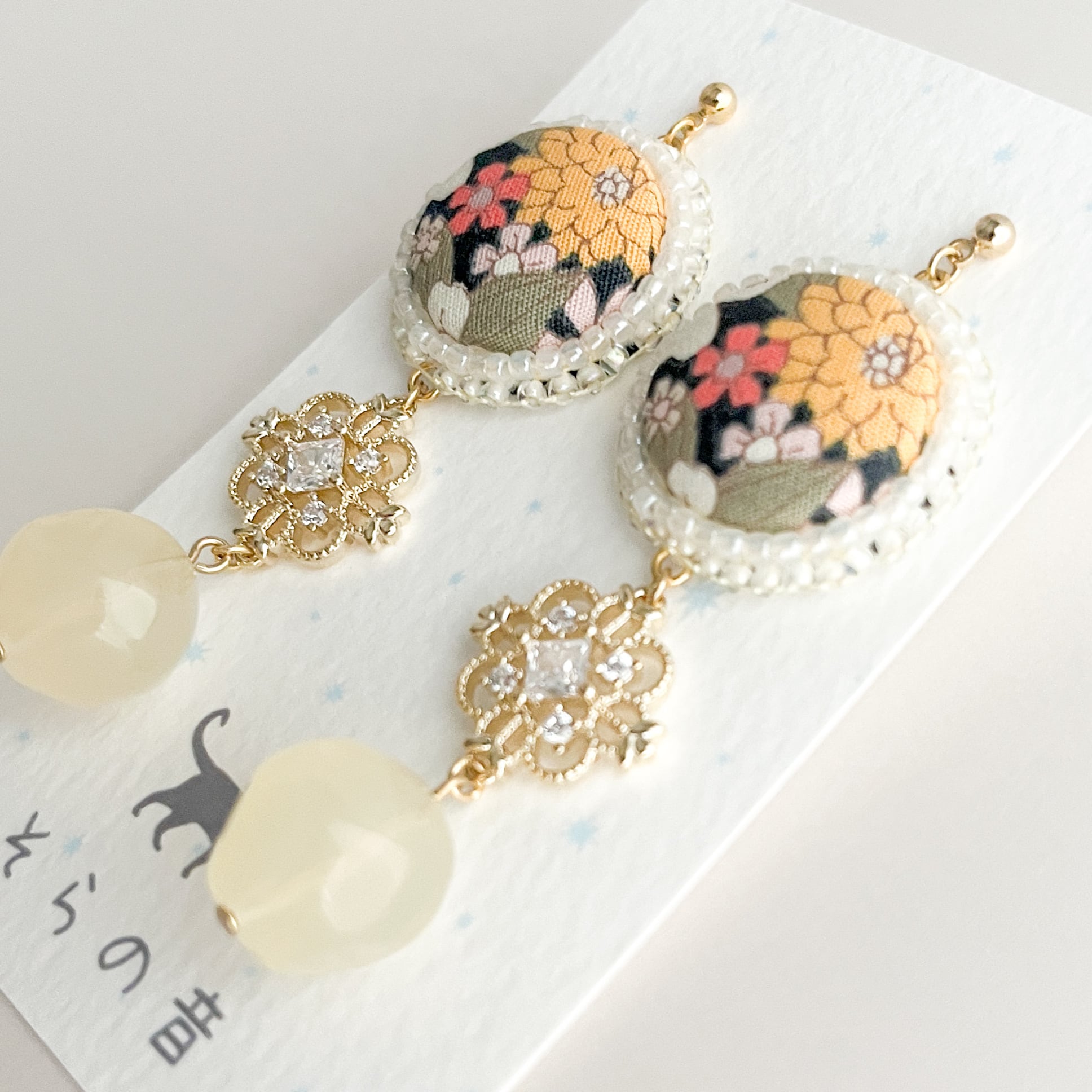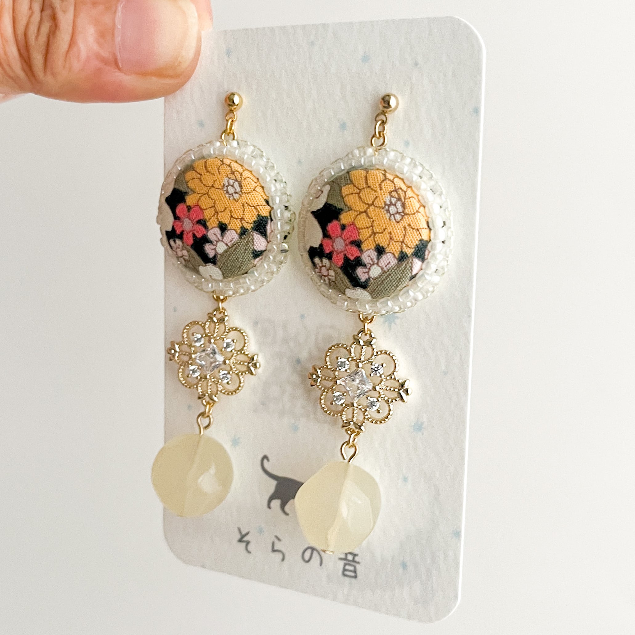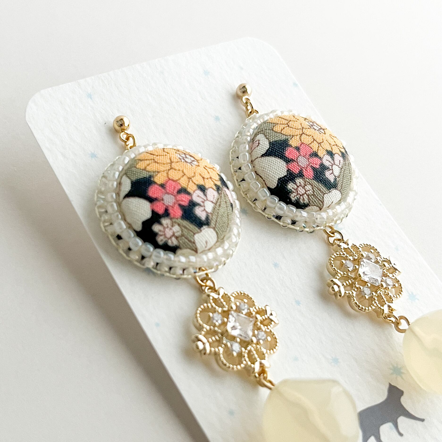 ・レトロな雰囲気の花のくるみボタンとヴィンテージビーズの耳飾り