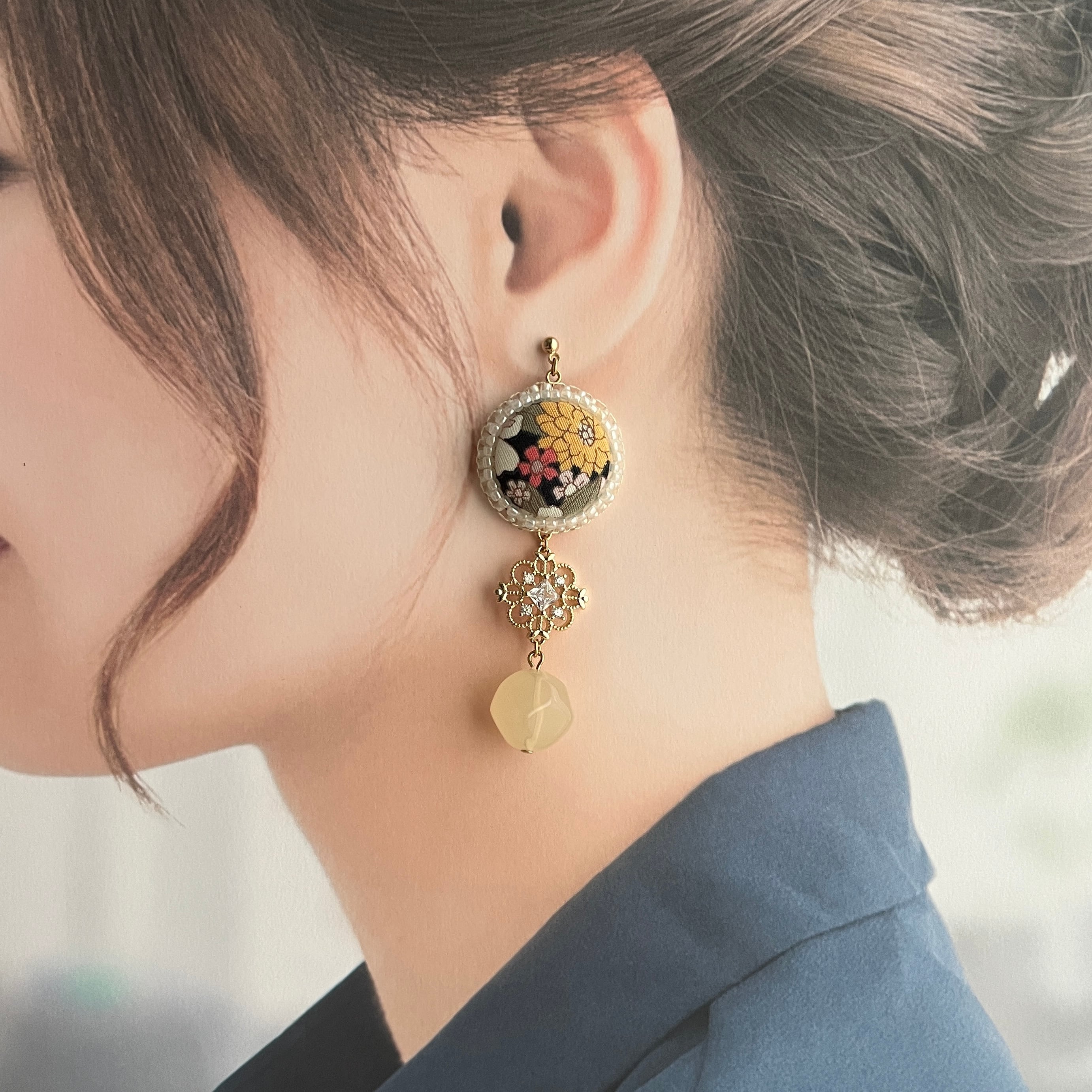 黒が良いアクセント!黄色の花のくるみボタンの耳飾り
