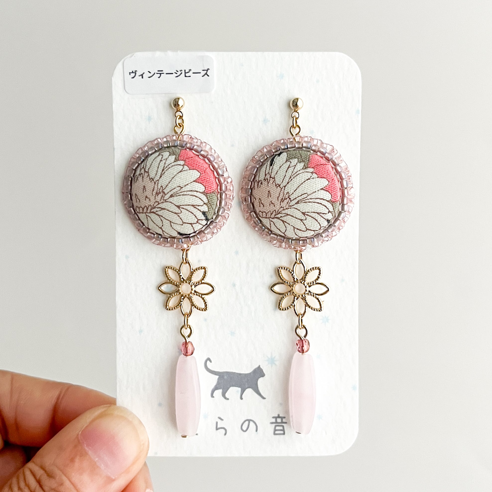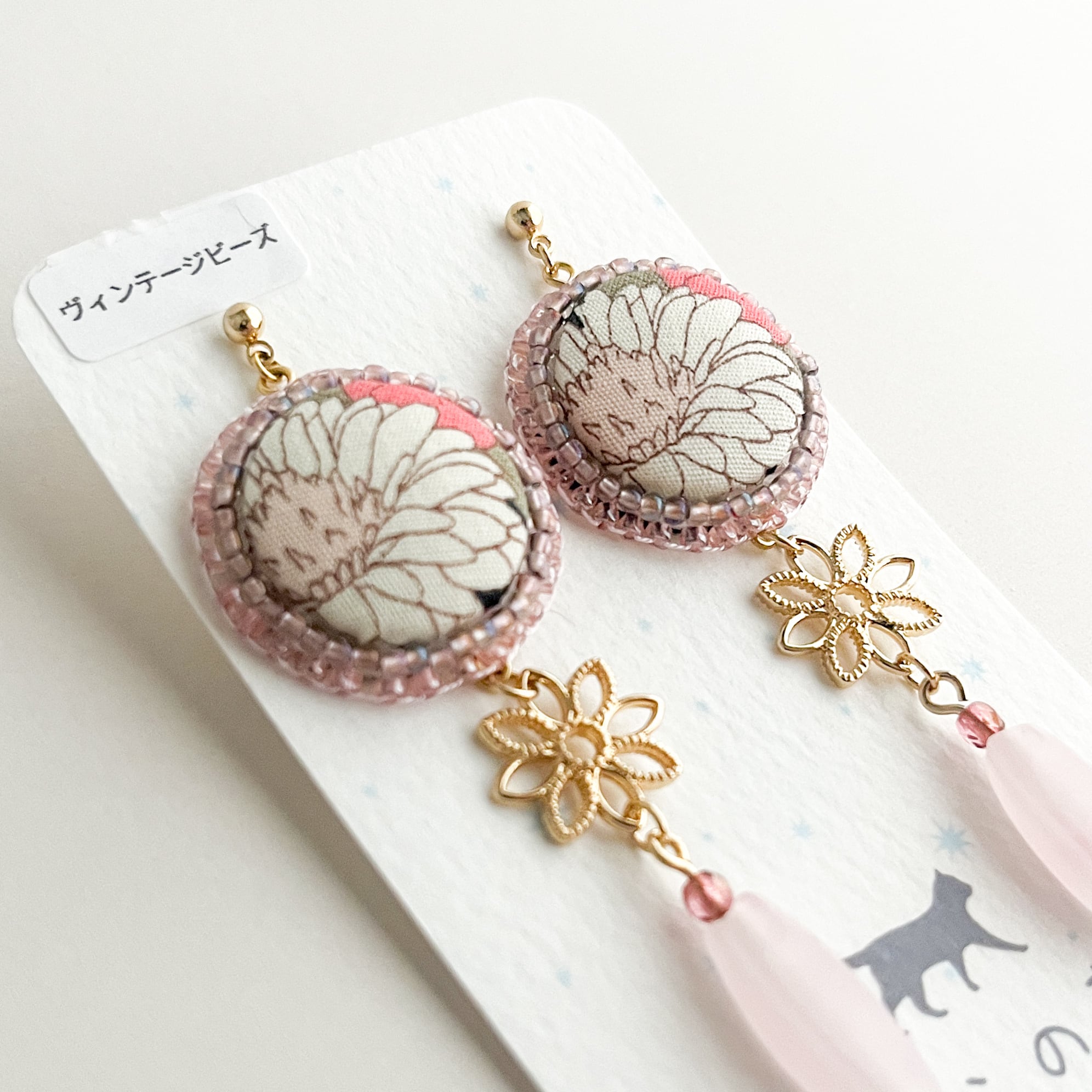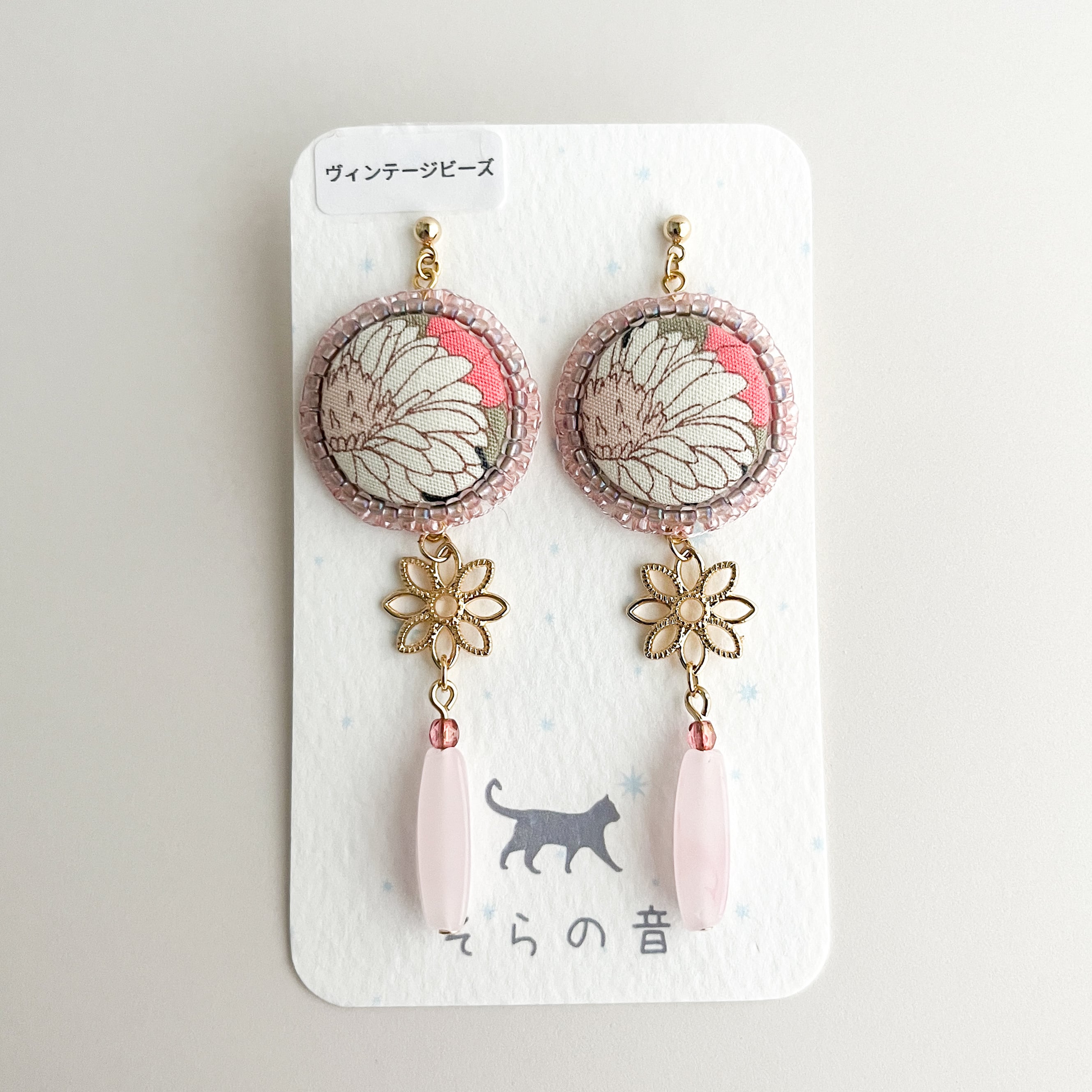 レトロな雰囲気の花のくるみボタンとヴィンテージビーズの耳飾り