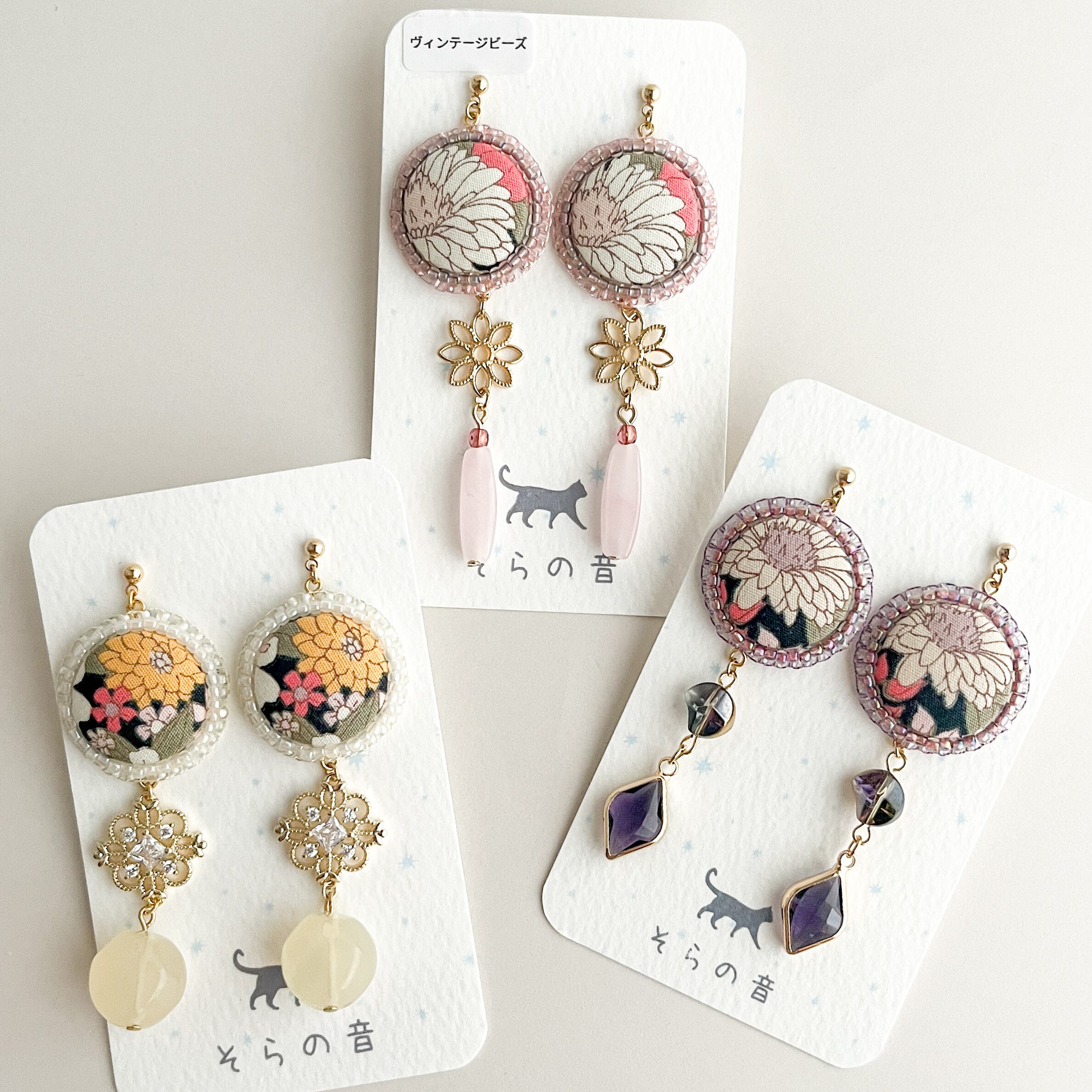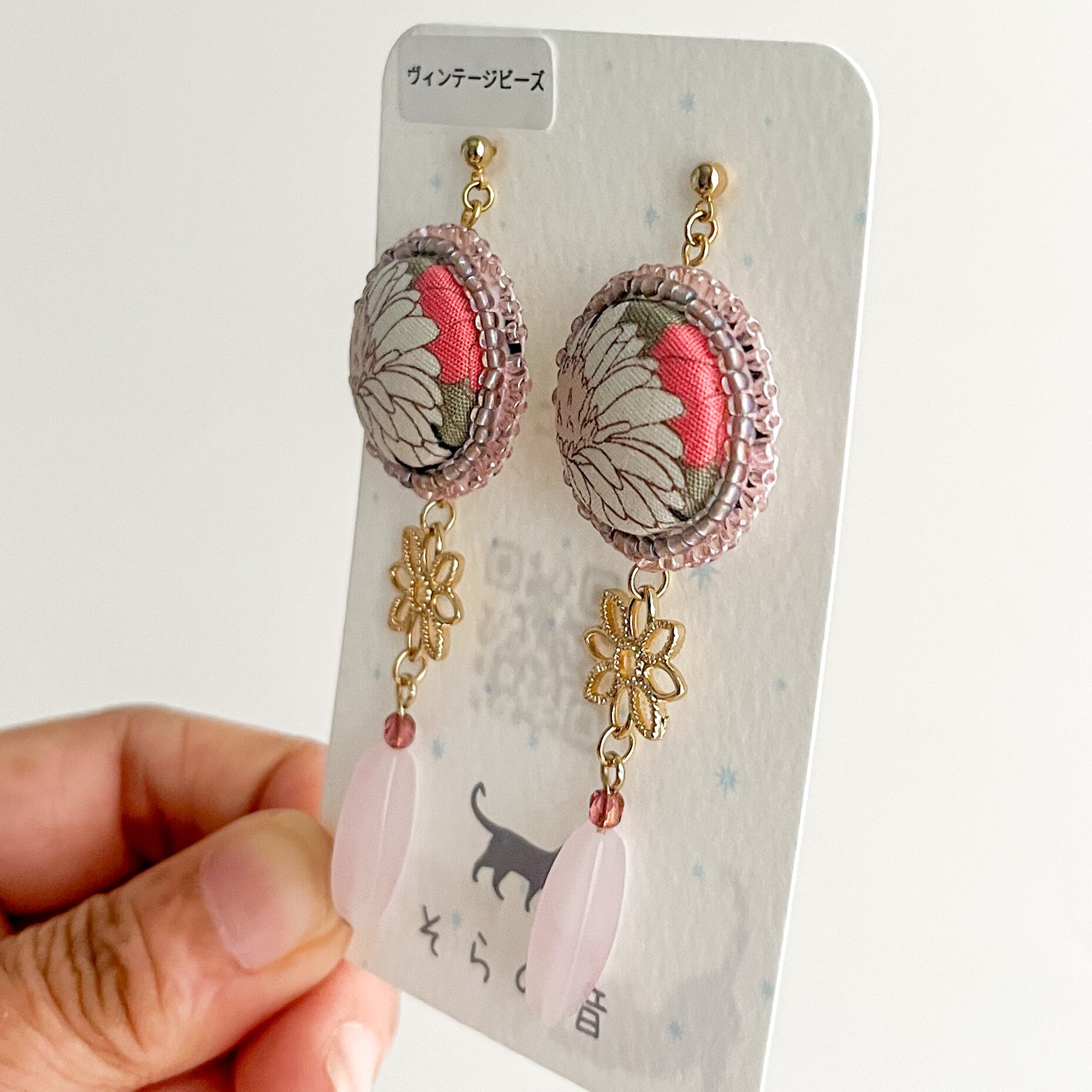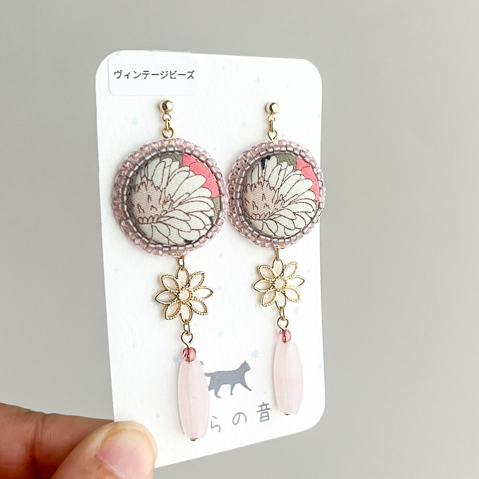 レトロな雰囲気の花のくるみボタンとヴィンテージビーズの耳飾り