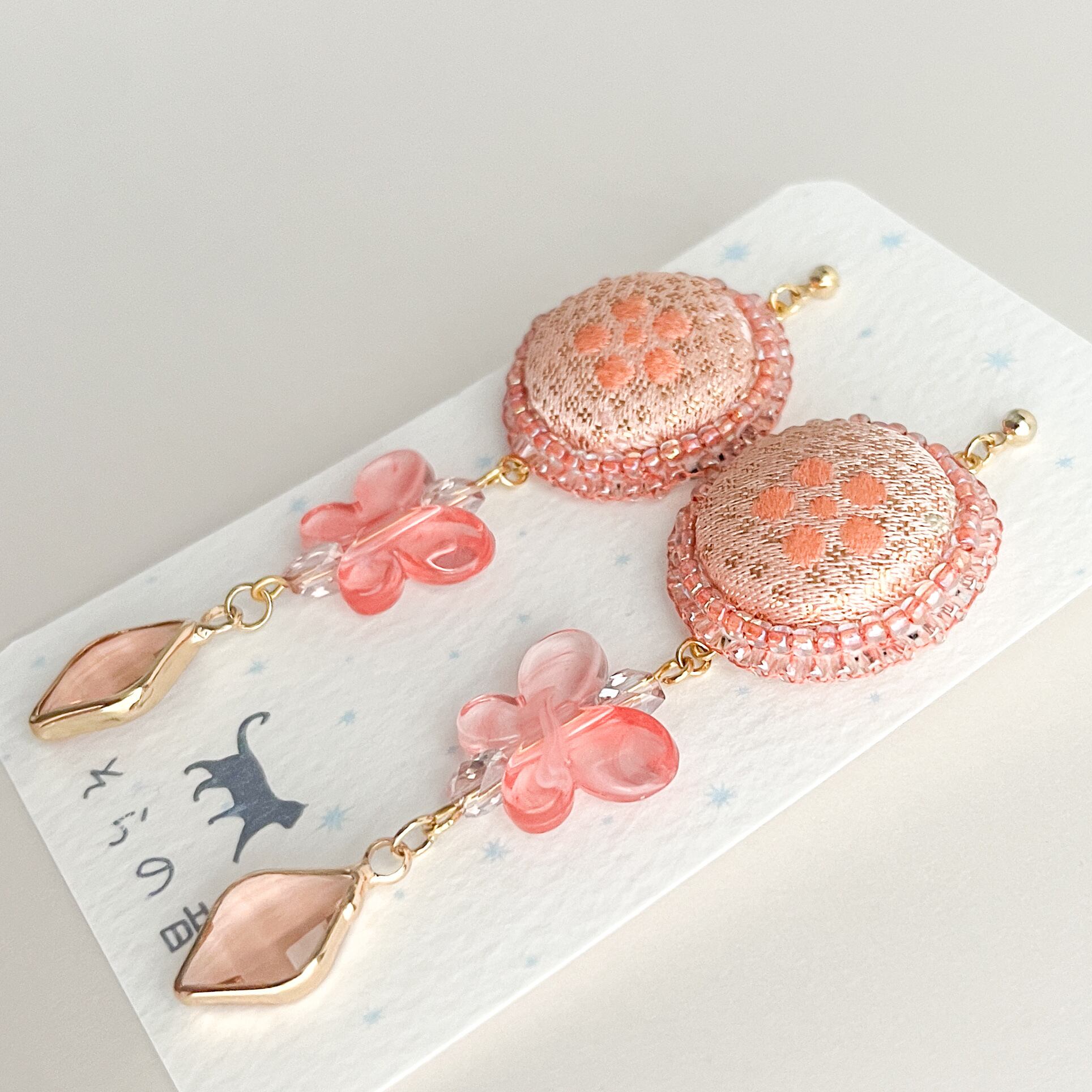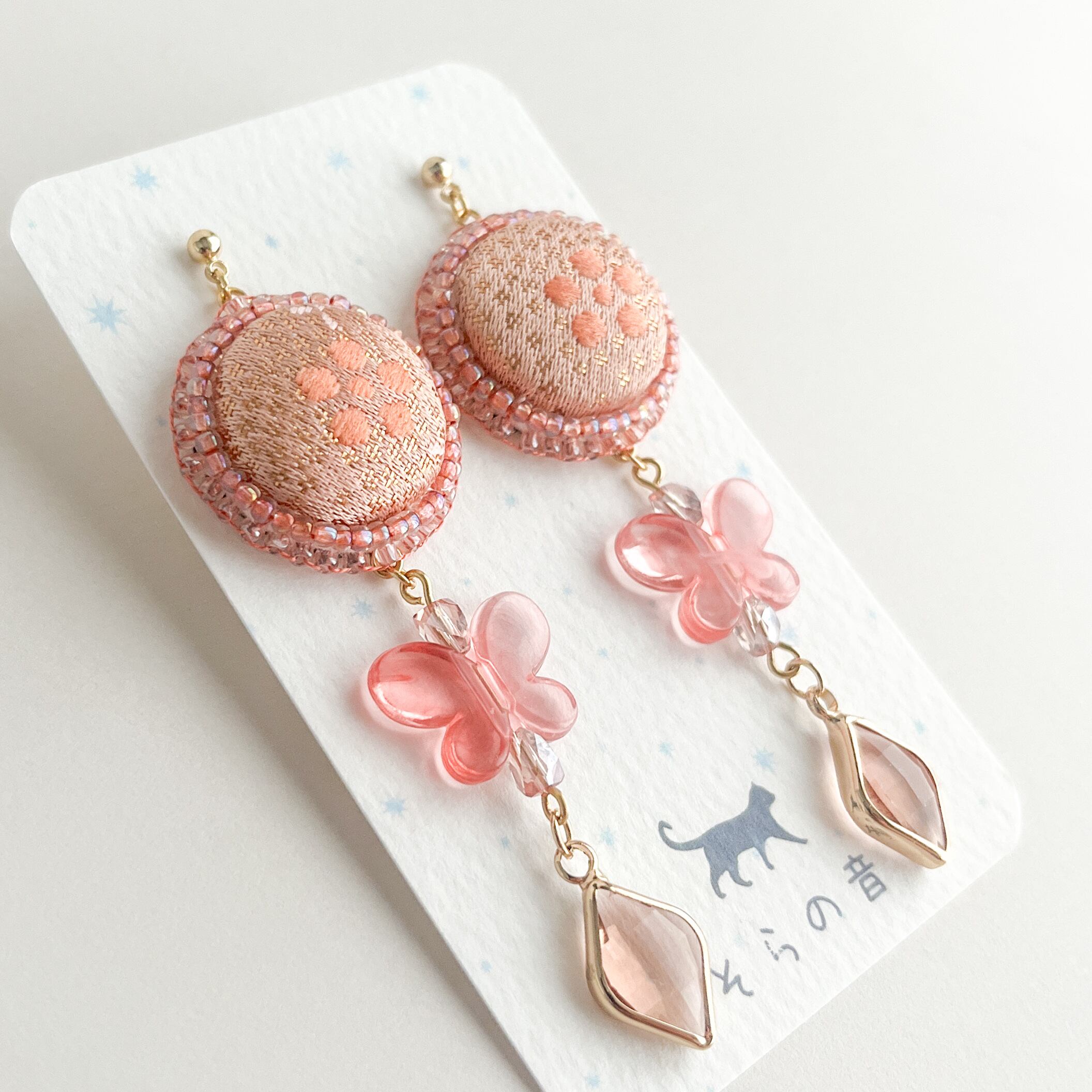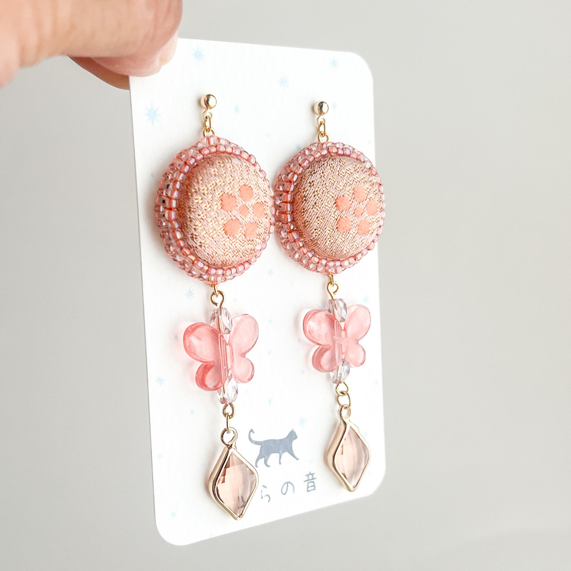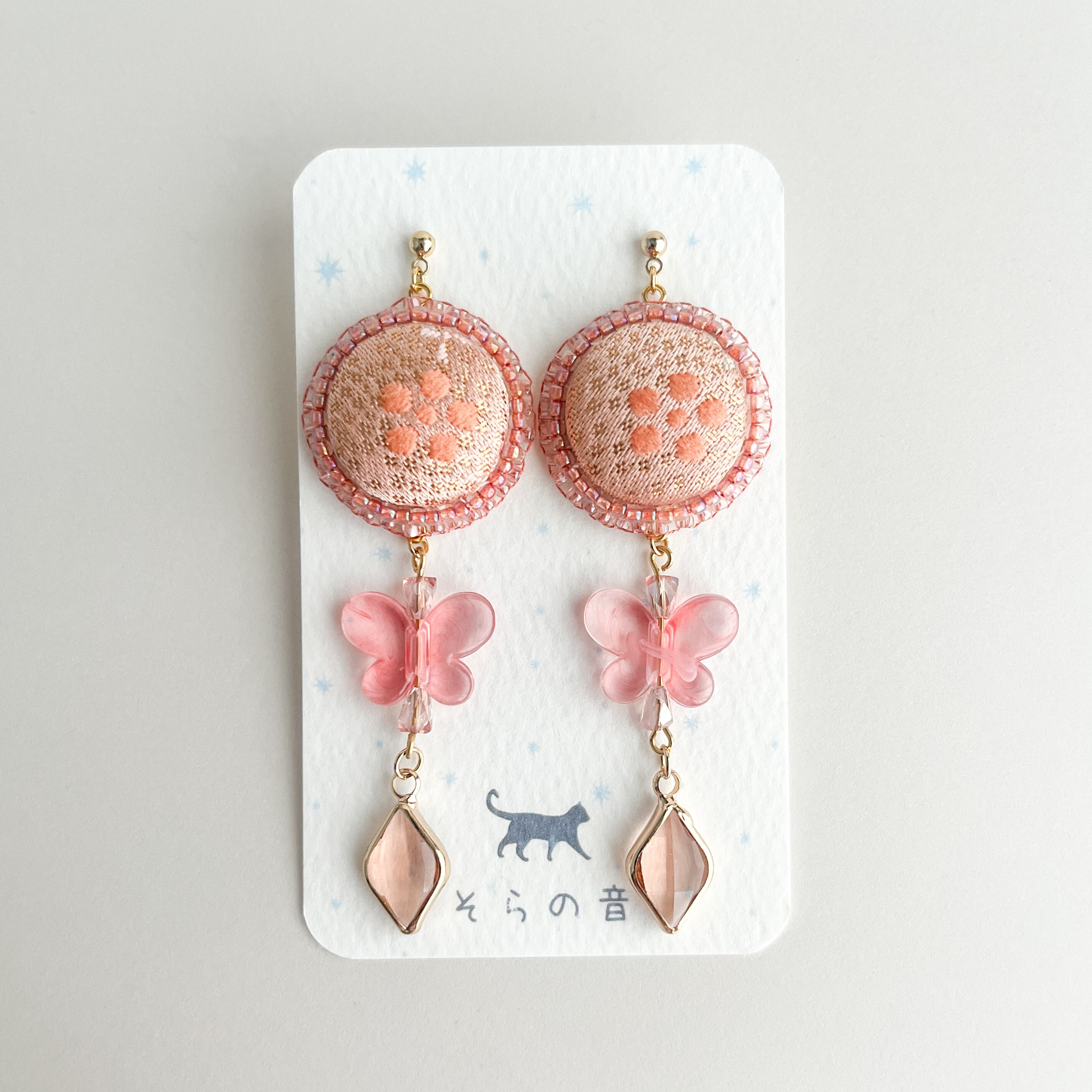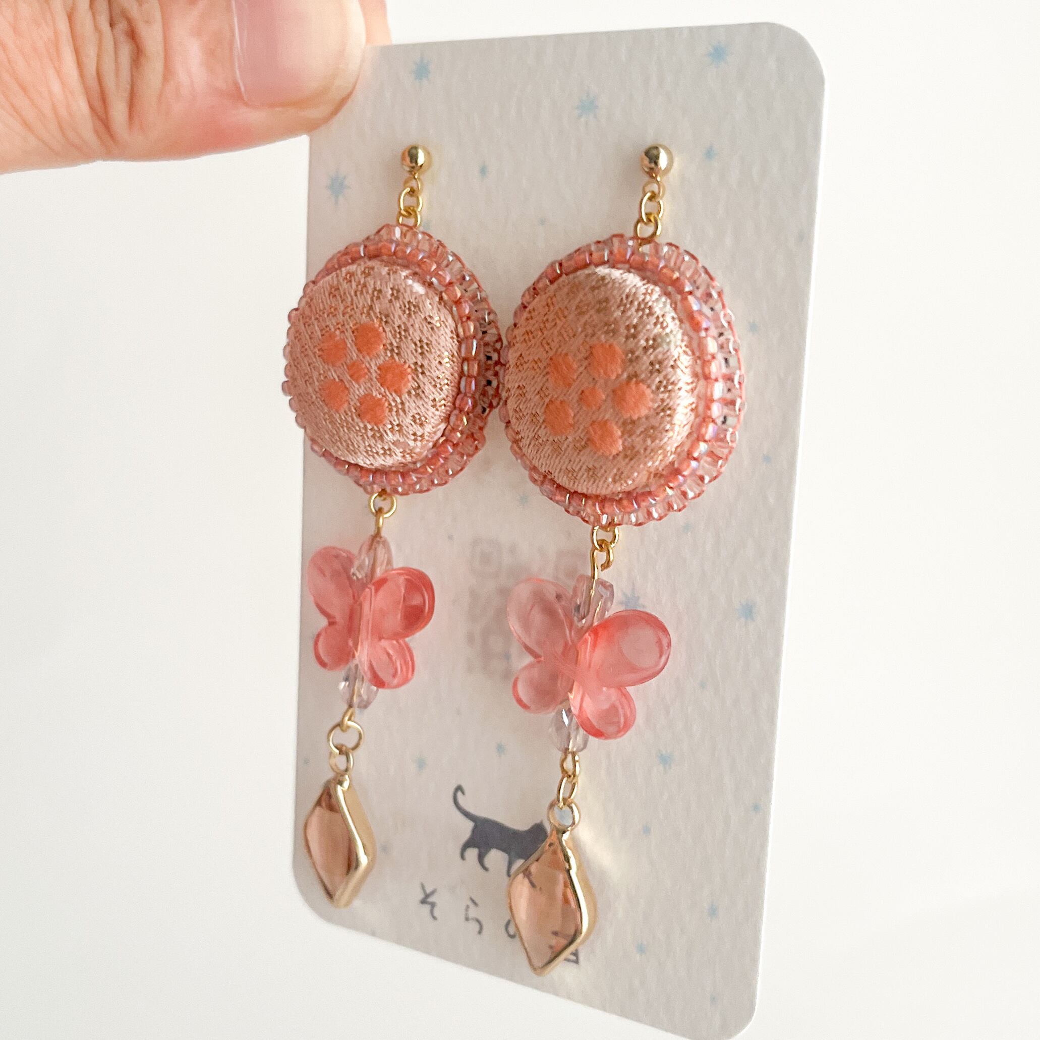 【金襴】星梅鉢のくるみボタンと蝶の耳飾り(ピンク)