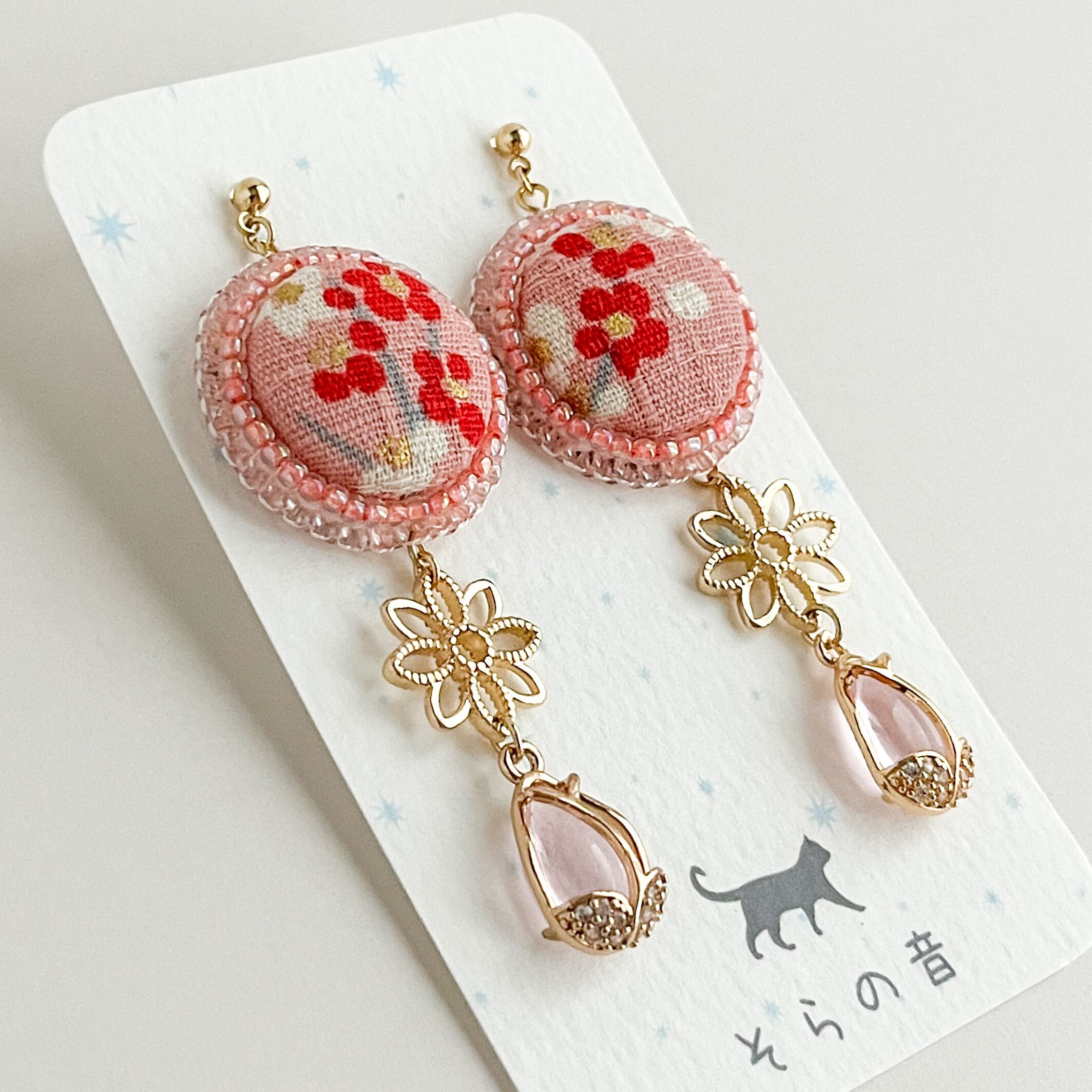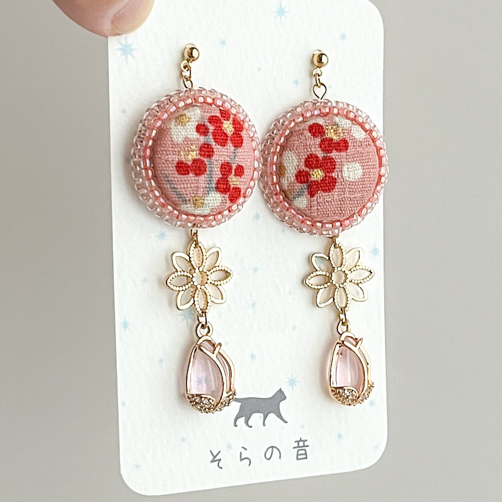 梅と花チャームの耳飾り・ピンク【くるみボタン】